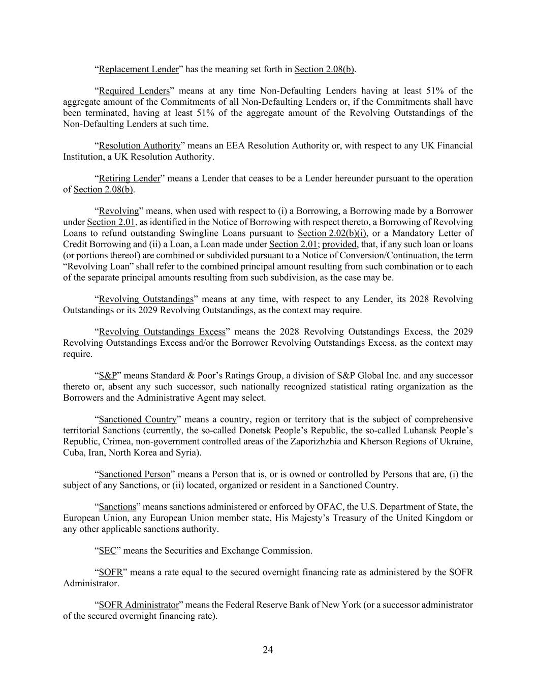 24 “Replacement Lender” has the meaning set forth in Section 2.08(b). “Required Lenders” means at any time Non-Defaulting Lenders having at least 51% of the aggregate amount of the Commitments of all Non-Defaulting Lenders or, if the Commitments shall have been terminated, having at least 51% of the aggregate amount of the Revolving Outstandings of the Non-Defaulting Lenders at such time. “Resolution Authority” means an EEA Resolution Authority or, with respect to any UK Financial Institution, a UK Resolution Authority. “Retiring Lender” means a Lender that ceases to be a Lender hereunder pursuant to the operation of Section 2.08(b). “Revolving” means, when used with respect to (i) a Borrowing, a Borrowing made by a Borrower under Section 2.01, as identified in the Notice of Borrowing with respect thereto, a Borrowing of Revolving Loans to refund outstanding Swingline Loans pursuant to Section 2.02(b)(i), or a Mandatory Letter of Credit Borrowing and (ii) a Loan, a Loan made under Section 2.01; provided, that, if any such loan or loans (or portions thereof) are combined or subdivided pursuant to a Notice of Conversion/Continuation, the term “Revolving Loan” shall refer to the combined principal amount resulting from such combination or to each of the separate principal amounts resulting from such subdivision, as the case may be. “Revolving Outstandings” means at any time, with respect to any Lender, its 2028 Revolving Outstandings or its 2029 Revolving Outstandings, as the context may require. “Revolving Outstandings Excess” means the 2028 Revolving Outstandings Excess, the 2029 Revolving Outstandings Excess and/or the Borrower Revolving Outstandings Excess, as the context may require. “S&P” means Standard & Poor’s Ratings Group, a division of S&P Global Inc. and any successor thereto or, absent any such successor, such nationally recognized statistical rating organization as the Borrowers and the Administrative Agent may select. “Sanctioned Country” means a country, region or territory that is the subject of comprehensive territorial Sanctions (currently, the so-called Donetsk People’s Republic, the so-called Luhansk People’s Republic, Crimea, non-government controlled areas of the Zaporizhzhia and Kherson Regions of Ukraine, Cuba, Iran, North Korea and Syria). “Sanctioned Person” means a Person that is, or is owned or controlled by Persons that are, (i) the subject of any Sanctions, or (ii) located, organized or resident in a Sanctioned Country. “Sanctions” means sanctions administered or enforced by OFAC, the U.S. Department of State, the European Union, any European Union member state, His Majesty’s Treasury of the United Kingdom or any other applicable sanctions authority. “SEC” means the Securities and Exchange Commission. “SOFR” means a rate equal to the secured overnight financing rate as administered by the SOFR Administrator. “SOFR Administrator” means the Federal Reserve Bank of New York (or a successor administrator of the secured overnight financing rate).