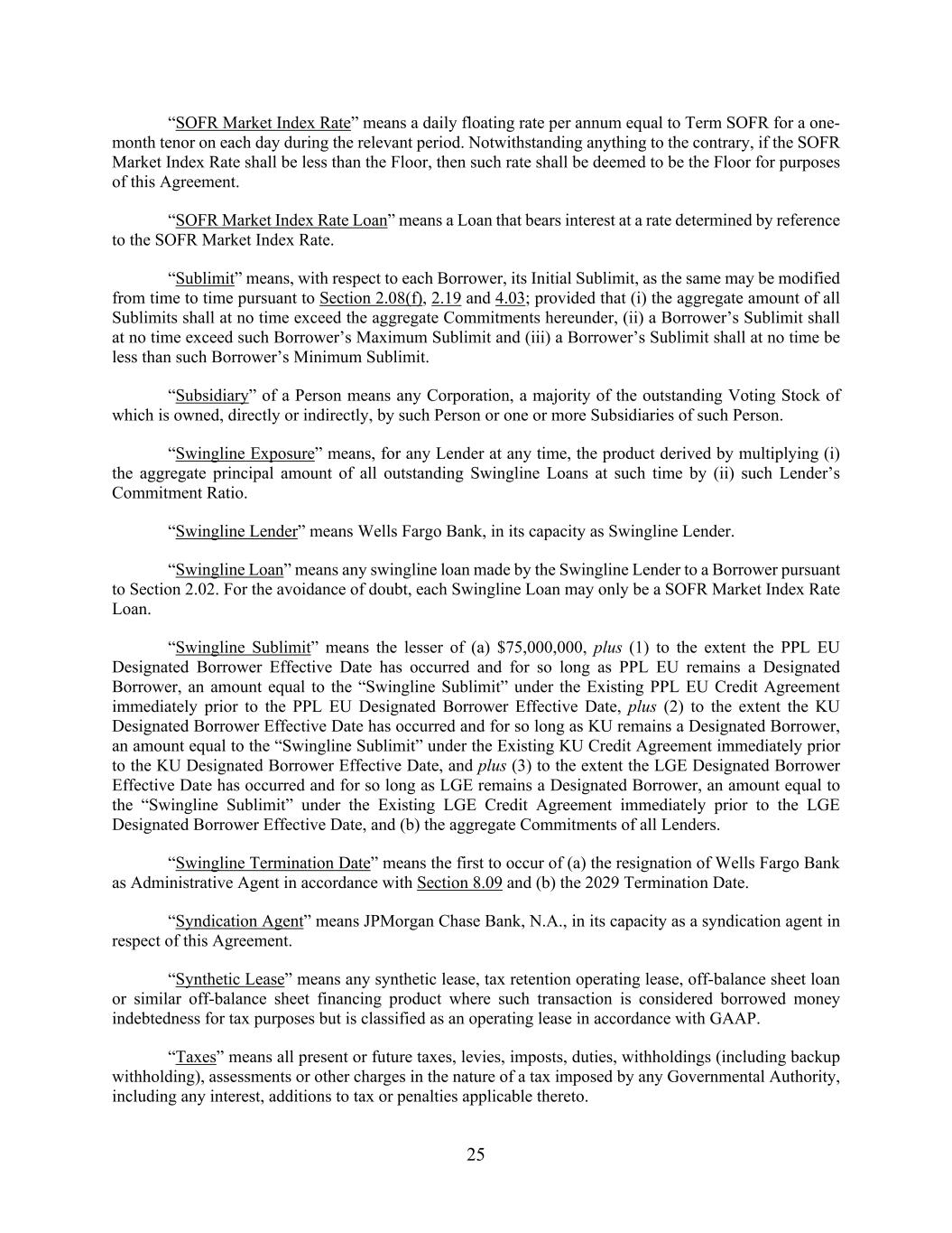 25 “SOFR Market Index Rate” means a daily floating rate per annum equal to Term SOFR for a one- month tenor on each day during the relevant period. Notwithstanding anything to the contrary, if the SOFR Market Index Rate shall be less than the Floor, then such rate shall be deemed to be the Floor for purposes of this Agreement. “SOFR Market Index Rate Loan” means a Loan that bears interest at a rate determined by reference to the SOFR Market Index Rate. “Sublimit” means, with respect to each Borrower, its Initial Sublimit, as the same may be modified from time to time pursuant to Section 2.08(f), 2.19 and 4.03; provided that (i) the aggregate amount of all Sublimits shall at no time exceed the aggregate Commitments hereunder, (ii) a Borrower’s Sublimit shall at no time exceed such Borrower’s Maximum Sublimit and (iii) a Borrower’s Sublimit shall at no time be less than such Borrower’s Minimum Sublimit. “Subsidiary” of a Person means any Corporation, a majority of the outstanding Voting Stock of which is owned, directly or indirectly, by such Person or one or more Subsidiaries of such Person. “Swingline Exposure” means, for any Lender at any time, the product derived by multiplying (i) the aggregate principal amount of all outstanding Swingline Loans at such time by (ii) such Lender’s Commitment Ratio. “Swingline Lender” means Wells Fargo Bank, in its capacity as Swingline Lender. “Swingline Loan” means any swingline loan made by the Swingline Lender to a Borrower pursuant to Section 2.02. For the avoidance of doubt, each Swingline Loan may only be a SOFR Market Index Rate Loan. “Swingline Sublimit” means the lesser of (a) $75,000,000, plus (1) to the extent the PPL EU Designated Borrower Effective Date has occurred and for so long as PPL EU remains a Designated Borrower, an amount equal to the “Swingline Sublimit” under the Existing PPL EU Credit Agreement immediately prior to the PPL EU Designated Borrower Effective Date, plus (2) to the extent the KU Designated Borrower Effective Date has occurred and for so long as KU remains a Designated Borrower, an amount equal to the “Swingline Sublimit” under the Existing KU Credit Agreement immediately prior to the KU Designated Borrower Effective Date, and plus (3) to the extent the LGE Designated Borrower Effective Date has occurred and for so long as LGE remains a Designated Borrower, an amount equal to the “Swingline Sublimit” under the Existing LGE Credit Agreement immediately prior to the LGE Designated Borrower Effective Date, and (b) the aggregate Commitments of all Lenders. “Swingline Termination Date” means the first to occur of (a) the resignation of Wells Fargo Bank as Administrative Agent in accordance with Section 8.09 and (b) the 2029 Termination Date. “Syndication Agent” means JPMorgan Chase Bank, N.A., in its capacity as a syndication agent in respect of this Agreement. “Synthetic Lease” means any synthetic lease, tax retention operating lease, off-balance sheet loan or similar off-balance sheet financing product where such transaction is considered borrowed money indebtedness for tax purposes but is classified as an operating lease in accordance with GAAP. “Taxes” means all present or future taxes, levies, imposts, duties, withholdings (including backup withholding), assessments or other charges in the nature of a tax imposed by any Governmental Authority, including any interest, additions to tax or penalties applicable thereto.