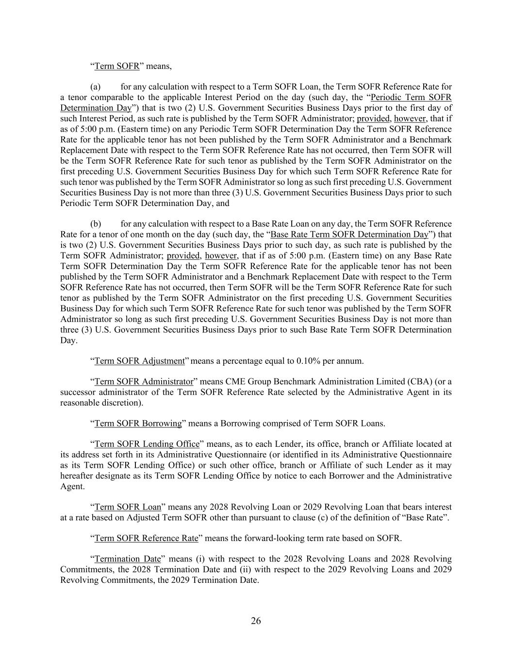 26 “Term SOFR” means, (a) for any calculation with respect to a Term SOFR Loan, the Term SOFR Reference Rate for a tenor comparable to the applicable Interest Period on the day (such day, the “Periodic Term SOFR Determination Day”) that is two (2) U.S. Government Securities Business Days prior to the first day of such Interest Period, as such rate is published by the Term SOFR Administrator; provided, however, that if as of 5:00 p.m. (Eastern time) on any Periodic Term SOFR Determination Day the Term SOFR Reference Rate for the applicable tenor has not been published by the Term SOFR Administrator and a Benchmark Replacement Date with respect to the Term SOFR Reference Rate has not occurred, then Term SOFR will be the Term SOFR Reference Rate for such tenor as published by the Term SOFR Administrator on the first preceding U.S. Government Securities Business Day for which such Term SOFR Reference Rate for such tenor was published by the Term SOFR Administrator so long as such first preceding U.S. Government Securities Business Day is not more than three (3) U.S. Government Securities Business Days prior to such Periodic Term SOFR Determination Day, and (b) for any calculation with respect to a Base Rate Loan on any day, the Term SOFR Reference Rate for a tenor of one month on the day (such day, the “Base Rate Term SOFR Determination Day”) that is two (2) U.S. Government Securities Business Days prior to such day, as such rate is published by the Term SOFR Administrator; provided, however, that if as of 5:00 p.m. (Eastern time) on any Base Rate Term SOFR Determination Day the Term SOFR Reference Rate for the applicable tenor has not been published by the Term SOFR Administrator and a Benchmark Replacement Date with respect to the Term SOFR Reference Rate has not occurred, then Term SOFR will be the Term SOFR Reference Rate for such tenor as published by the Term SOFR Administrator on the first preceding U.S. Government Securities Business Day for which such Term SOFR Reference Rate for such tenor was published by the Term SOFR Administrator so long as such first preceding U.S. Government Securities Business Day is not more than three (3) U.S. Government Securities Business Days prior to such Base Rate Term SOFR Determination Day. “Term SOFR Adjustment” means a percentage equal to 0.10% per annum. “Term SOFR Administrator” means CME Group Benchmark Administration Limited (CBA) (or a successor administrator of the Term SOFR Reference Rate selected by the Administrative Agent in its reasonable discretion). “Term SOFR Borrowing” means a Borrowing comprised of Term SOFR Loans. “Term SOFR Lending Office” means, as to each Lender, its office, branch or Affiliate located at its address set forth in its Administrative Questionnaire (or identified in its Administrative Questionnaire as its Term SOFR Lending Office) or such other office, branch or Affiliate of such Lender as it may hereafter designate as its Term SOFR Lending Office by notice to each Borrower and the Administrative Agent. “Term SOFR Loan” means any 2028 Revolving Loan or 2029 Revolving Loan that bears interest at a rate based on Adjusted Term SOFR other than pursuant to clause (c) of the definition of “Base Rate”. “Term SOFR Reference Rate” means the forward-looking term rate based on SOFR. “Termination Date” means (i) with respect to the 2028 Revolving Loans and 2028 Revolving Commitments, the 2028 Termination Date and (ii) with respect to the 2029 Revolving Loans and 2029 Revolving Commitments, the 2029 Termination Date.