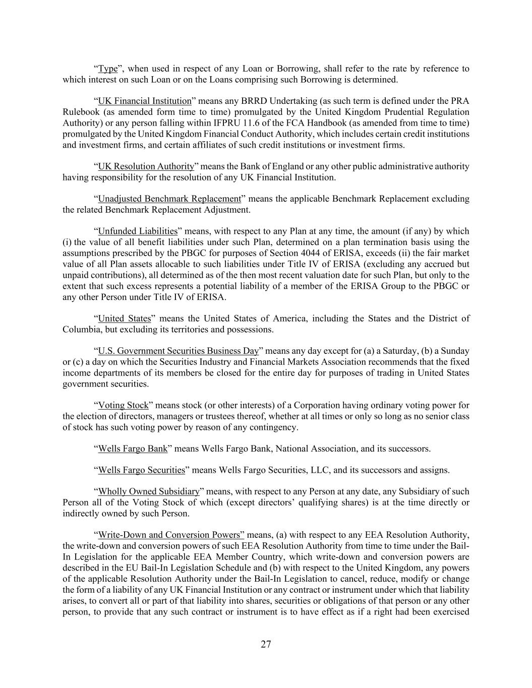 27 “Type”, when used in respect of any Loan or Borrowing, shall refer to the rate by reference to which interest on such Loan or on the Loans comprising such Borrowing is determined. “UK Financial Institution” means any BRRD Undertaking (as such term is defined under the PRA Rulebook (as amended form time to time) promulgated by the United Kingdom Prudential Regulation Authority) or any person falling within IFPRU 11.6 of the FCA Handbook (as amended from time to time) promulgated by the United Kingdom Financial Conduct Authority, which includes certain credit institutions and investment firms, and certain affiliates of such credit institutions or investment firms. “UK Resolution Authority” means the Bank of England or any other public administrative authority having responsibility for the resolution of any UK Financial Institution. “Unadjusted Benchmark Replacement” means the applicable Benchmark Replacement excluding the related Benchmark Replacement Adjustment. “Unfunded Liabilities” means, with respect to any Plan at any time, the amount (if any) by which (i) the value of all benefit liabilities under such Plan, determined on a plan termination basis using the assumptions prescribed by the PBGC for purposes of Section 4044 of ERISA, exceeds (ii) the fair market value of all Plan assets allocable to such liabilities under Title IV of ERISA (excluding any accrued but unpaid contributions), all determined as of the then most recent valuation date for such Plan, but only to the extent that such excess represents a potential liability of a member of the ERISA Group to the PBGC or any other Person under Title IV of ERISA. “United States” means the United States of America, including the States and the District of Columbia, but excluding its territories and possessions. “U.S. Government Securities Business Day” means any day except for (a) a Saturday, (b) a Sunday or (c) a day on which the Securities Industry and Financial Markets Association recommends that the fixed income departments of its members be closed for the entire day for purposes of trading in United States government securities. “Voting Stock” means stock (or other interests) of a Corporation having ordinary voting power for the election of directors, managers or trustees thereof, whether at all times or only so long as no senior class of stock has such voting power by reason of any contingency. “Wells Fargo Bank” means Wells Fargo Bank, National Association, and its successors. “Wells Fargo Securities” means Wells Fargo Securities, LLC, and its successors and assigns. “Wholly Owned Subsidiary” means, with respect to any Person at any date, any Subsidiary of such Person all of the Voting Stock of which (except directors’ qualifying shares) is at the time directly or indirectly owned by such Person. “Write-Down and Conversion Powers” means, (a) with respect to any EEA Resolution Authority, the write-down and conversion powers of such EEA Resolution Authority from time to time under the Bail- In Legislation for the applicable EEA Member Country, which write-down and conversion powers are described in the EU Bail-In Legislation Schedule and (b) with respect to the United Kingdom, any powers of the applicable Resolution Authority under the Bail-In Legislation to cancel, reduce, modify or change the form of a liability of any UK Financial Institution or any contract or instrument under which that liability arises, to convert all or part of that liability into shares, securities or obligations of that person or any other person, to provide that any such contract or instrument is to have effect as if a right had been exercised