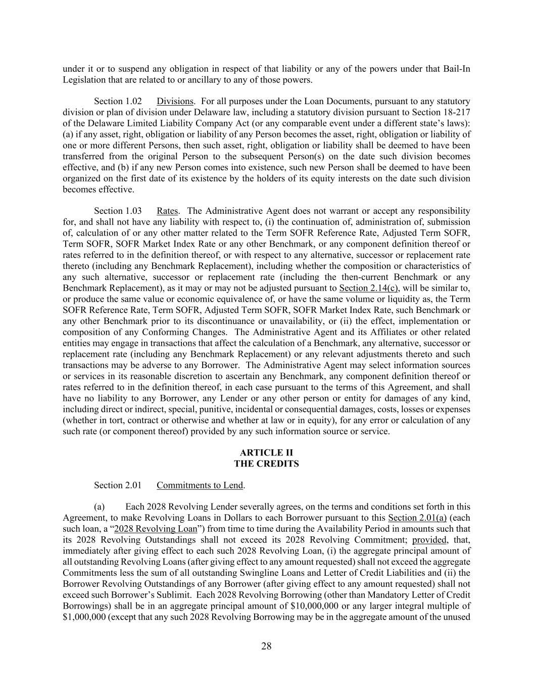 28 under it or to suspend any obligation in respect of that liability or any of the powers under that Bail-In Legislation that are related to or ancillary to any of those powers. Section 1.02 Divisions. For all purposes under the Loan Documents, pursuant to any statutory division or plan of division under Delaware law, including a statutory division pursuant to Section 18-217 of the Delaware Limited Liability Company Act (or any comparable event under a different state’s laws): (a) if any asset, right, obligation or liability of any Person becomes the asset, right, obligation or liability of one or more different Persons, then such asset, right, obligation or liability shall be deemed to have been transferred from the original Person to the subsequent Person(s) on the date such division becomes effective, and (b) if any new Person comes into existence, such new Person shall be deemed to have been organized on the first date of its existence by the holders of its equity interests on the date such division becomes effective. Section 1.03 Rates. The Administrative Agent does not warrant or accept any responsibility for, and shall not have any liability with respect to, (i) the continuation of, administration of, submission of, calculation of or any other matter related to the Term SOFR Reference Rate, Adjusted Term SOFR, Term SOFR, SOFR Market Index Rate or any other Benchmark, or any component definition thereof or rates referred to in the definition thereof, or with respect to any alternative, successor or replacement rate thereto (including any Benchmark Replacement), including whether the composition or characteristics of any such alternative, successor or replacement rate (including the then-current Benchmark or any Benchmark Replacement), as it may or may not be adjusted pursuant to Section 2.14(c), will be similar to, or produce the same value or economic equivalence of, or have the same volume or liquidity as, the Term SOFR Reference Rate, Term SOFR, Adjusted Term SOFR, SOFR Market Index Rate, such Benchmark or any other Benchmark prior to its discontinuance or unavailability, or (ii) the effect, implementation or composition of any Conforming Changes. The Administrative Agent and its Affiliates or other related entities may engage in transactions that affect the calculation of a Benchmark, any alternative, successor or replacement rate (including any Benchmark Replacement) or any relevant adjustments thereto and such transactions may be adverse to any Borrower. The Administrative Agent may select information sources or services in its reasonable discretion to ascertain any Benchmark, any component definition thereof or rates referred to in the definition thereof, in each case pursuant to the terms of this Agreement, and shall have no liability to any Borrower, any Lender or any other person or entity for damages of any kind, including direct or indirect, special, punitive, incidental or consequential damages, costs, losses or expenses (whether in tort, contract or otherwise and whether at law or in equity), for any error or calculation of any such rate (or component thereof) provided by any such information source or service. ARTICLE II THE CREDITS Section 2.01 Commitments to Lend. (a) Each 2028 Revolving Lender severally agrees, on the terms and conditions set forth in this Agreement, to make Revolving Loans in Dollars to each Borrower pursuant to this Section 2.01(a) (each such loan, a “2028 Revolving Loan”) from time to time during the Availability Period in amounts such that its 2028 Revolving Outstandings shall not exceed its 2028 Revolving Commitment; provided, that, immediately after giving effect to each such 2028 Revolving Loan, (i) the aggregate principal amount of all outstanding Revolving Loans (after giving effect to any amount requested) shall not exceed the aggregate Commitments less the sum of all outstanding Swingline Loans and Letter of Credit Liabilities and (ii) the Borrower Revolving Outstandings of any Borrower (after giving effect to any amount requested) shall not exceed such Borrower’s Sublimit. Each 2028 Revolving Borrowing (other than Mandatory Letter of Credit Borrowings) shall be in an aggregate principal amount of $10,000,000 or any larger integral multiple of $1,000,000 (except that any such 2028 Revolving Borrowing may be in the aggregate amount of the unused
