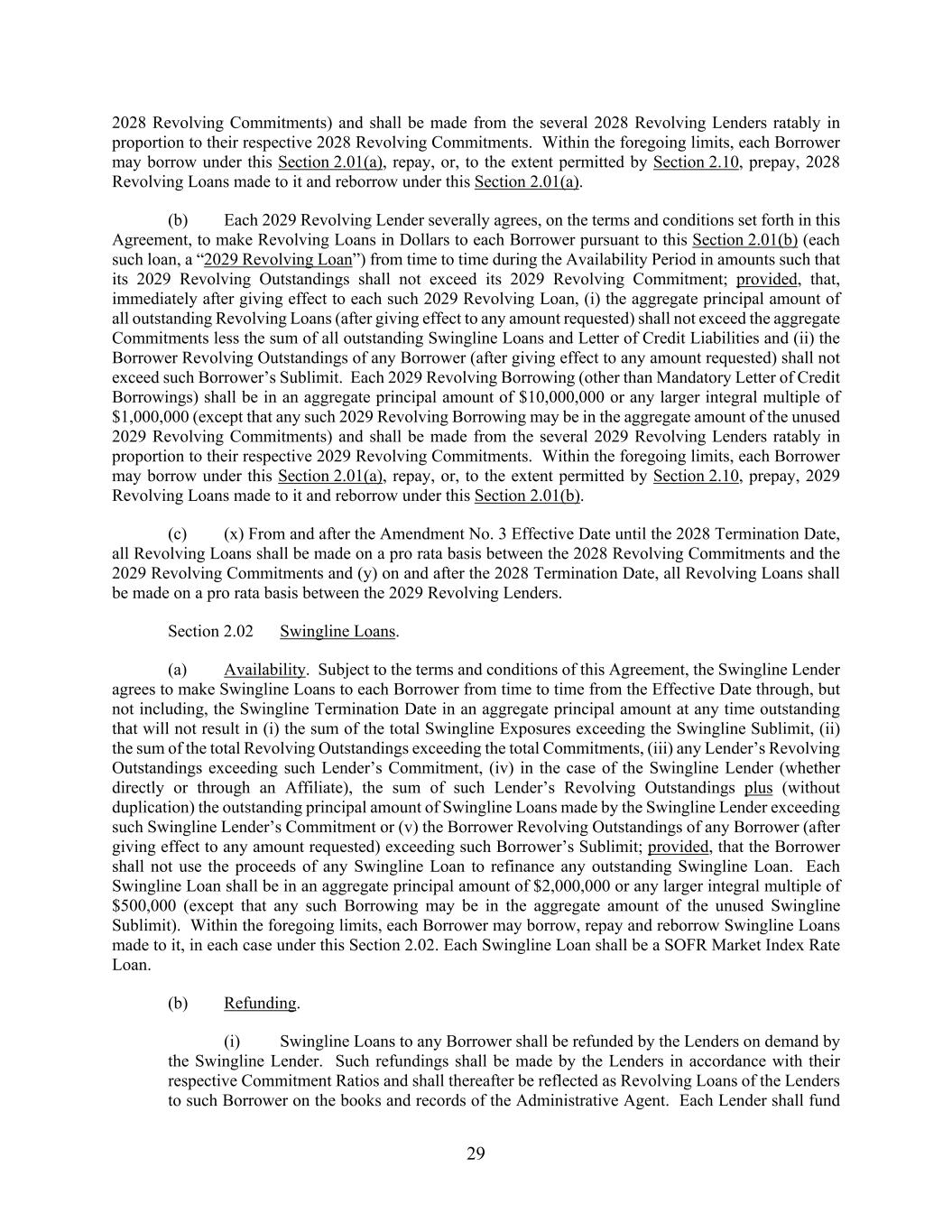 29 2028 Revolving Commitments) and shall be made from the several 2028 Revolving Lenders ratably in proportion to their respective 2028 Revolving Commitments. Within the foregoing limits, each Borrower may borrow under this Section 2.01(a), repay, or, to the extent permitted by Section 2.10, prepay, 2028 Revolving Loans made to it and reborrow under this Section 2.01(a). (b) Each 2029 Revolving Lender severally agrees, on the terms and conditions set forth in this Agreement, to make Revolving Loans in Dollars to each Borrower pursuant to this Section 2.01(b) (each such loan, a “2029 Revolving Loan”) from time to time during the Availability Period in amounts such that its 2029 Revolving Outstandings shall not exceed its 2029 Revolving Commitment; provided, that, immediately after giving effect to each such 2029 Revolving Loan, (i) the aggregate principal amount of all outstanding Revolving Loans (after giving effect to any amount requested) shall not exceed the aggregate Commitments less the sum of all outstanding Swingline Loans and Letter of Credit Liabilities and (ii) the Borrower Revolving Outstandings of any Borrower (after giving effect to any amount requested) shall not exceed such Borrower’s Sublimit. Each 2029 Revolving Borrowing (other than Mandatory Letter of Credit Borrowings) shall be in an aggregate principal amount of $10,000,000 or any larger integral multiple of $1,000,000 (except that any such 2029 Revolving Borrowing may be in the aggregate amount of the unused 2029 Revolving Commitments) and shall be made from the several 2029 Revolving Lenders ratably in proportion to their respective 2029 Revolving Commitments. Within the foregoing limits, each Borrower may borrow under this Section 2.01(a), repay, or, to the extent permitted by Section 2.10, prepay, 2029 Revolving Loans made to it and reborrow under this Section 2.01(b). (c) (x) From and after the Amendment No. 3 Effective Date until the 2028 Termination Date, all Revolving Loans shall be made on a pro rata basis between the 2028 Revolving Commitments and the 2029 Revolving Commitments and (y) on and after the 2028 Termination Date, all Revolving Loans shall be made on a pro rata basis between the 2029 Revolving Lenders. Section 2.02 Swingline Loans. (a) Availability. Subject to the terms and conditions of this Agreement, the Swingline Lender agrees to make Swingline Loans to each Borrower from time to time from the Effective Date through, but not including, the Swingline Termination Date in an aggregate principal amount at any time outstanding that will not result in (i) the sum of the total Swingline Exposures exceeding the Swingline Sublimit, (ii) the sum of the total Revolving Outstandings exceeding the total Commitments, (iii) any Lender’s Revolving Outstandings exceeding such Lender’s Commitment, (iv) in the case of the Swingline Lender (whether directly or through an Affiliate), the sum of such Lender’s Revolving Outstandings plus (without duplication) the outstanding principal amount of Swingline Loans made by the Swingline Lender exceeding such Swingline Lender’s Commitment or (v) the Borrower Revolving Outstandings of any Borrower (after giving effect to any amount requested) exceeding such Borrower’s Sublimit; provided, that the Borrower shall not use the proceeds of any Swingline Loan to refinance any outstanding Swingline Loan. Each Swingline Loan shall be in an aggregate principal amount of $2,000,000 or any larger integral multiple of $500,000 (except that any such Borrowing may be in the aggregate amount of the unused Swingline Sublimit). Within the foregoing limits, each Borrower may borrow, repay and reborrow Swingline Loans made to it, in each case under this Section 2.02. Each Swingline Loan shall be a SOFR Market Index Rate Loan. (b) Refunding. (i) Swingline Loans to any Borrower shall be refunded by the Lenders on demand by the Swingline Lender. Such refundings shall be made by the Lenders in accordance with their respective Commitment Ratios and shall thereafter be reflected as Revolving Loans of the Lenders to such Borrower on the books and records of the Administrative Agent. Each Lender shall fund