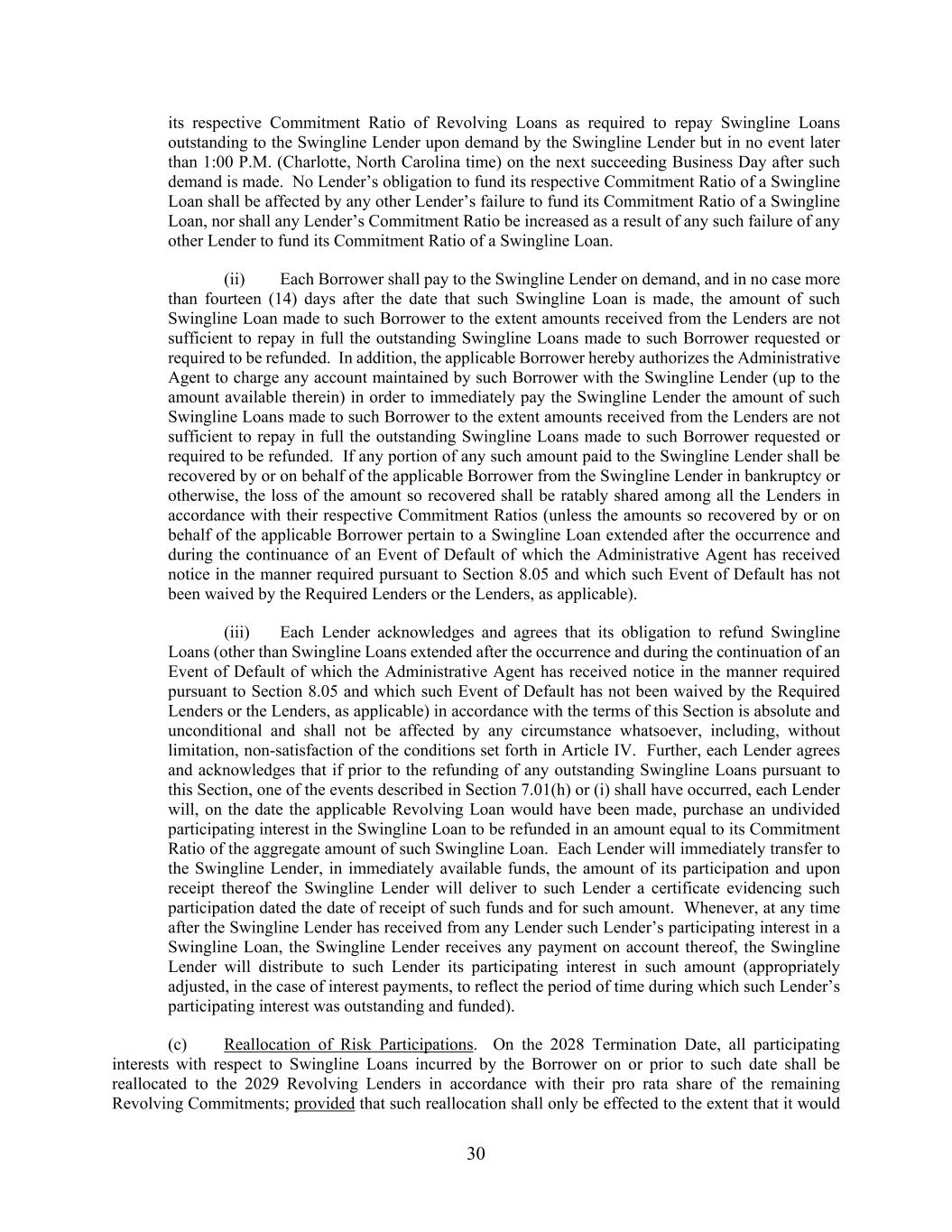 30 its respective Commitment Ratio of Revolving Loans as required to repay Swingline Loans outstanding to the Swingline Lender upon demand by the Swingline Lender but in no event later than 1:00 P.M. (Charlotte, North Carolina time) on the next succeeding Business Day after such demand is made. No Lender’s obligation to fund its respective Commitment Ratio of a Swingline Loan shall be affected by any other Lender’s failure to fund its Commitment Ratio of a Swingline Loan, nor shall any Lender’s Commitment Ratio be increased as a result of any such failure of any other Lender to fund its Commitment Ratio of a Swingline Loan. (ii) Each Borrower shall pay to the Swingline Lender on demand, and in no case more than fourteen (14) days after the date that such Swingline Loan is made, the amount of such Swingline Loan made to such Borrower to the extent amounts received from the Lenders are not sufficient to repay in full the outstanding Swingline Loans made to such Borrower requested or required to be refunded. In addition, the applicable Borrower hereby authorizes the Administrative Agent to charge any account maintained by such Borrower with the Swingline Lender (up to the amount available therein) in order to immediately pay the Swingline Lender the amount of such Swingline Loans made to such Borrower to the extent amounts received from the Lenders are not sufficient to repay in full the outstanding Swingline Loans made to such Borrower requested or required to be refunded. If any portion of any such amount paid to the Swingline Lender shall be recovered by or on behalf of the applicable Borrower from the Swingline Lender in bankruptcy or otherwise, the loss of the amount so recovered shall be ratably shared among all the Lenders in accordance with their respective Commitment Ratios (unless the amounts so recovered by or on behalf of the applicable Borrower pertain to a Swingline Loan extended after the occurrence and during the continuance of an Event of Default of which the Administrative Agent has received notice in the manner required pursuant to Section 8.05 and which such Event of Default has not been waived by the Required Lenders or the Lenders, as applicable). (iii) Each Lender acknowledges and agrees that its obligation to refund Swingline Loans (other than Swingline Loans extended after the occurrence and during the continuation of an Event of Default of which the Administrative Agent has received notice in the manner required pursuant to Section 8.05 and which such Event of Default has not been waived by the Required Lenders or the Lenders, as applicable) in accordance with the terms of this Section is absolute and unconditional and shall not be affected by any circumstance whatsoever, including, without limitation, non-satisfaction of the conditions set forth in Article IV. Further, each Lender agrees and acknowledges that if prior to the refunding of any outstanding Swingline Loans pursuant to this Section, one of the events described in Section 7.01(h) or (i) shall have occurred, each Lender will, on the date the applicable Revolving Loan would have been made, purchase an undivided participating interest in the Swingline Loan to be refunded in an amount equal to its Commitment Ratio of the aggregate amount of such Swingline Loan. Each Lender will immediately transfer to the Swingline Lender, in immediately available funds, the amount of its participation and upon receipt thereof the Swingline Lender will deliver to such Lender a certificate evidencing such participation dated the date of receipt of such funds and for such amount. Whenever, at any time after the Swingline Lender has received from any Lender such Lender’s participating interest in a Swingline Loan, the Swingline Lender receives any payment on account thereof, the Swingline Lender will distribute to such Lender its participating interest in such amount (appropriately adjusted, in the case of interest payments, to reflect the period of time during which such Lender’s participating interest was outstanding and funded). (c) Reallocation of Risk Participations. On the 2028 Termination Date, all participating interests with respect to Swingline Loans incurred by the Borrower on or prior to such date shall be reallocated to the 2029 Revolving Lenders in accordance with their pro rata share of the remaining Revolving Commitments; provided that such reallocation shall only be effected to the extent that it would