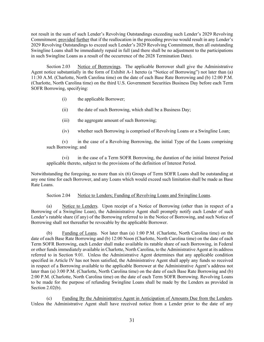 31 not result in the sum of such Lender’s Revolving Outstandings exceeding such Lender’s 2029 Revolving Commitment; provided further that if the reallocation in the preceding proviso would result in any Lender’s 2029 Revolving Outstandings to exceed such Lender’s 2029 Revolving Commitment, then all outstanding Swingline Loans shall be immediately repaid in full (and there shall be no adjustment to the participations in such Swingline Loans as a result of the occurrence of the 2028 Termination Date). Section 2.03 Notice of Borrowings. The applicable Borrower shall give the Administrative Agent notice substantially in the form of Exhibit A-1 hereto (a “Notice of Borrowing”) not later than (a) 11:30 A.M. (Charlotte, North Carolina time) on the date of each Base Rate Borrowing and (b) 12:00 P.M. (Charlotte, North Carolina time) on the third U.S. Government Securities Business Day before each Term SOFR Borrowing, specifying: (i) the applicable Borrower; (ii) the date of such Borrowing, which shall be a Business Day; (iii) the aggregate amount of such Borrowing; (iv) whether such Borrowing is comprised of Revolving Loans or a Swingline Loan; (v) in the case of a Revolving Borrowing, the initial Type of the Loans comprising such Borrowing; and (vi) in the case of a Term SOFR Borrowing, the duration of the initial Interest Period applicable thereto, subject to the provisions of the definition of Interest Period. Notwithstanding the foregoing, no more than six (6) Groups of Term SOFR Loans shall be outstanding at any one time for each Borrower, and any Loans which would exceed such limitation shall be made as Base Rate Loans. Section 2.04 Notice to Lenders; Funding of Revolving Loans and Swingline Loans. (a) Notice to Lenders. Upon receipt of a Notice of Borrowing (other than in respect of a Borrowing of a Swingline Loan), the Administrative Agent shall promptly notify each Lender of such Lender’s ratable share (if any) of the Borrowing referred to in the Notice of Borrowing, and such Notice of Borrowing shall not thereafter be revocable by the applicable Borrower. (b) Funding of Loans. Not later than (a) 1:00 P.M. (Charlotte, North Carolina time) on the date of each Base Rate Borrowing and (b) 12:00 Noon (Charlotte, North Carolina time) on the date of each Term SOFR Borrowing, each Lender shall make available its ratable share of such Borrowing, in Federal or other funds immediately available in Charlotte, North Carolina, to the Administrative Agent at its address referred to in Section 9.01. Unless the Administrative Agent determines that any applicable condition specified in Article IV has not been satisfied, the Administrative Agent shall apply any funds so received in respect of a Borrowing available to the applicable Borrower at the Administrative Agent’s address not later than (a) 3:00 P.M. (Charlotte, North Carolina time) on the date of each Base Rate Borrowing and (b) 2:00 P.M. (Charlotte, North Carolina time) on the date of each Term SOFR Borrowing. Revolving Loans to be made for the purpose of refunding Swingline Loans shall be made by the Lenders as provided in Section 2.02(b). (c) Funding By the Administrative Agent in Anticipation of Amounts Due from the Lenders. Unless the Administrative Agent shall have received notice from a Lender prior to the date of any