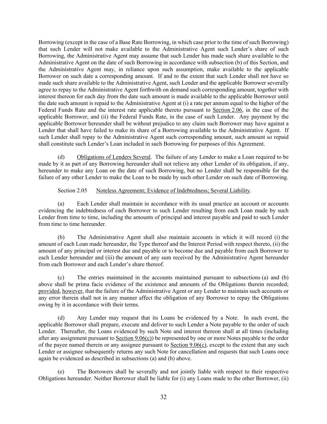 32 Borrowing (except in the case of a Base Rate Borrowing, in which case prior to the time of such Borrowing) that such Lender will not make available to the Administrative Agent such Lender’s share of such Borrowing, the Administrative Agent may assume that such Lender has made such share available to the Administrative Agent on the date of such Borrowing in accordance with subsection (b) of this Section, and the Administrative Agent may, in reliance upon such assumption, make available to the applicable Borrower on such date a corresponding amount. If and to the extent that such Lender shall not have so made such share available to the Administrative Agent, such Lender and the applicable Borrower severally agree to repay to the Administrative Agent forthwith on demand such corresponding amount, together with interest thereon for each day from the date such amount is made available to the applicable Borrower until the date such amount is repaid to the Administrative Agent at (i) a rate per annum equal to the higher of the Federal Funds Rate and the interest rate applicable thereto pursuant to Section 2.06, in the case of the applicable Borrower, and (ii) the Federal Funds Rate, in the case of such Lender. Any payment by the applicable Borrower hereunder shall be without prejudice to any claim such Borrower may have against a Lender that shall have failed to make its share of a Borrowing available to the Administrative Agent. If such Lender shall repay to the Administrative Agent such corresponding amount, such amount so repaid shall constitute such Lender’s Loan included in such Borrowing for purposes of this Agreement. (d) Obligations of Lenders Several. The failure of any Lender to make a Loan required to be made by it as part of any Borrowing hereunder shall not relieve any other Lender of its obligation, if any, hereunder to make any Loan on the date of such Borrowing, but no Lender shall be responsible for the failure of any other Lender to make the Loan to be made by such other Lender on such date of Borrowing. Section 2.05 Noteless Agreement; Evidence of Indebtedness; Several Liability. (a) Each Lender shall maintain in accordance with its usual practice an account or accounts evidencing the indebtedness of each Borrower to such Lender resulting from each Loan made by such Lender from time to time, including the amounts of principal and interest payable and paid to such Lender from time to time hereunder. (b) The Administrative Agent shall also maintain accounts in which it will record (i) the amount of each Loan made hereunder, the Type thereof and the Interest Period with respect thereto, (ii) the amount of any principal or interest due and payable or to become due and payable from each Borrower to each Lender hereunder and (iii) the amount of any sum received by the Administrative Agent hereunder from each Borrower and each Lender’s share thereof. (c) The entries maintained in the accounts maintained pursuant to subsections (a) and (b) above shall be prima facie evidence of the existence and amounts of the Obligations therein recorded; provided, however, that the failure of the Administrative Agent or any Lender to maintain such accounts or any error therein shall not in any manner affect the obligation of any Borrower to repay the Obligations owing by it in accordance with their terms. (d) Any Lender may request that its Loans be evidenced by a Note. In such event, the applicable Borrower shall prepare, execute and deliver to such Lender a Note payable to the order of such Lender. Thereafter, the Loans evidenced by such Note and interest thereon shall at all times (including after any assignment pursuant to Section 9.06(c)) be represented by one or more Notes payable to the order of the payee named therein or any assignee pursuant to Section 9.06(c), except to the extent that any such Lender or assignee subsequently returns any such Note for cancellation and requests that such Loans once again be evidenced as described in subsections (a) and (b) above. (e) The Borrowers shall be severally and not jointly liable with respect to their respective Obligations hereunder. Neither Borrower shall be liable for (i) any Loans made to the other Borrower, (ii)