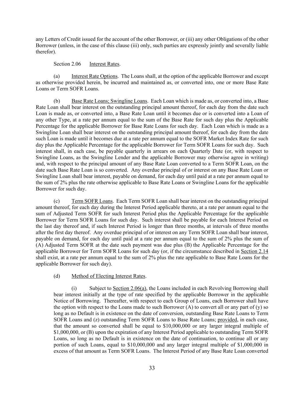 33 any Letters of Credit issued for the account of the other Borrower, or (iii) any other Obligations of the other Borrower (unless, in the case of this clause (iii) only, such parties are expressly jointly and severally liable therefor). Section 2.06 Interest Rates. (a) Interest Rate Options. The Loans shall, at the option of the applicable Borrower and except as otherwise provided herein, be incurred and maintained as, or converted into, one or more Base Rate Loans or Term SOFR Loans. (b) Base Rate Loans; Swingline Loans. Each Loan which is made as, or converted into, a Base Rate Loan shall bear interest on the outstanding principal amount thereof, for each day from the date such Loan is made as, or converted into, a Base Rate Loan until it becomes due or is converted into a Loan of any other Type, at a rate per annum equal to the sum of the Base Rate for such day plus the Applicable Percentage for the applicable Borrower for Base Rate Loans for such day. Each Loan which is made as a Swingline Loan shall bear interest on the outstanding principal amount thereof, for each day from the date such Loan is made until it becomes due at a rate per annum equal to the SOFR Market Index Rate for such day plus the Applicable Percentage for the applicable Borrower for Term SOFR Loans for such day. Such interest shall, in each case, be payable quarterly in arrears on each Quarterly Date (or, with respect to Swingline Loans, as the Swingline Lender and the applicable Borrower may otherwise agree in writing) and, with respect to the principal amount of any Base Rate Loan converted to a Term SOFR Loan, on the date such Base Rate Loan is so converted. Any overdue principal of or interest on any Base Rate Loan or Swingline Loan shall bear interest, payable on demand, for each day until paid at a rate per annum equal to the sum of 2% plus the rate otherwise applicable to Base Rate Loans or Swingline Loans for the applicable Borrower for such day. (c) Term SOFR Loans. Each Term SOFR Loan shall bear interest on the outstanding principal amount thereof, for each day during the Interest Period applicable thereto, at a rate per annum equal to the sum of Adjusted Term SOFR for such Interest Period plus the Applicable Percentage for the applicable Borrower for Term SOFR Loans for such day. Such interest shall be payable for each Interest Period on the last day thereof and, if such Interest Period is longer than three months, at intervals of three months after the first day thereof. Any overdue principal of or interest on any Term SOFR Loan shall bear interest, payable on demand, for each day until paid at a rate per annum equal to the sum of 2% plus the sum of (A) Adjusted Term SOFR at the date such payment was due plus (B) the Applicable Percentage for the applicable Borrower for Term SOFR Loans for such day (or, if the circumstance described in Section 2.14 shall exist, at a rate per annum equal to the sum of 2% plus the rate applicable to Base Rate Loans for the applicable Borrower for such day). (d) Method of Electing Interest Rates. (i) Subject to Section 2.06(a), the Loans included in each Revolving Borrowing shall bear interest initially at the type of rate specified by the applicable Borrower in the applicable Notice of Borrowing. Thereafter, with respect to each Group of Loans, each Borrower shall have the option with respect to the Loans made to such Borrower (A) to convert all or any part of (y) so long as no Default is in existence on the date of conversion, outstanding Base Rate Loans to Term SOFR Loans and (z) outstanding Term SOFR Loans to Base Rate Loans; provided, in each case, that the amount so converted shall be equal to $10,000,000 or any larger integral multiple of $1,000,000, or (B) upon the expiration of any Interest Period applicable to outstanding Term SOFR Loans, so long as no Default is in existence on the date of continuation, to continue all or any portion of such Loans, equal to $10,000,000 and any larger integral multiple of $1,000,000 in excess of that amount as Term SOFR Loans. The Interest Period of any Base Rate Loan converted