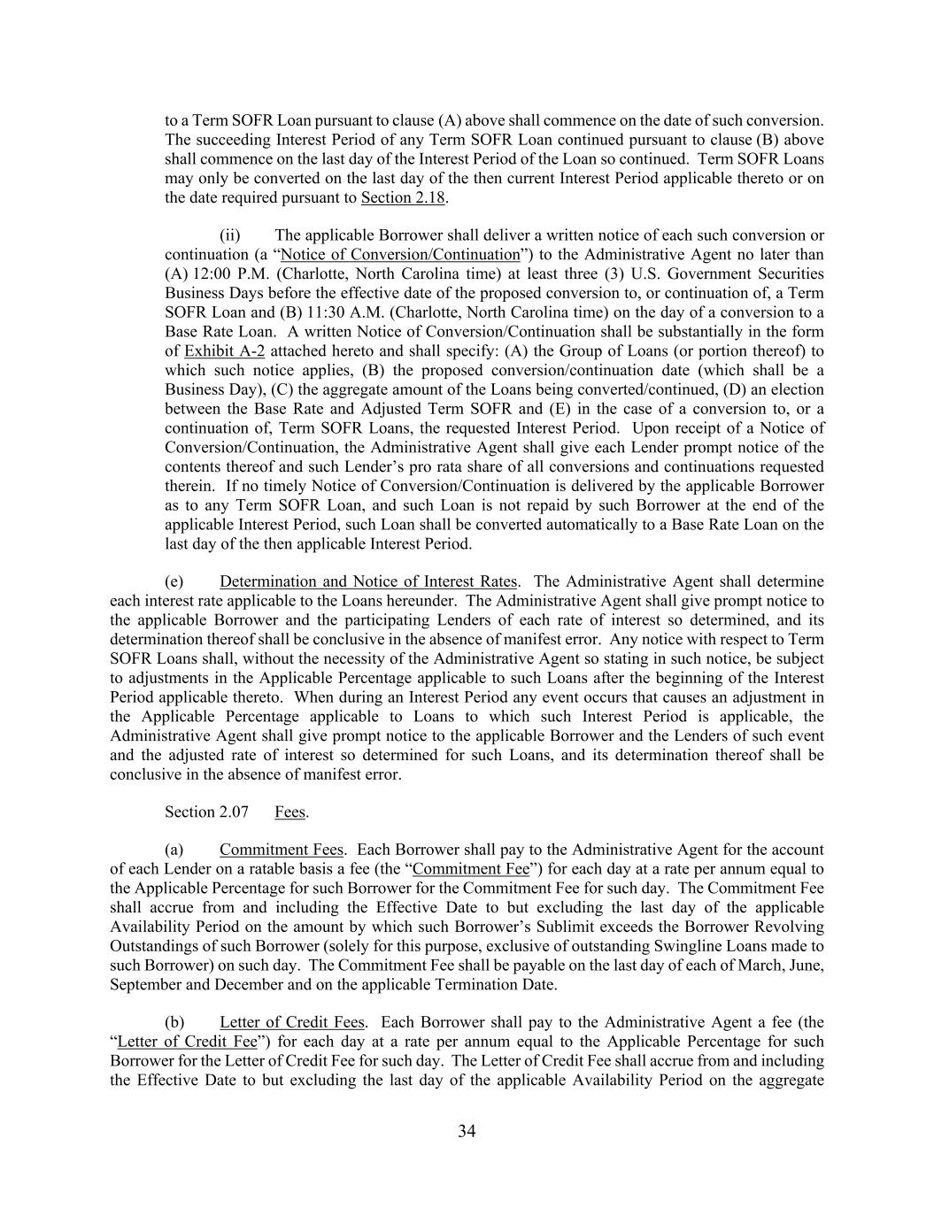 34 to a Term SOFR Loan pursuant to clause (A) above shall commence on the date of such conversion. The succeeding Interest Period of any Term SOFR Loan continued pursuant to clause (B) above shall commence on the last day of the Interest Period of the Loan so continued. Term SOFR Loans may only be converted on the last day of the then current Interest Period applicable thereto or on the date required pursuant to Section 2.18. (ii) The applicable Borrower shall deliver a written notice of each such conversion or continuation (a “Notice of Conversion/Continuation”) to the Administrative Agent no later than (A) 12:00 P.M. (Charlotte, North Carolina time) at least three (3) U.S. Government Securities Business Days before the effective date of the proposed conversion to, or continuation of, a Term SOFR Loan and (B) 11:30 A.M. (Charlotte, North Carolina time) on the day of a conversion to a Base Rate Loan. A written Notice of Conversion/Continuation shall be substantially in the form of Exhibit A-2 attached hereto and shall specify: (A) the Group of Loans (or portion thereof) to which such notice applies, (B) the proposed conversion/continuation date (which shall be a Business Day), (C) the aggregate amount of the Loans being converted/continued, (D) an election between the Base Rate and Adjusted Term SOFR and (E) in the case of a conversion to, or a continuation of, Term SOFR Loans, the requested Interest Period. Upon receipt of a Notice of Conversion/Continuation, the Administrative Agent shall give each Lender prompt notice of the contents thereof and such Lender’s pro rata share of all conversions and continuations requested therein. If no timely Notice of Conversion/Continuation is delivered by the applicable Borrower as to any Term SOFR Loan, and such Loan is not repaid by such Borrower at the end of the applicable Interest Period, such Loan shall be converted automatically to a Base Rate Loan on the last day of the then applicable Interest Period. (e) Determination and Notice of Interest Rates. The Administrative Agent shall determine each interest rate applicable to the Loans hereunder. The Administrative Agent shall give prompt notice to the applicable Borrower and the participating Lenders of each rate of interest so determined, and its determination thereof shall be conclusive in the absence of manifest error. Any notice with respect to Term SOFR Loans shall, without the necessity of the Administrative Agent so stating in such notice, be subject to adjustments in the Applicable Percentage applicable to such Loans after the beginning of the Interest Period applicable thereto. When during an Interest Period any event occurs that causes an adjustment in the Applicable Percentage applicable to Loans to which such Interest Period is applicable, the Administrative Agent shall give prompt notice to the applicable Borrower and the Lenders of such event and the adjusted rate of interest so determined for such Loans, and its determination thereof shall be conclusive in the absence of manifest error. Section 2.07 Fees. (a) Commitment Fees. Each Borrower shall pay to the Administrative Agent for the account of each Lender on a ratable basis a fee (the “Commitment Fee”) for each day at a rate per annum equal to the Applicable Percentage for such Borrower for the Commitment Fee for such day. The Commitment Fee shall accrue from and including the Effective Date to but excluding the last day of the applicable Availability Period on the amount by which such Borrower’s Sublimit exceeds the Borrower Revolving Outstandings of such Borrower (solely for this purpose, exclusive of outstanding Swingline Loans made to such Borrower) on such day. The Commitment Fee shall be payable on the last day of each of March, June, September and December and on the applicable Termination Date. (b) Letter of Credit Fees. Each Borrower shall pay to the Administrative Agent a fee (the “Letter of Credit Fee”) for each day at a rate per annum equal to the Applicable Percentage for such Borrower for the Letter of Credit Fee for such day. The Letter of Credit Fee shall accrue from and including the Effective Date to but excluding the last day of the applicable Availability Period on the aggregate