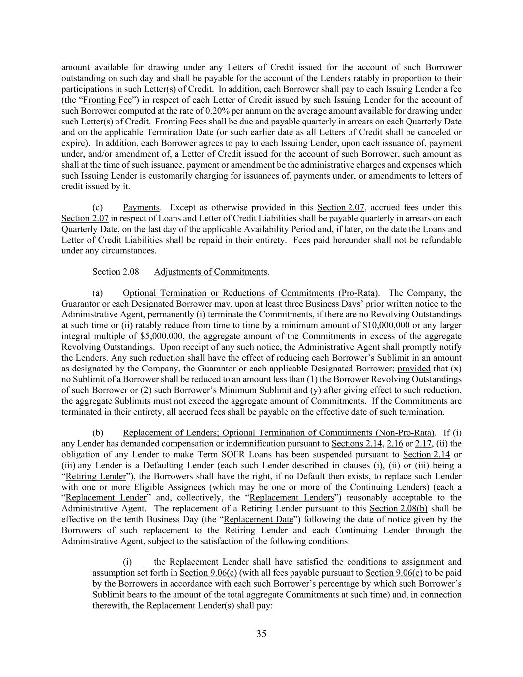 35 amount available for drawing under any Letters of Credit issued for the account of such Borrower outstanding on such day and shall be payable for the account of the Lenders ratably in proportion to their participations in such Letter(s) of Credit. In addition, each Borrower shall pay to each Issuing Lender a fee (the “Fronting Fee”) in respect of each Letter of Credit issued by such Issuing Lender for the account of such Borrower computed at the rate of 0.20% per annum on the average amount available for drawing under such Letter(s) of Credit. Fronting Fees shall be due and payable quarterly in arrears on each Quarterly Date and on the applicable Termination Date (or such earlier date as all Letters of Credit shall be canceled or expire). In addition, each Borrower agrees to pay to each Issuing Lender, upon each issuance of, payment under, and/or amendment of, a Letter of Credit issued for the account of such Borrower, such amount as shall at the time of such issuance, payment or amendment be the administrative charges and expenses which such Issuing Lender is customarily charging for issuances of, payments under, or amendments to letters of credit issued by it. (c) Payments. Except as otherwise provided in this Section 2.07, accrued fees under this Section 2.07 in respect of Loans and Letter of Credit Liabilities shall be payable quarterly in arrears on each Quarterly Date, on the last day of the applicable Availability Period and, if later, on the date the Loans and Letter of Credit Liabilities shall be repaid in their entirety. Fees paid hereunder shall not be refundable under any circumstances. Section 2.08 Adjustments of Commitments. (a) Optional Termination or Reductions of Commitments (Pro-Rata). The Company, the Guarantor or each Designated Borrower may, upon at least three Business Days’ prior written notice to the Administrative Agent, permanently (i) terminate the Commitments, if there are no Revolving Outstandings at such time or (ii) ratably reduce from time to time by a minimum amount of $10,000,000 or any larger integral multiple of $5,000,000, the aggregate amount of the Commitments in excess of the aggregate Revolving Outstandings. Upon receipt of any such notice, the Administrative Agent shall promptly notify the Lenders. Any such reduction shall have the effect of reducing each Borrower’s Sublimit in an amount as designated by the Company, the Guarantor or each applicable Designated Borrower; provided that (x) no Sublimit of a Borrower shall be reduced to an amount less than (1) the Borrower Revolving Outstandings of such Borrower or (2) such Borrower’s Minimum Sublimit and (y) after giving effect to such reduction, the aggregate Sublimits must not exceed the aggregate amount of Commitments. If the Commitments are terminated in their entirety, all accrued fees shall be payable on the effective date of such termination. (b) Replacement of Lenders; Optional Termination of Commitments (Non-Pro-Rata). If (i) any Lender has demanded compensation or indemnification pursuant to Sections 2.14, 2.16 or 2.17, (ii) the obligation of any Lender to make Term SOFR Loans has been suspended pursuant to Section 2.14 or (iii) any Lender is a Defaulting Lender (each such Lender described in clauses (i), (ii) or (iii) being a “Retiring Lender”), the Borrowers shall have the right, if no Default then exists, to replace such Lender with one or more Eligible Assignees (which may be one or more of the Continuing Lenders) (each a “Replacement Lender” and, collectively, the “Replacement Lenders”) reasonably acceptable to the Administrative Agent. The replacement of a Retiring Lender pursuant to this Section 2.08(b) shall be effective on the tenth Business Day (the “Replacement Date”) following the date of notice given by the Borrowers of such replacement to the Retiring Lender and each Continuing Lender through the Administrative Agent, subject to the satisfaction of the following conditions: (i) the Replacement Lender shall have satisfied the conditions to assignment and assumption set forth in Section 9.06(c) (with all fees payable pursuant to Section 9.06(c) to be paid by the Borrowers in accordance with each such Borrower’s percentage by which such Borrower’s Sublimit bears to the amount of the total aggregate Commitments at such time) and, in connection therewith, the Replacement Lender(s) shall pay: