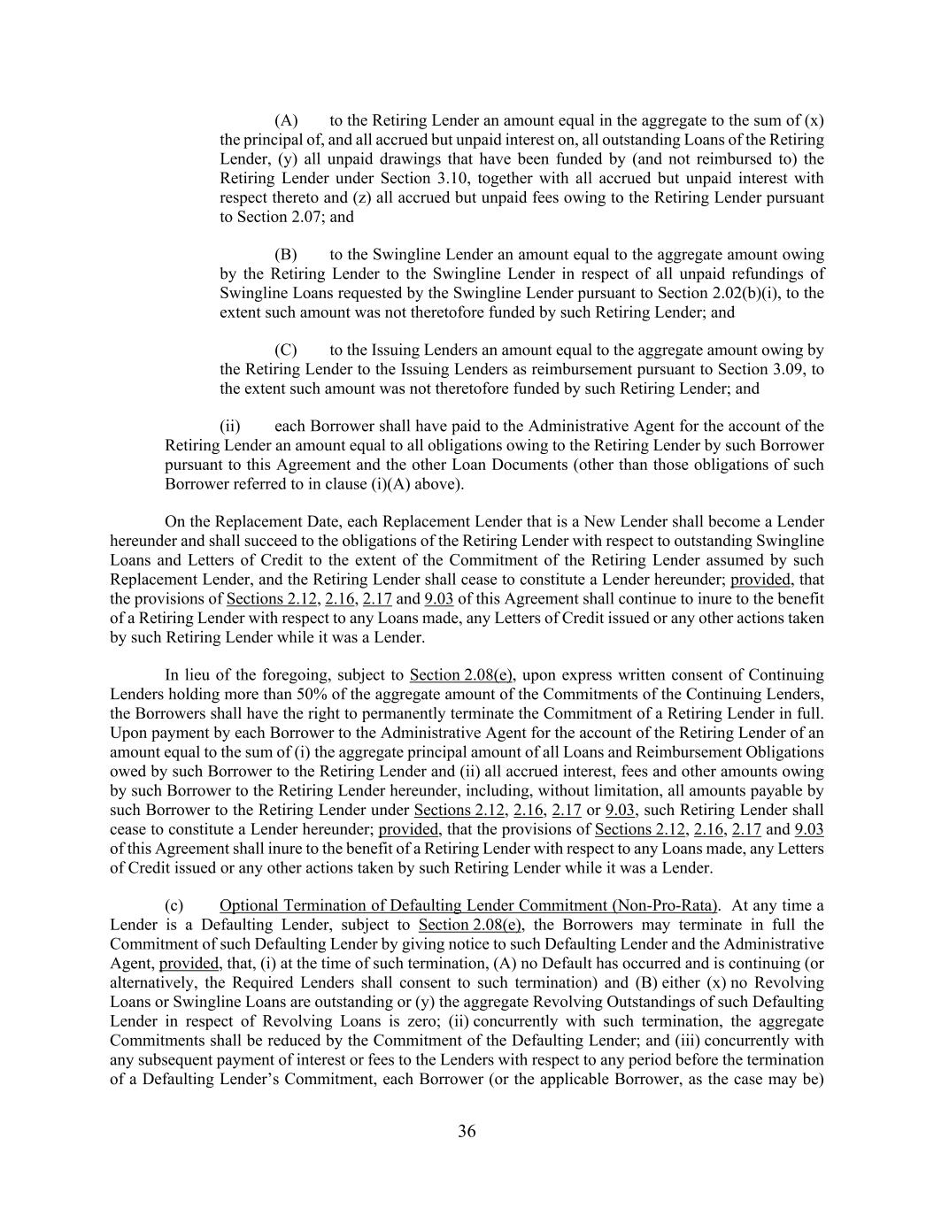 36 (A) to the Retiring Lender an amount equal in the aggregate to the sum of (x) the principal of, and all accrued but unpaid interest on, all outstanding Loans of the Retiring Lender, (y) all unpaid drawings that have been funded by (and not reimbursed to) the Retiring Lender under Section 3.10, together with all accrued but unpaid interest with respect thereto and (z) all accrued but unpaid fees owing to the Retiring Lender pursuant to Section 2.07; and (B) to the Swingline Lender an amount equal to the aggregate amount owing by the Retiring Lender to the Swingline Lender in respect of all unpaid refundings of Swingline Loans requested by the Swingline Lender pursuant to Section 2.02(b)(i), to the extent such amount was not theretofore funded by such Retiring Lender; and (C) to the Issuing Lenders an amount equal to the aggregate amount owing by the Retiring Lender to the Issuing Lenders as reimbursement pursuant to Section 3.09, to the extent such amount was not theretofore funded by such Retiring Lender; and (ii) each Borrower shall have paid to the Administrative Agent for the account of the Retiring Lender an amount equal to all obligations owing to the Retiring Lender by such Borrower pursuant to this Agreement and the other Loan Documents (other than those obligations of such Borrower referred to in clause (i)(A) above). On the Replacement Date, each Replacement Lender that is a New Lender shall become a Lender hereunder and shall succeed to the obligations of the Retiring Lender with respect to outstanding Swingline Loans and Letters of Credit to the extent of the Commitment of the Retiring Lender assumed by such Replacement Lender, and the Retiring Lender shall cease to constitute a Lender hereunder; provided, that the provisions of Sections 2.12, 2.16, 2.17 and 9.03 of this Agreement shall continue to inure to the benefit of a Retiring Lender with respect to any Loans made, any Letters of Credit issued or any other actions taken by such Retiring Lender while it was a Lender. In lieu of the foregoing, subject to Section 2.08(e), upon express written consent of Continuing Lenders holding more than 50% of the aggregate amount of the Commitments of the Continuing Lenders, the Borrowers shall have the right to permanently terminate the Commitment of a Retiring Lender in full. Upon payment by each Borrower to the Administrative Agent for the account of the Retiring Lender of an amount equal to the sum of (i) the aggregate principal amount of all Loans and Reimbursement Obligations owed by such Borrower to the Retiring Lender and (ii) all accrued interest, fees and other amounts owing by such Borrower to the Retiring Lender hereunder, including, without limitation, all amounts payable by such Borrower to the Retiring Lender under Sections 2.12, 2.16, 2.17 or 9.03, such Retiring Lender shall cease to constitute a Lender hereunder; provided, that the provisions of Sections 2.12, 2.16, 2.17 and 9.03 of this Agreement shall inure to the benefit of a Retiring Lender with respect to any Loans made, any Letters of Credit issued or any other actions taken by such Retiring Lender while it was a Lender. (c) Optional Termination of Defaulting Lender Commitment (Non-Pro-Rata). At any time a Lender is a Defaulting Lender, subject to Section 2.08(e), the Borrowers may terminate in full the Commitment of such Defaulting Lender by giving notice to such Defaulting Lender and the Administrative Agent, provided, that, (i) at the time of such termination, (A) no Default has occurred and is continuing (or alternatively, the Required Lenders shall consent to such termination) and (B) either (x) no Revolving Loans or Swingline Loans are outstanding or (y) the aggregate Revolving Outstandings of such Defaulting Lender in respect of Revolving Loans is zero; (ii) concurrently with such termination, the aggregate Commitments shall be reduced by the Commitment of the Defaulting Lender; and (iii) concurrently with any subsequent payment of interest or fees to the Lenders with respect to any period before the termination of a Defaulting Lender’s Commitment, each Borrower (or the applicable Borrower, as the case may be)