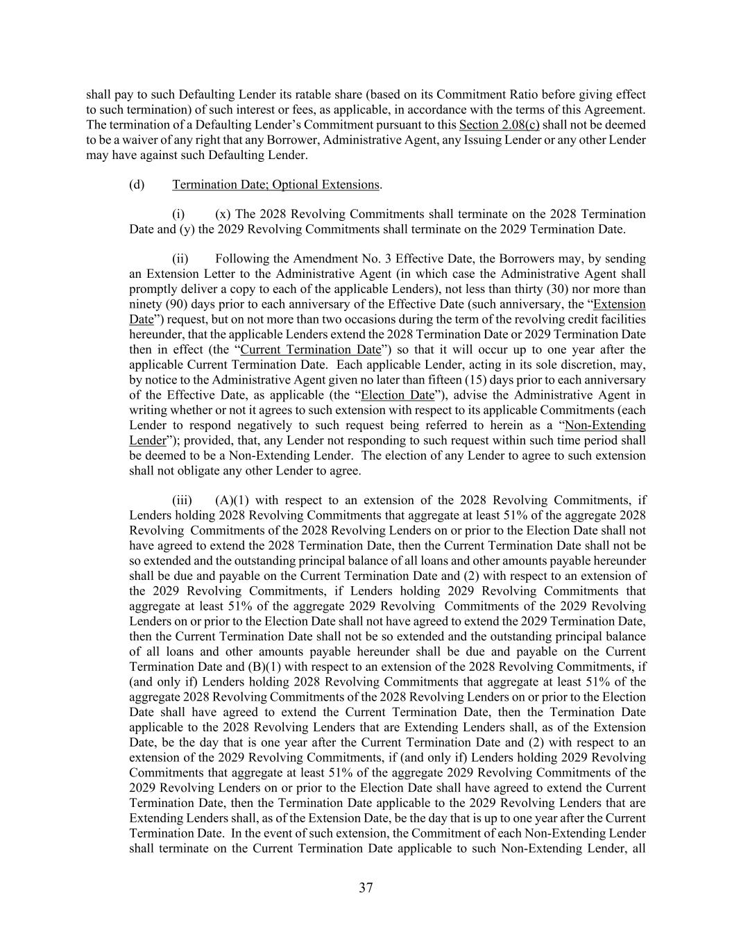 37 shall pay to such Defaulting Lender its ratable share (based on its Commitment Ratio before giving effect to such termination) of such interest or fees, as applicable, in accordance with the terms of this Agreement. The termination of a Defaulting Lender’s Commitment pursuant to this Section 2.08(c) shall not be deemed to be a waiver of any right that any Borrower, Administrative Agent, any Issuing Lender or any other Lender may have against such Defaulting Lender. (d) Termination Date; Optional Extensions. (i) (x) The 2028 Revolving Commitments shall terminate on the 2028 Termination Date and (y) the 2029 Revolving Commitments shall terminate on the 2029 Termination Date. (ii) Following the Amendment No. 3 Effective Date, the Borrowers may, by sending an Extension Letter to the Administrative Agent (in which case the Administrative Agent shall promptly deliver a copy to each of the applicable Lenders), not less than thirty (30) nor more than ninety (90) days prior to each anniversary of the Effective Date (such anniversary, the “Extension Date”) request, but on not more than two occasions during the term of the revolving credit facilities hereunder, that the applicable Lenders extend the 2028 Termination Date or 2029 Termination Date then in effect (the “Current Termination Date”) so that it will occur up to one year after the applicable Current Termination Date. Each applicable Lender, acting in its sole discretion, may, by notice to the Administrative Agent given no later than fifteen (15) days prior to each anniversary of the Effective Date, as applicable (the “Election Date”), advise the Administrative Agent in writing whether or not it agrees to such extension with respect to its applicable Commitments (each Lender to respond negatively to such request being referred to herein as a “Non-Extending Lender”); provided, that, any Lender not responding to such request within such time period shall be deemed to be a Non-Extending Lender. The election of any Lender to agree to such extension shall not obligate any other Lender to agree. (iii) (A)(1) with respect to an extension of the 2028 Revolving Commitments, if Lenders holding 2028 Revolving Commitments that aggregate at least 51% of the aggregate 2028 Revolving Commitments of the 2028 Revolving Lenders on or prior to the Election Date shall not have agreed to extend the 2028 Termination Date, then the Current Termination Date shall not be so extended and the outstanding principal balance of all loans and other amounts payable hereunder shall be due and payable on the Current Termination Date and (2) with respect to an extension of the 2029 Revolving Commitments, if Lenders holding 2029 Revolving Commitments that aggregate at least 51% of the aggregate 2029 Revolving Commitments of the 2029 Revolving Lenders on or prior to the Election Date shall not have agreed to extend the 2029 Termination Date, then the Current Termination Date shall not be so extended and the outstanding principal balance of all loans and other amounts payable hereunder shall be due and payable on the Current Termination Date and (B)(1) with respect to an extension of the 2028 Revolving Commitments, if (and only if) Lenders holding 2028 Revolving Commitments that aggregate at least 51% of the aggregate 2028 Revolving Commitments of the 2028 Revolving Lenders on or prior to the Election Date shall have agreed to extend the Current Termination Date, then the Termination Date applicable to the 2028 Revolving Lenders that are Extending Lenders shall, as of the Extension Date, be the day that is one year after the Current Termination Date and (2) with respect to an extension of the 2029 Revolving Commitments, if (and only if) Lenders holding 2029 Revolving Commitments that aggregate at least 51% of the aggregate 2029 Revolving Commitments of the 2029 Revolving Lenders on or prior to the Election Date shall have agreed to extend the Current Termination Date, then the Termination Date applicable to the 2029 Revolving Lenders that are Extending Lenders shall, as of the Extension Date, be the day that is up to one year after the Current Termination Date. In the event of such extension, the Commitment of each Non-Extending Lender shall terminate on the Current Termination Date applicable to such Non-Extending Lender, all