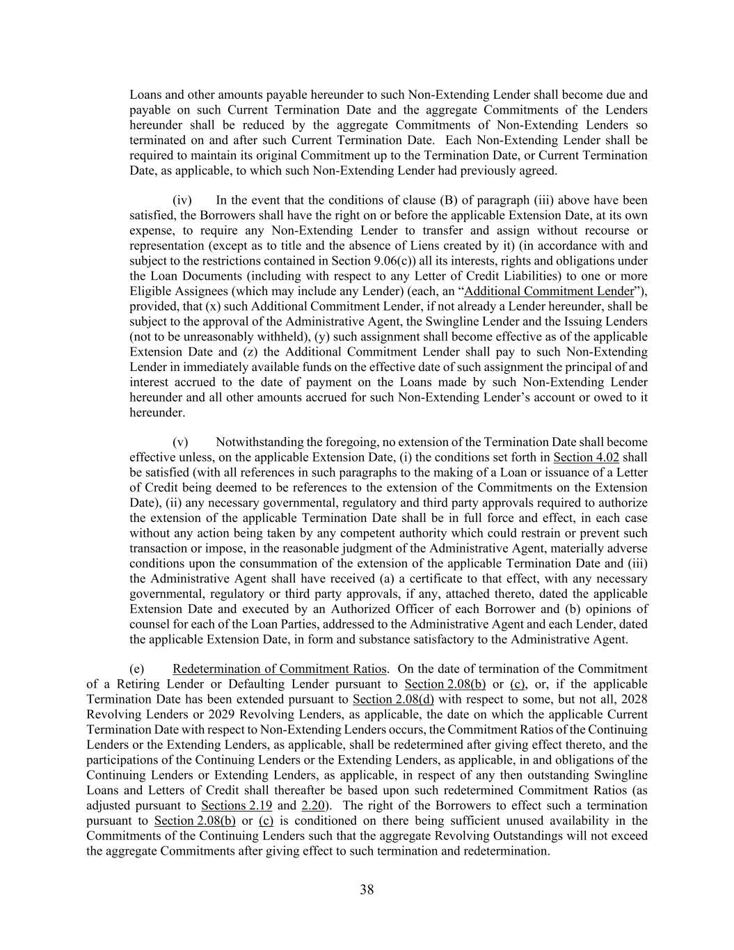 38 Loans and other amounts payable hereunder to such Non-Extending Lender shall become due and payable on such Current Termination Date and the aggregate Commitments of the Lenders hereunder shall be reduced by the aggregate Commitments of Non-Extending Lenders so terminated on and after such Current Termination Date. Each Non-Extending Lender shall be required to maintain its original Commitment up to the Termination Date, or Current Termination Date, as applicable, to which such Non-Extending Lender had previously agreed. (iv) In the event that the conditions of clause (B) of paragraph (iii) above have been satisfied, the Borrowers shall have the right on or before the applicable Extension Date, at its own expense, to require any Non-Extending Lender to transfer and assign without recourse or representation (except as to title and the absence of Liens created by it) (in accordance with and subject to the restrictions contained in Section 9.06(c)) all its interests, rights and obligations under the Loan Documents (including with respect to any Letter of Credit Liabilities) to one or more Eligible Assignees (which may include any Lender) (each, an “Additional Commitment Lender”), provided, that (x) such Additional Commitment Lender, if not already a Lender hereunder, shall be subject to the approval of the Administrative Agent, the Swingline Lender and the Issuing Lenders (not to be unreasonably withheld), (y) such assignment shall become effective as of the applicable Extension Date and (z) the Additional Commitment Lender shall pay to such Non-Extending Lender in immediately available funds on the effective date of such assignment the principal of and interest accrued to the date of payment on the Loans made by such Non-Extending Lender hereunder and all other amounts accrued for such Non-Extending Lender’s account or owed to it hereunder. (v) Notwithstanding the foregoing, no extension of the Termination Date shall become effective unless, on the applicable Extension Date, (i) the conditions set forth in Section 4.02 shall be satisfied (with all references in such paragraphs to the making of a Loan or issuance of a Letter of Credit being deemed to be references to the extension of the Commitments on the Extension Date), (ii) any necessary governmental, regulatory and third party approvals required to authorize the extension of the applicable Termination Date shall be in full force and effect, in each case without any action being taken by any competent authority which could restrain or prevent such transaction or impose, in the reasonable judgment of the Administrative Agent, materially adverse conditions upon the consummation of the extension of the applicable Termination Date and (iii) the Administrative Agent shall have received (a) a certificate to that effect, with any necessary governmental, regulatory or third party approvals, if any, attached thereto, dated the applicable Extension Date and executed by an Authorized Officer of each Borrower and (b) opinions of counsel for each of the Loan Parties, addressed to the Administrative Agent and each Lender, dated the applicable Extension Date, in form and substance satisfactory to the Administrative Agent. (e) Redetermination of Commitment Ratios. On the date of termination of the Commitment of a Retiring Lender or Defaulting Lender pursuant to Section 2.08(b) or (c), or, if the applicable Termination Date has been extended pursuant to Section 2.08(d) with respect to some, but not all, 2028 Revolving Lenders or 2029 Revolving Lenders, as applicable, the date on which the applicable Current Termination Date with respect to Non-Extending Lenders occurs, the Commitment Ratios of the Continuing Lenders or the Extending Lenders, as applicable, shall be redetermined after giving effect thereto, and the participations of the Continuing Lenders or the Extending Lenders, as applicable, in and obligations of the Continuing Lenders or Extending Lenders, as applicable, in respect of any then outstanding Swingline Loans and Letters of Credit shall thereafter be based upon such redetermined Commitment Ratios (as adjusted pursuant to Sections 2.19 and 2.20). The right of the Borrowers to effect such a termination pursuant to Section 2.08(b) or (c) is conditioned on there being sufficient unused availability in the Commitments of the Continuing Lenders such that the aggregate Revolving Outstandings will not exceed the aggregate Commitments after giving effect to such termination and redetermination.