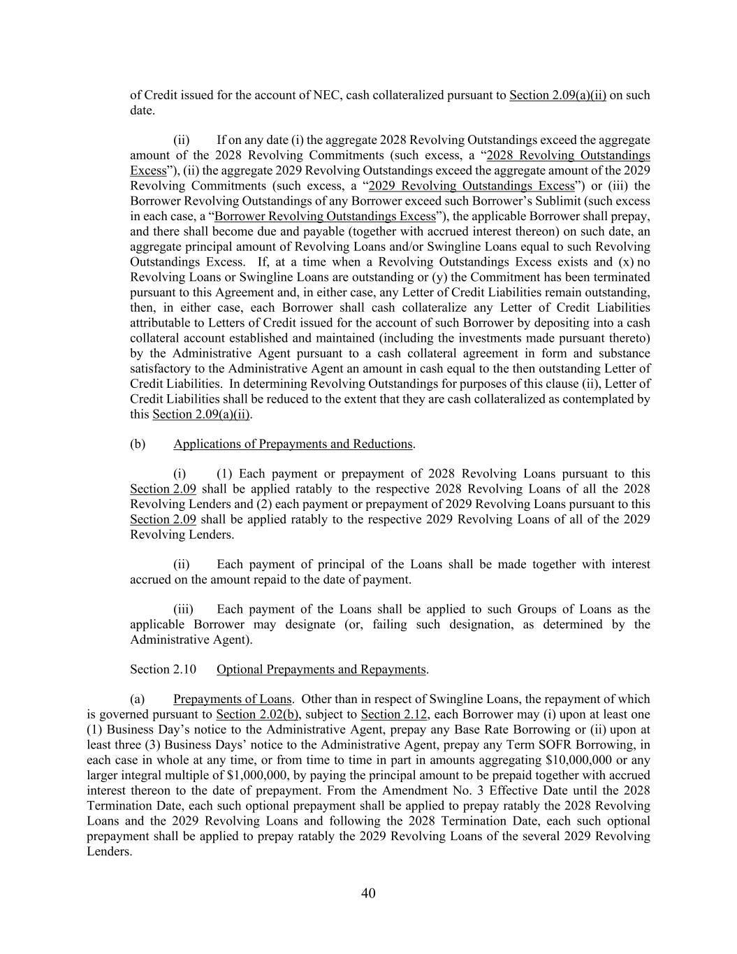 40 of Credit issued for the account of NEC, cash collateralized pursuant to Section 2.09(a)(ii) on such date. (ii) If on any date (i) the aggregate 2028 Revolving Outstandings exceed the aggregate amount of the 2028 Revolving Commitments (such excess, a “2028 Revolving Outstandings Excess”), (ii) the aggregate 2029 Revolving Outstandings exceed the aggregate amount of the 2029 Revolving Commitments (such excess, a “2029 Revolving Outstandings Excess”) or (iii) the Borrower Revolving Outstandings of any Borrower exceed such Borrower’s Sublimit (such excess in each case, a “Borrower Revolving Outstandings Excess”), the applicable Borrower shall prepay, and there shall become due and payable (together with accrued interest thereon) on such date, an aggregate principal amount of Revolving Loans and/or Swingline Loans equal to such Revolving Outstandings Excess. If, at a time when a Revolving Outstandings Excess exists and (x) no Revolving Loans or Swingline Loans are outstanding or (y) the Commitment has been terminated pursuant to this Agreement and, in either case, any Letter of Credit Liabilities remain outstanding, then, in either case, each Borrower shall cash collateralize any Letter of Credit Liabilities attributable to Letters of Credit issued for the account of such Borrower by depositing into a cash collateral account established and maintained (including the investments made pursuant thereto) by the Administrative Agent pursuant to a cash collateral agreement in form and substance satisfactory to the Administrative Agent an amount in cash equal to the then outstanding Letter of Credit Liabilities. In determining Revolving Outstandings for purposes of this clause (ii), Letter of Credit Liabilities shall be reduced to the extent that they are cash collateralized as contemplated by this Section 2.09(a)(ii). (b) Applications of Prepayments and Reductions. (i) (1) Each payment or prepayment of 2028 Revolving Loans pursuant to this Section 2.09 shall be applied ratably to the respective 2028 Revolving Loans of all the 2028 Revolving Lenders and (2) each payment or prepayment of 2029 Revolving Loans pursuant to this Section 2.09 shall be applied ratably to the respective 2029 Revolving Loans of all of the 2029 Revolving Lenders. (ii) Each payment of principal of the Loans shall be made together with interest accrued on the amount repaid to the date of payment. (iii) Each payment of the Loans shall be applied to such Groups of Loans as the applicable Borrower may designate (or, failing such designation, as determined by the Administrative Agent). Section 2.10 Optional Prepayments and Repayments. (a) Prepayments of Loans. Other than in respect of Swingline Loans, the repayment of which is governed pursuant to Section 2.02(b), subject to Section 2.12, each Borrower may (i) upon at least one (1) Business Day’s notice to the Administrative Agent, prepay any Base Rate Borrowing or (ii) upon at least three (3) Business Days’ notice to the Administrative Agent, prepay any Term SOFR Borrowing, in each case in whole at any time, or from time to time in part in amounts aggregating $10,000,000 or any larger integral multiple of $1,000,000, by paying the principal amount to be prepaid together with accrued interest thereon to the date of prepayment. From the Amendment No. 3 Effective Date until the 2028 Termination Date, each such optional prepayment shall be applied to prepay ratably the 2028 Revolving Loans and the 2029 Revolving Loans and following the 2028 Termination Date, each such optional prepayment shall be applied to prepay ratably the 2029 Revolving Loans of the several 2029 Revolving Lenders.