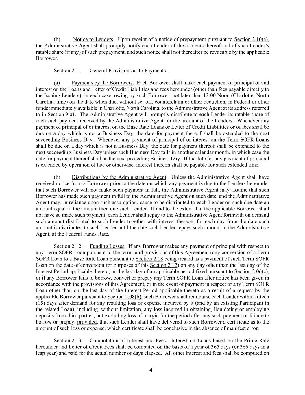 41 (b) Notice to Lenders. Upon receipt of a notice of prepayment pursuant to Section 2.10(a), the Administrative Agent shall promptly notify each Lender of the contents thereof and of such Lender’s ratable share (if any) of such prepayment, and such notice shall not thereafter be revocable by the applicable Borrower. Section 2.11 General Provisions as to Payments. (a) Payments by the Borrowers. Each Borrower shall make each payment of principal of and interest on the Loans and Letter of Credit Liabilities and fees hereunder (other than fees payable directly to the Issuing Lenders), in each case, owing by such Borrower, not later than 12:00 Noon (Charlotte, North Carolina time) on the date when due, without set-off, counterclaim or other deduction, in Federal or other funds immediately available in Charlotte, North Carolina, to the Administrative Agent at its address referred to in Section 9.01. The Administrative Agent will promptly distribute to each Lender its ratable share of each such payment received by the Administrative Agent for the account of the Lenders. Whenever any payment of principal of or interest on the Base Rate Loans or Letter of Credit Liabilities or of fees shall be due on a day which is not a Business Day, the date for payment thereof shall be extended to the next succeeding Business Day. Whenever any payment of principal of or interest on the Term SOFR Loans shall be due on a day which is not a Business Day, the date for payment thereof shall be extended to the next succeeding Business Day unless such Business Day falls in another calendar month, in which case the date for payment thereof shall be the next preceding Business Day. If the date for any payment of principal is extended by operation of law or otherwise, interest thereon shall be payable for such extended time. (b) Distributions by the Administrative Agent. Unless the Administrative Agent shall have received notice from a Borrower prior to the date on which any payment is due to the Lenders hereunder that such Borrower will not make such payment in full, the Administrative Agent may assume that such Borrower has made such payment in full to the Administrative Agent on such date, and the Administrative Agent may, in reliance upon such assumption, cause to be distributed to each Lender on such due date an amount equal to the amount then due such Lender. If and to the extent that the applicable Borrower shall not have so made such payment, each Lender shall repay to the Administrative Agent forthwith on demand such amount distributed to such Lender together with interest thereon, for each day from the date such amount is distributed to such Lender until the date such Lender repays such amount to the Administrative Agent, at the Federal Funds Rate. Section 2.12 Funding Losses. If any Borrower makes any payment of principal with respect to any Term SOFR Loan pursuant to the terms and provisions of this Agreement (any conversion of a Term SOFR Loan to a Base Rate Loan pursuant to Section 2.18 being treated as a payment of such Term SOFR Loan on the date of conversion for purposes of this Section 2.12) on any day other than the last day of the Interest Period applicable thereto, or the last day of an applicable period fixed pursuant to Section 2.06(c), or if any Borrower fails to borrow, convert or prepay any Term SOFR Loan after notice has been given in accordance with the provisions of this Agreement, or in the event of payment in respect of any Term SOFR Loan other than on the last day of the Interest Period applicable thereto as a result of a request by the applicable Borrower pursuant to Section 2.08(b), such Borrower shall reimburse each Lender within fifteen (15) days after demand for any resulting loss or expense incurred by it (and by an existing Participant in the related Loan), including, without limitation, any loss incurred in obtaining, liquidating or employing deposits from third parties, but excluding loss of margin for the period after any such payment or failure to borrow or prepay; provided, that such Lender shall have delivered to such Borrower a certificate as to the amount of such loss or expense, which certificate shall be conclusive in the absence of manifest error. Section 2.13 Computation of Interest and Fees. Interest on Loans based on the Prime Rate hereunder and Letter of Credit Fees shall be computed on the basis of a year of 365 days (or 366 days in a leap year) and paid for the actual number of days elapsed. All other interest and fees shall be computed on