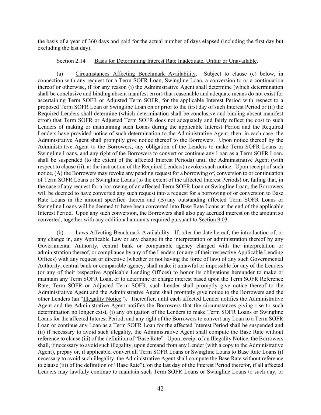 42 the basis of a year of 360 days and paid for the actual number of days elapsed (including the first day but excluding the last day). Section 2.14 Basis for Determining Interest Rate Inadequate, Unfair or Unavailable. (a) Circumstances Affecting Benchmark Availability. Subject to clause (c) below, in connection with any request for a Term SOFR Loan, Swingline Loan, a conversion to or a continuation thereof or otherwise, if for any reason (i) the Administrative Agent shall determine (which determination shall be conclusive and binding absent manifest error) that reasonable and adequate means do not exist for ascertaining Term SOFR or Adjusted Term SOFR, for the applicable Interest Period with respect to a proposed Term SOFR Loan or Swingline Loan on or prior to the first day of such Interest Period or (ii) the Required Lenders shall determine (which determination shall be conclusive and binding absent manifest error) that Term SOFR or Adjusted Term SOFR does not adequately and fairly reflect the cost to such Lenders of making or maintaining such Loans during the applicable Interest Period and the Required Lenders have provided notice of such determination to the Administrative Agent, then, in each case, the Administrative Agent shall promptly give notice thereof to the Borrowers. Upon notice thereof by the Administrative Agent to the Borrowers, any obligation of the Lenders to make Term SOFR Loans or Swingline Loans, and any right of the Borrowers to convert or continue any Loan as a Term SOFR Loan, shall be suspended (to the extent of the affected Interest Periods) until the Administrative Agent (with respect to clause (ii), at the instruction of the Required Lenders) revokes such notice. Upon receipt of such notice, (A) the Borrowers may revoke any pending request for a borrowing of, conversion to or continuation of Term SOFR Loans or Swingline Loans (to the extent of the affected Interest Periods) or, failing that, in the case of any request for a borrowing of an affected Term SOFR Loan or Swingline Loan, the Borrowers will be deemed to have converted any such request into a request for a borrowing of or conversion to Base Rate Loans in the amount specified therein and (B) any outstanding affected Term SOFR Loans or Swingline Loans will be deemed to have been converted into Base Rate Loans at the end of the applicable Interest Period. Upon any such conversion, the Borrowers shall also pay accrued interest on the amount so converted, together with any additional amounts required pursuant to Section 9.03. (b) Laws Affecting Benchmark Availability. If, after the date hereof, the introduction of, or any change in, any Applicable Law or any change in the interpretation or administration thereof by any Governmental Authority, central bank or comparable agency charged with the interpretation or administration thereof, or compliance by any of the Lenders (or any of their respective Applicable Lending Offices) with any request or directive (whether or not having the force of law) of any such Governmental Authority, central bank or comparable agency, shall make it unlawful or impossible for any of the Lenders (or any of their respective Applicable Lending Offices) to honor its obligations hereunder to make or maintain any Term SOFR Loan, or to determine or charge interest based upon the Term SOFR Reference Rate, Term SOFR or Adjusted Term SOFR, such Lender shall promptly give notice thereof to the Administrative Agent and the Administrative Agent shall promptly give notice to the Borrowers and the other Lenders (an “Illegality Notice”). Thereafter, until each affected Lender notifies the Administrative Agent and the Administrative Agent notifies the Borrowers that the circumstances giving rise to such determination no longer exist, (i) any obligation of the Lenders to make Term SOFR Loans or Swingline Loans for the affected Interest Period, and any right of the Borrowers to convert any Loan to a Term SOFR Loan or continue any Loan as a Term SOFR Loan for the affected Interest Period shall be suspended and (ii) if necessary to avoid such illegality, the Administrative Agent shall compute the Base Rate without reference to clause (iii) of the definition of “Base Rate”. Upon receipt of an Illegality Notice, the Borrowers shall, if necessary to avoid such illegality, upon demand from any Lender (with a copy to the Administrative Agent), prepay or, if applicable, convert all Term SOFR Loans or Swingline Loans to Base Rate Loans (if necessary to avoid such illegality, the Administrative Agent shall compute the Base Rate without reference to clause (iii) of the definition of “Base Rate”), on the last day of the Interest Period therefor, if all affected Lenders may lawfully continue to maintain such Term SOFR Loans or Swingline Loans to such day, or