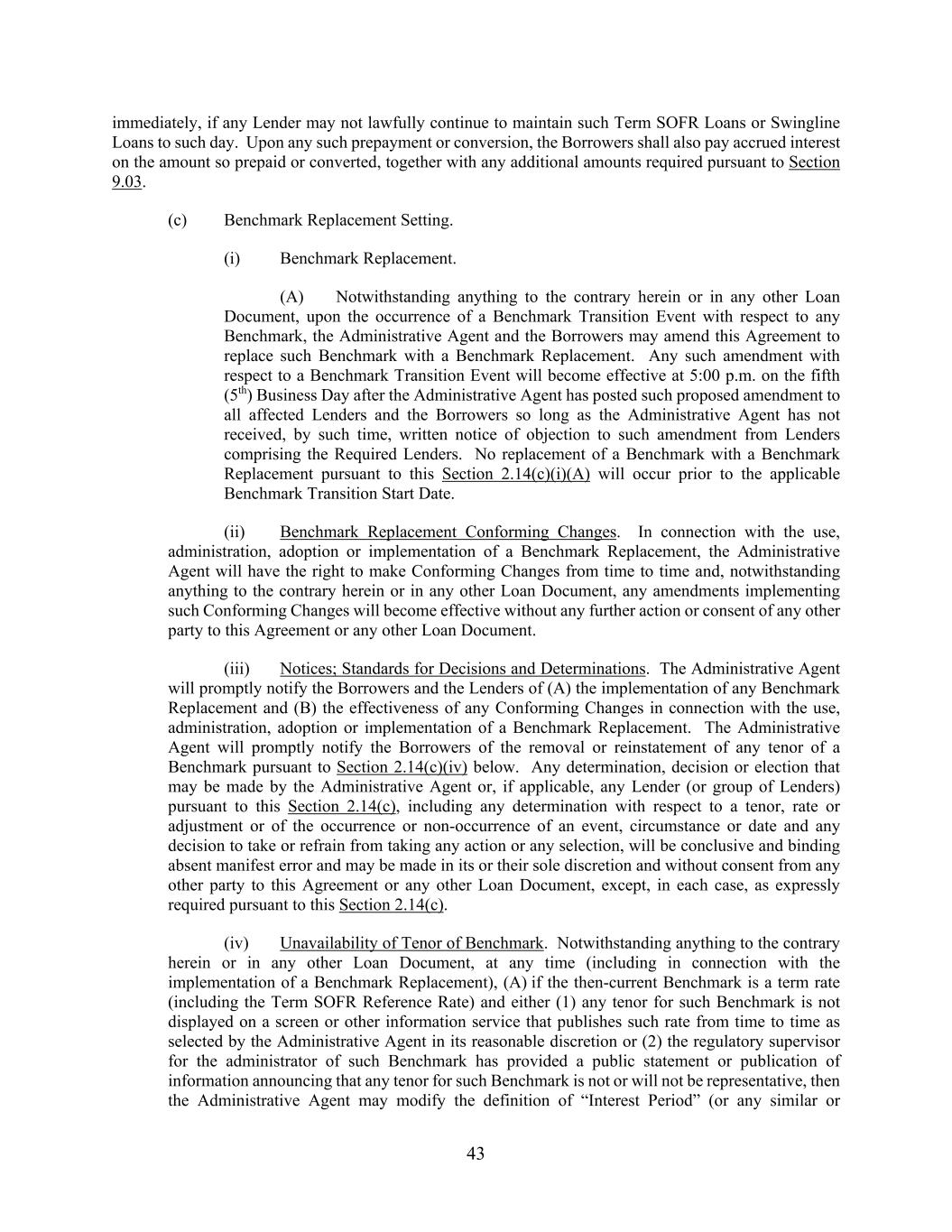 43 immediately, if any Lender may not lawfully continue to maintain such Term SOFR Loans or Swingline Loans to such day. Upon any such prepayment or conversion, the Borrowers shall also pay accrued interest on the amount so prepaid or converted, together with any additional amounts required pursuant to Section 9.03. (c) Benchmark Replacement Setting. (i) Benchmark Replacement. (A) Notwithstanding anything to the contrary herein or in any other Loan Document, upon the occurrence of a Benchmark Transition Event with respect to any Benchmark, the Administrative Agent and the Borrowers may amend this Agreement to replace such Benchmark with a Benchmark Replacement. Any such amendment with respect to a Benchmark Transition Event will become effective at 5:00 p.m. on the fifth (5th) Business Day after the Administrative Agent has posted such proposed amendment to all affected Lenders and the Borrowers so long as the Administrative Agent has not received, by such time, written notice of objection to such amendment from Lenders comprising the Required Lenders. No replacement of a Benchmark with a Benchmark Replacement pursuant to this Section 2.14(c)(i)(A) will occur prior to the applicable Benchmark Transition Start Date. (ii) Benchmark Replacement Conforming Changes. In connection with the use, administration, adoption or implementation of a Benchmark Replacement, the Administrative Agent will have the right to make Conforming Changes from time to time and, notwithstanding anything to the contrary herein or in any other Loan Document, any amendments implementing such Conforming Changes will become effective without any further action or consent of any other party to this Agreement or any other Loan Document. (iii) Notices; Standards for Decisions and Determinations. The Administrative Agent will promptly notify the Borrowers and the Lenders of (A) the implementation of any Benchmark Replacement and (B) the effectiveness of any Conforming Changes in connection with the use, administration, adoption or implementation of a Benchmark Replacement. The Administrative Agent will promptly notify the Borrowers of the removal or reinstatement of any tenor of a Benchmark pursuant to Section 2.14(c)(iv) below. Any determination, decision or election that may be made by the Administrative Agent or, if applicable, any Lender (or group of Lenders) pursuant to this Section 2.14(c), including any determination with respect to a tenor, rate or adjustment or of the occurrence or non-occurrence of an event, circumstance or date and any decision to take or refrain from taking any action or any selection, will be conclusive and binding absent manifest error and may be made in its or their sole discretion and without consent from any other party to this Agreement or any other Loan Document, except, in each case, as expressly required pursuant to this Section 2.14(c). (iv) Unavailability of Tenor of Benchmark. Notwithstanding anything to the contrary herein or in any other Loan Document, at any time (including in connection with the implementation of a Benchmark Replacement), (A) if the then-current Benchmark is a term rate (including the Term SOFR Reference Rate) and either (1) any tenor for such Benchmark is not displayed on a screen or other information service that publishes such rate from time to time as selected by the Administrative Agent in its reasonable discretion or (2) the regulatory supervisor for the administrator of such Benchmark has provided a public statement or publication of information announcing that any tenor for such Benchmark is not or will not be representative, then the Administrative Agent may modify the definition of “Interest Period” (or any similar or