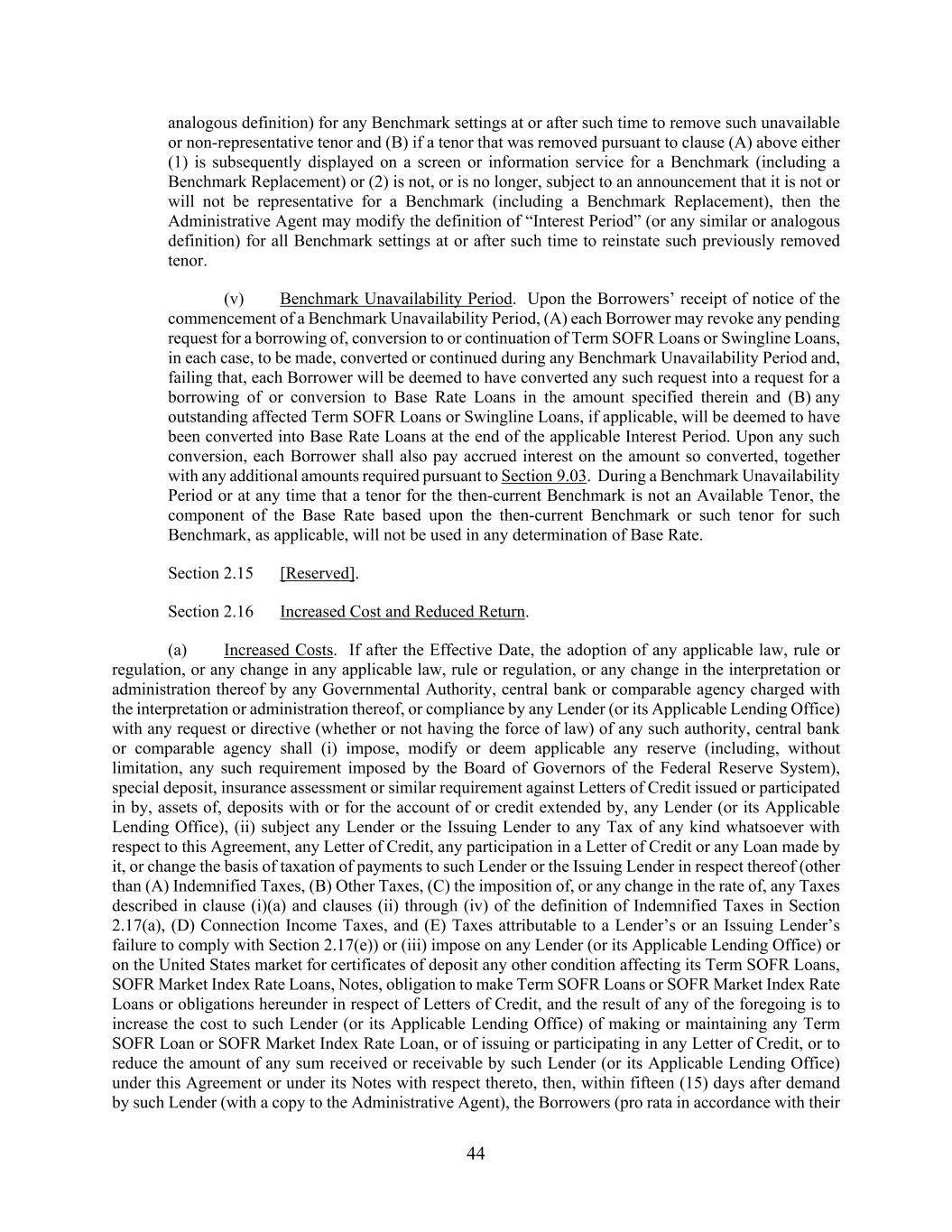 44 analogous definition) for any Benchmark settings at or after such time to remove such unavailable or non-representative tenor and (B) if a tenor that was removed pursuant to clause (A) above either (1) is subsequently displayed on a screen or information service for a Benchmark (including a Benchmark Replacement) or (2) is not, or is no longer, subject to an announcement that it is not or will not be representative for a Benchmark (including a Benchmark Replacement), then the Administrative Agent may modify the definition of “Interest Period” (or any similar or analogous definition) for all Benchmark settings at or after such time to reinstate such previously removed tenor. (v) Benchmark Unavailability Period. Upon the Borrowers’ receipt of notice of the commencement of a Benchmark Unavailability Period, (A) each Borrower may revoke any pending request for a borrowing of, conversion to or continuation of Term SOFR Loans or Swingline Loans, in each case, to be made, converted or continued during any Benchmark Unavailability Period and, failing that, each Borrower will be deemed to have converted any such request into a request for a borrowing of or conversion to Base Rate Loans in the amount specified therein and (B) any outstanding affected Term SOFR Loans or Swingline Loans, if applicable, will be deemed to have been converted into Base Rate Loans at the end of the applicable Interest Period. Upon any such conversion, each Borrower shall also pay accrued interest on the amount so converted, together with any additional amounts required pursuant to Section 9.03. During a Benchmark Unavailability Period or at any time that a tenor for the then-current Benchmark is not an Available Tenor, the component of the Base Rate based upon the then-current Benchmark or such tenor for such Benchmark, as applicable, will not be used in any determination of Base Rate. Section 2.15 [Reserved]. Section 2.16 Increased Cost and Reduced Return. (a) Increased Costs. If after the Effective Date, the adoption of any applicable law, rule or regulation, or any change in any applicable law, rule or regulation, or any change in the interpretation or administration thereof by any Governmental Authority, central bank or comparable agency charged with the interpretation or administration thereof, or compliance by any Lender (or its Applicable Lending Office) with any request or directive (whether or not having the force of law) of any such authority, central bank or comparable agency shall (i) impose, modify or deem applicable any reserve (including, without limitation, any such requirement imposed by the Board of Governors of the Federal Reserve System), special deposit, insurance assessment or similar requirement against Letters of Credit issued or participated in by, assets of, deposits with or for the account of or credit extended by, any Lender (or its Applicable Lending Office), (ii) subject any Lender or the Issuing Lender to any Tax of any kind whatsoever with respect to this Agreement, any Letter of Credit, any participation in a Letter of Credit or any Loan made by it, or change the basis of taxation of payments to such Lender or the Issuing Lender in respect thereof (other than (A) Indemnified Taxes, (B) Other Taxes, (C) the imposition of, or any change in the rate of, any Taxes described in clause (i)(a) and clauses (ii) through (iv) of the definition of Indemnified Taxes in Section 2.17(a), (D) Connection Income Taxes, and (E) Taxes attributable to a Lender’s or an Issuing Lender’s failure to comply with Section 2.17(e)) or (iii) impose on any Lender (or its Applicable Lending Office) or on the United States market for certificates of deposit any other condition affecting its Term SOFR Loans, SOFR Market Index Rate Loans, Notes, obligation to make Term SOFR Loans or SOFR Market Index Rate Loans or obligations hereunder in respect of Letters of Credit, and the result of any of the foregoing is to increase the cost to such Lender (or its Applicable Lending Office) of making or maintaining any Term SOFR Loan or SOFR Market Index Rate Loan, or of issuing or participating in any Letter of Credit, or to reduce the amount of any sum received or receivable by such Lender (or its Applicable Lending Office) under this Agreement or under its Notes with respect thereto, then, within fifteen (15) days after demand by such Lender (with a copy to the Administrative Agent), the Borrowers (pro rata in accordance with their