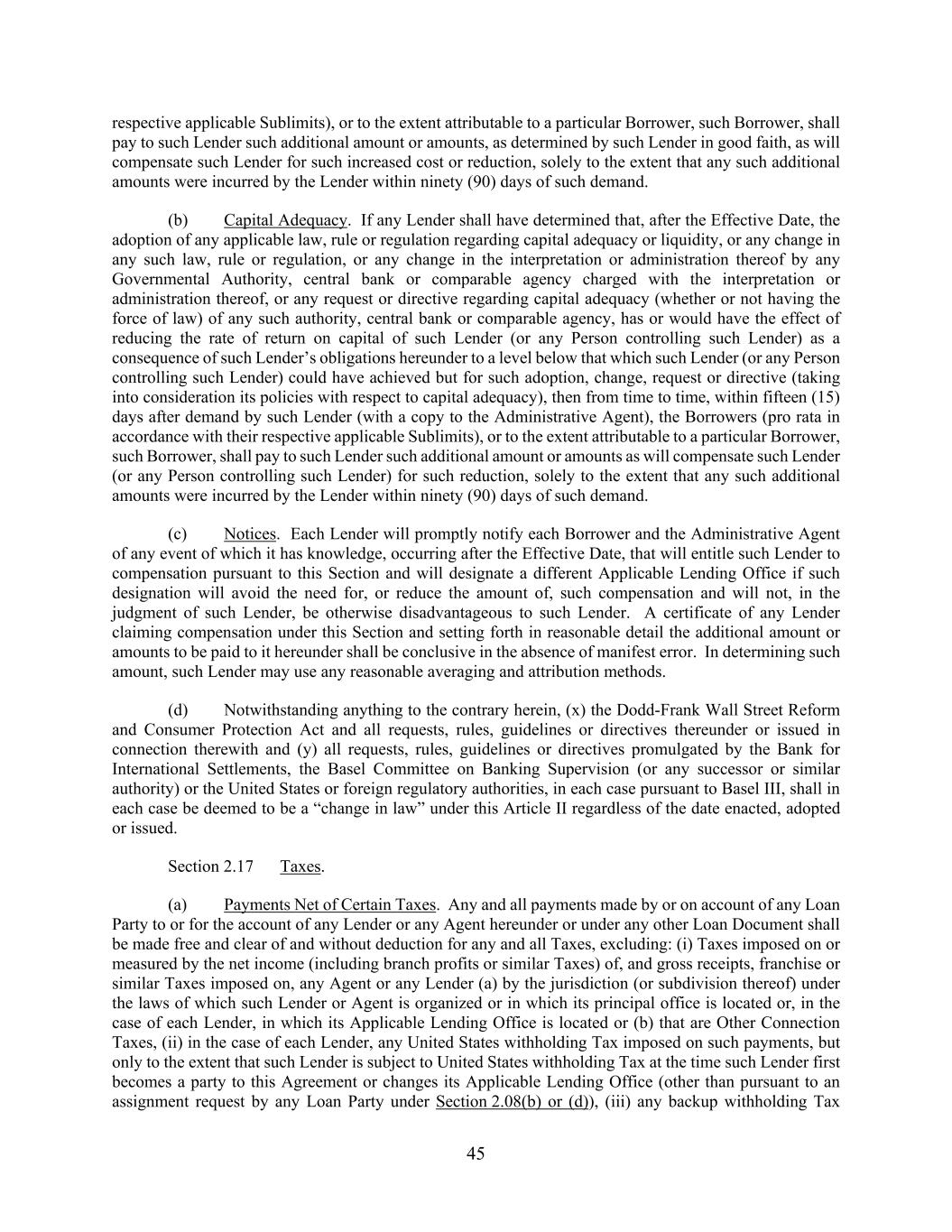 45 respective applicable Sublimits), or to the extent attributable to a particular Borrower, such Borrower, shall pay to such Lender such additional amount or amounts, as determined by such Lender in good faith, as will compensate such Lender for such increased cost or reduction, solely to the extent that any such additional amounts were incurred by the Lender within ninety (90) days of such demand. (b) Capital Adequacy. If any Lender shall have determined that, after the Effective Date, the adoption of any applicable law, rule or regulation regarding capital adequacy or liquidity, or any change in any such law, rule or regulation, or any change in the interpretation or administration thereof by any Governmental Authority, central bank or comparable agency charged with the interpretation or administration thereof, or any request or directive regarding capital adequacy (whether or not having the force of law) of any such authority, central bank or comparable agency, has or would have the effect of reducing the rate of return on capital of such Lender (or any Person controlling such Lender) as a consequence of such Lender’s obligations hereunder to a level below that which such Lender (or any Person controlling such Lender) could have achieved but for such adoption, change, request or directive (taking into consideration its policies with respect to capital adequacy), then from time to time, within fifteen (15) days after demand by such Lender (with a copy to the Administrative Agent), the Borrowers (pro rata in accordance with their respective applicable Sublimits), or to the extent attributable to a particular Borrower, such Borrower, shall pay to such Lender such additional amount or amounts as will compensate such Lender (or any Person controlling such Lender) for such reduction, solely to the extent that any such additional amounts were incurred by the Lender within ninety (90) days of such demand. (c) Notices. Each Lender will promptly notify each Borrower and the Administrative Agent of any event of which it has knowledge, occurring after the Effective Date, that will entitle such Lender to compensation pursuant to this Section and will designate a different Applicable Lending Office if such designation will avoid the need for, or reduce the amount of, such compensation and will not, in the judgment of such Lender, be otherwise disadvantageous to such Lender. A certificate of any Lender claiming compensation under this Section and setting forth in reasonable detail the additional amount or amounts to be paid to it hereunder shall be conclusive in the absence of manifest error. In determining such amount, such Lender may use any reasonable averaging and attribution methods. (d) Notwithstanding anything to the contrary herein, (x) the Dodd-Frank Wall Street Reform and Consumer Protection Act and all requests, rules, guidelines or directives thereunder or issued in connection therewith and (y) all requests, rules, guidelines or directives promulgated by the Bank for International Settlements, the Basel Committee on Banking Supervision (or any successor or similar authority) or the United States or foreign regulatory authorities, in each case pursuant to Basel III, shall in each case be deemed to be a “change in law” under this Article II regardless of the date enacted, adopted or issued. Section 2.17 Taxes. (a) Payments Net of Certain Taxes. Any and all payments made by or on account of any Loan Party to or for the account of any Lender or any Agent hereunder or under any other Loan Document shall be made free and clear of and without deduction for any and all Taxes, excluding: (i) Taxes imposed on or measured by the net income (including branch profits or similar Taxes) of, and gross receipts, franchise or similar Taxes imposed on, any Agent or any Lender (a) by the jurisdiction (or subdivision thereof) under the laws of which such Lender or Agent is organized or in which its principal office is located or, in the case of each Lender, in which its Applicable Lending Office is located or (b) that are Other Connection Taxes, (ii) in the case of each Lender, any United States withholding Tax imposed on such payments, but only to the extent that such Lender is subject to United States withholding Tax at the time such Lender first becomes a party to this Agreement or changes its Applicable Lending Office (other than pursuant to an assignment request by any Loan Party under Section 2.08(b) or (d)), (iii) any backup withholding Tax