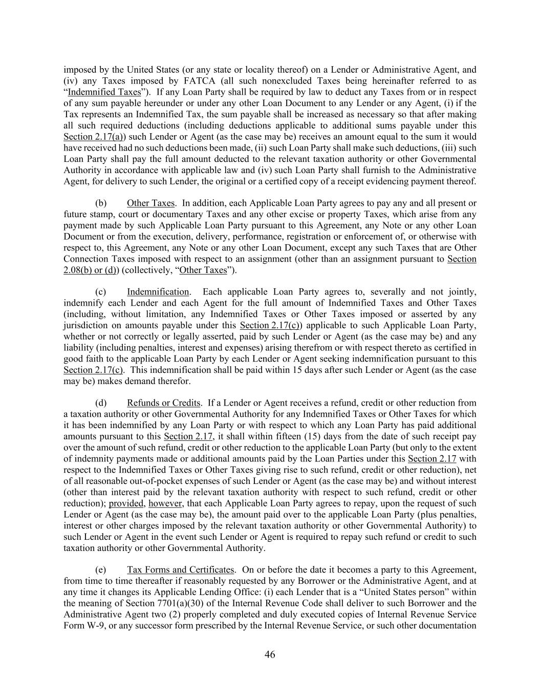 46 imposed by the United States (or any state or locality thereof) on a Lender or Administrative Agent, and (iv) any Taxes imposed by FATCA (all such nonexcluded Taxes being hereinafter referred to as “Indemnified Taxes”). If any Loan Party shall be required by law to deduct any Taxes from or in respect of any sum payable hereunder or under any other Loan Document to any Lender or any Agent, (i) if the Tax represents an Indemnified Tax, the sum payable shall be increased as necessary so that after making all such required deductions (including deductions applicable to additional sums payable under this Section 2.17(a)) such Lender or Agent (as the case may be) receives an amount equal to the sum it would have received had no such deductions been made, (ii) such Loan Party shall make such deductions, (iii) such Loan Party shall pay the full amount deducted to the relevant taxation authority or other Governmental Authority in accordance with applicable law and (iv) such Loan Party shall furnish to the Administrative Agent, for delivery to such Lender, the original or a certified copy of a receipt evidencing payment thereof. (b) Other Taxes. In addition, each Applicable Loan Party agrees to pay any and all present or future stamp, court or documentary Taxes and any other excise or property Taxes, which arise from any payment made by such Applicable Loan Party pursuant to this Agreement, any Note or any other Loan Document or from the execution, delivery, performance, registration or enforcement of, or otherwise with respect to, this Agreement, any Note or any other Loan Document, except any such Taxes that are Other Connection Taxes imposed with respect to an assignment (other than an assignment pursuant to Section 2.08(b) or (d)) (collectively, “Other Taxes”). (c) Indemnification. Each applicable Loan Party agrees to, severally and not jointly, indemnify each Lender and each Agent for the full amount of Indemnified Taxes and Other Taxes (including, without limitation, any Indemnified Taxes or Other Taxes imposed or asserted by any jurisdiction on amounts payable under this Section 2.17(c)) applicable to such Applicable Loan Party, whether or not correctly or legally asserted, paid by such Lender or Agent (as the case may be) and any liability (including penalties, interest and expenses) arising therefrom or with respect thereto as certified in good faith to the applicable Loan Party by each Lender or Agent seeking indemnification pursuant to this Section 2.17(c). This indemnification shall be paid within 15 days after such Lender or Agent (as the case may be) makes demand therefor. (d) Refunds or Credits. If a Lender or Agent receives a refund, credit or other reduction from a taxation authority or other Governmental Authority for any Indemnified Taxes or Other Taxes for which it has been indemnified by any Loan Party or with respect to which any Loan Party has paid additional amounts pursuant to this Section 2.17, it shall within fifteen (15) days from the date of such receipt pay over the amount of such refund, credit or other reduction to the applicable Loan Party (but only to the extent of indemnity payments made or additional amounts paid by the Loan Parties under this Section 2.17 with respect to the Indemnified Taxes or Other Taxes giving rise to such refund, credit or other reduction), net of all reasonable out-of-pocket expenses of such Lender or Agent (as the case may be) and without interest (other than interest paid by the relevant taxation authority with respect to such refund, credit or other reduction); provided, however, that each Applicable Loan Party agrees to repay, upon the request of such Lender or Agent (as the case may be), the amount paid over to the applicable Loan Party (plus penalties, interest or other charges imposed by the relevant taxation authority or other Governmental Authority) to such Lender or Agent in the event such Lender or Agent is required to repay such refund or credit to such taxation authority or other Governmental Authority. (e) Tax Forms and Certificates. On or before the date it becomes a party to this Agreement, from time to time thereafter if reasonably requested by any Borrower or the Administrative Agent, and at any time it changes its Applicable Lending Office: (i) each Lender that is a “United States person” within the meaning of Section 7701(a)(30) of the Internal Revenue Code shall deliver to such Borrower and the Administrative Agent two (2) properly completed and duly executed copies of Internal Revenue Service Form W-9, or any successor form prescribed by the Internal Revenue Service, or such other documentation