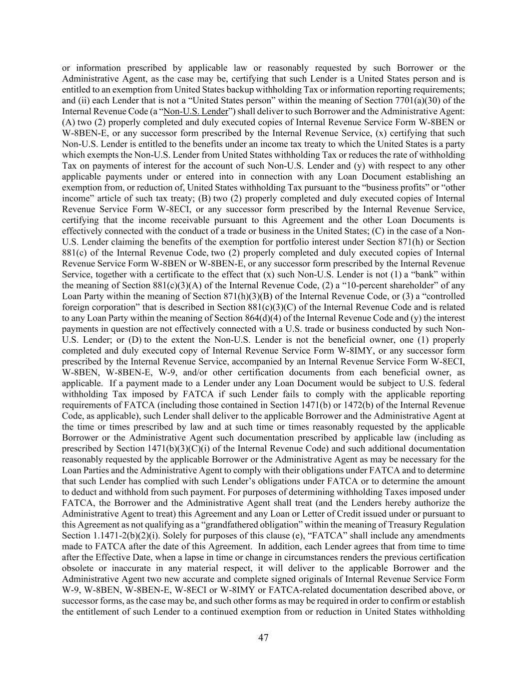 47 or information prescribed by applicable law or reasonably requested by such Borrower or the Administrative Agent, as the case may be, certifying that such Lender is a United States person and is entitled to an exemption from United States backup withholding Tax or information reporting requirements; and (ii) each Lender that is not a “United States person” within the meaning of Section 7701(a)(30) of the Internal Revenue Code (a “Non-U.S. Lender”) shall deliver to such Borrower and the Administrative Agent: (A) two (2) properly completed and duly executed copies of Internal Revenue Service Form W-8BEN or W-8BEN-E, or any successor form prescribed by the Internal Revenue Service, (x) certifying that such Non-U.S. Lender is entitled to the benefits under an income tax treaty to which the United States is a party which exempts the Non-U.S. Lender from United States withholding Tax or reduces the rate of withholding Tax on payments of interest for the account of such Non-U.S. Lender and (y) with respect to any other applicable payments under or entered into in connection with any Loan Document establishing an exemption from, or reduction of, United States withholding Tax pursuant to the “business profits” or “other income” article of such tax treaty; (B) two (2) properly completed and duly executed copies of Internal Revenue Service Form W-8ECI, or any successor form prescribed by the Internal Revenue Service, certifying that the income receivable pursuant to this Agreement and the other Loan Documents is effectively connected with the conduct of a trade or business in the United States; (C) in the case of a Non- U.S. Lender claiming the benefits of the exemption for portfolio interest under Section 871(h) or Section 881(c) of the Internal Revenue Code, two (2) properly completed and duly executed copies of Internal Revenue Service Form W-8BEN or W-8BEN-E, or any successor form prescribed by the Internal Revenue Service, together with a certificate to the effect that (x) such Non-U.S. Lender is not (1) a “bank” within the meaning of Section 881(c)(3)(A) of the Internal Revenue Code, (2) a “10-percent shareholder” of any Loan Party within the meaning of Section 871(h)(3)(B) of the Internal Revenue Code, or (3) a “controlled foreign corporation” that is described in Section 881(c)(3)(C) of the Internal Revenue Code and is related to any Loan Party within the meaning of Section 864(d)(4) of the Internal Revenue Code and (y) the interest payments in question are not effectively connected with a U.S. trade or business conducted by such Non- U.S. Lender; or (D) to the extent the Non-U.S. Lender is not the beneficial owner, one (1) properly completed and duly executed copy of Internal Revenue Service Form W-8IMY, or any successor form prescribed by the Internal Revenue Service, accompanied by an Internal Revenue Service Form W-8ECI, W-8BEN, W-8BEN-E, W-9, and/or other certification documents from each beneficial owner, as applicable. If a payment made to a Lender under any Loan Document would be subject to U.S. federal withholding Tax imposed by FATCA if such Lender fails to comply with the applicable reporting requirements of FATCA (including those contained in Section 1471(b) or 1472(b) of the Internal Revenue Code, as applicable), such Lender shall deliver to the applicable Borrower and the Administrative Agent at the time or times prescribed by law and at such time or times reasonably requested by the applicable Borrower or the Administrative Agent such documentation prescribed by applicable law (including as prescribed by Section 1471(b)(3)(C)(i) of the Internal Revenue Code) and such additional documentation reasonably requested by the applicable Borrower or the Administrative Agent as may be necessary for the Loan Parties and the Administrative Agent to comply with their obligations under FATCA and to determine that such Lender has complied with such Lender’s obligations under FATCA or to determine the amount to deduct and withhold from such payment. For purposes of determining withholding Taxes imposed under FATCA, the Borrower and the Administrative Agent shall treat (and the Lenders hereby authorize the Administrative Agent to treat) this Agreement and any Loan or Letter of Credit issued under or pursuant to this Agreement as not qualifying as a “grandfathered obligation” within the meaning of Treasury Regulation Section 1.1471-2(b)(2)(i). Solely for purposes of this clause (e), “FATCA” shall include any amendments made to FATCA after the date of this Agreement. In addition, each Lender agrees that from time to time after the Effective Date, when a lapse in time or change in circumstances renders the previous certification obsolete or inaccurate in any material respect, it will deliver to the applicable Borrower and the Administrative Agent two new accurate and complete signed originals of Internal Revenue Service Form W-9, W-8BEN, W-8BEN-E, W-8ECI or W-8IMY or FATCA-related documentation described above, or successor forms, as the case may be, and such other forms as may be required in order to confirm or establish the entitlement of such Lender to a continued exemption from or reduction in United States withholding