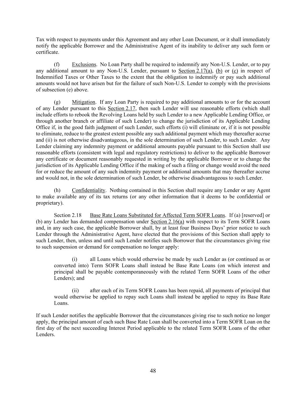48 Tax with respect to payments under this Agreement and any other Loan Document, or it shall immediately notify the applicable Borrower and the Administrative Agent of its inability to deliver any such form or certificate. (f) Exclusions. No Loan Party shall be required to indemnify any Non-U.S. Lender, or to pay any additional amount to any Non-U.S. Lender, pursuant to Section 2.17(a), (b) or (c) in respect of Indemnified Taxes or Other Taxes to the extent that the obligation to indemnify or pay such additional amounts would not have arisen but for the failure of such Non-U.S. Lender to comply with the provisions of subsection (e) above. (g) Mitigation. If any Loan Party is required to pay additional amounts to or for the account of any Lender pursuant to this Section 2.17, then such Lender will use reasonable efforts (which shall include efforts to rebook the Revolving Loans held by such Lender to a new Applicable Lending Office, or through another branch or affiliate of such Lender) to change the jurisdiction of its Applicable Lending Office if, in the good faith judgment of such Lender, such efforts (i) will eliminate or, if it is not possible to eliminate, reduce to the greatest extent possible any such additional payment which may thereafter accrue and (ii) is not otherwise disadvantageous, in the sole determination of such Lender, to such Lender. Any Lender claiming any indemnity payment or additional amounts payable pursuant to this Section shall use reasonable efforts (consistent with legal and regulatory restrictions) to deliver to the applicable Borrower any certificate or document reasonably requested in writing by the applicable Borrower or to change the jurisdiction of its Applicable Lending Office if the making of such a filing or change would avoid the need for or reduce the amount of any such indemnity payment or additional amounts that may thereafter accrue and would not, in the sole determination of such Lender, be otherwise disadvantageous to such Lender. (h) Confidentiality. Nothing contained in this Section shall require any Lender or any Agent to make available any of its tax returns (or any other information that it deems to be confidential or proprietary). Section 2.18 Base Rate Loans Substituted for Affected Term SOFR Loans. If (a) [reserved] or (b) any Lender has demanded compensation under Section 2.16(a) with respect to its Term SOFR Loans and, in any such case, the applicable Borrower shall, by at least four Business Days’ prior notice to such Lender through the Administrative Agent, have elected that the provisions of this Section shall apply to such Lender, then, unless and until such Lender notifies such Borrower that the circumstances giving rise to such suspension or demand for compensation no longer apply: (i) all Loans which would otherwise be made by such Lender as (or continued as or converted into) Term SOFR Loans shall instead be Base Rate Loans (on which interest and principal shall be payable contemporaneously with the related Term SOFR Loans of the other Lenders); and (ii) after each of its Term SOFR Loans has been repaid, all payments of principal that would otherwise be applied to repay such Loans shall instead be applied to repay its Base Rate Loans. If such Lender notifies the applicable Borrower that the circumstances giving rise to such notice no longer apply, the principal amount of each such Base Rate Loan shall be converted into a Term SOFR Loan on the first day of the next succeeding Interest Period applicable to the related Term SOFR Loans of the other Lenders.