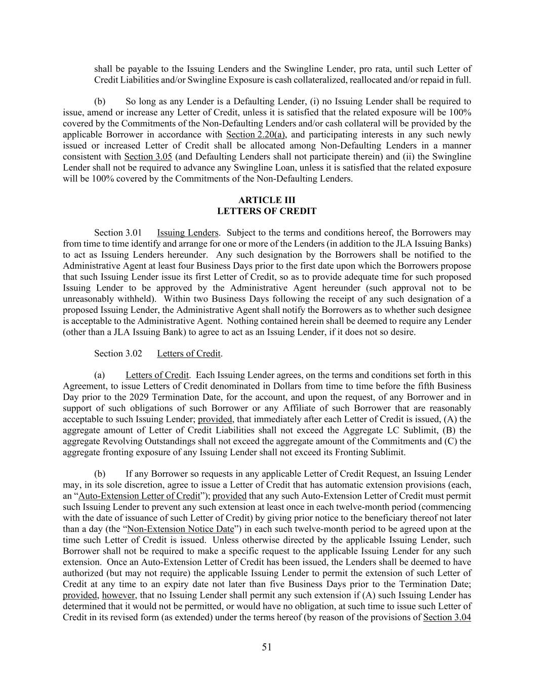 51 shall be payable to the Issuing Lenders and the Swingline Lender, pro rata, until such Letter of Credit Liabilities and/or Swingline Exposure is cash collateralized, reallocated and/or repaid in full. (b) So long as any Lender is a Defaulting Lender, (i) no Issuing Lender shall be required to issue, amend or increase any Letter of Credit, unless it is satisfied that the related exposure will be 100% covered by the Commitments of the Non-Defaulting Lenders and/or cash collateral will be provided by the applicable Borrower in accordance with Section 2.20(a), and participating interests in any such newly issued or increased Letter of Credit shall be allocated among Non-Defaulting Lenders in a manner consistent with Section 3.05 (and Defaulting Lenders shall not participate therein) and (ii) the Swingline Lender shall not be required to advance any Swingline Loan, unless it is satisfied that the related exposure will be 100% covered by the Commitments of the Non-Defaulting Lenders. ARTICLE III LETTERS OF CREDIT Section 3.01 Issuing Lenders. Subject to the terms and conditions hereof, the Borrowers may from time to time identify and arrange for one or more of the Lenders (in addition to the JLA Issuing Banks) to act as Issuing Lenders hereunder. Any such designation by the Borrowers shall be notified to the Administrative Agent at least four Business Days prior to the first date upon which the Borrowers propose that such Issuing Lender issue its first Letter of Credit, so as to provide adequate time for such proposed Issuing Lender to be approved by the Administrative Agent hereunder (such approval not to be unreasonably withheld). Within two Business Days following the receipt of any such designation of a proposed Issuing Lender, the Administrative Agent shall notify the Borrowers as to whether such designee is acceptable to the Administrative Agent. Nothing contained herein shall be deemed to require any Lender (other than a JLA Issuing Bank) to agree to act as an Issuing Lender, if it does not so desire. Section 3.02 Letters of Credit. (a) Letters of Credit. Each Issuing Lender agrees, on the terms and conditions set forth in this Agreement, to issue Letters of Credit denominated in Dollars from time to time before the fifth Business Day prior to the 2029 Termination Date, for the account, and upon the request, of any Borrower and in support of such obligations of such Borrower or any Affiliate of such Borrower that are reasonably acceptable to such Issuing Lender; provided, that immediately after each Letter of Credit is issued, (A) the aggregate amount of Letter of Credit Liabilities shall not exceed the Aggregate LC Sublimit, (B) the aggregate Revolving Outstandings shall not exceed the aggregate amount of the Commitments and (C) the aggregate fronting exposure of any Issuing Lender shall not exceed its Fronting Sublimit. (b) If any Borrower so requests in any applicable Letter of Credit Request, an Issuing Lender may, in its sole discretion, agree to issue a Letter of Credit that has automatic extension provisions (each, an “Auto-Extension Letter of Credit”); provided that any such Auto-Extension Letter of Credit must permit such Issuing Lender to prevent any such extension at least once in each twelve-month period (commencing with the date of issuance of such Letter of Credit) by giving prior notice to the beneficiary thereof not later than a day (the “Non-Extension Notice Date”) in each such twelve-month period to be agreed upon at the time such Letter of Credit is issued. Unless otherwise directed by the applicable Issuing Lender, such Borrower shall not be required to make a specific request to the applicable Issuing Lender for any such extension. Once an Auto-Extension Letter of Credit has been issued, the Lenders shall be deemed to have authorized (but may not require) the applicable Issuing Lender to permit the extension of such Letter of Credit at any time to an expiry date not later than five Business Days prior to the Termination Date; provided, however, that no Issuing Lender shall permit any such extension if (A) such Issuing Lender has determined that it would not be permitted, or would have no obligation, at such time to issue such Letter of Credit in its revised form (as extended) under the terms hereof (by reason of the provisions of Section 3.04