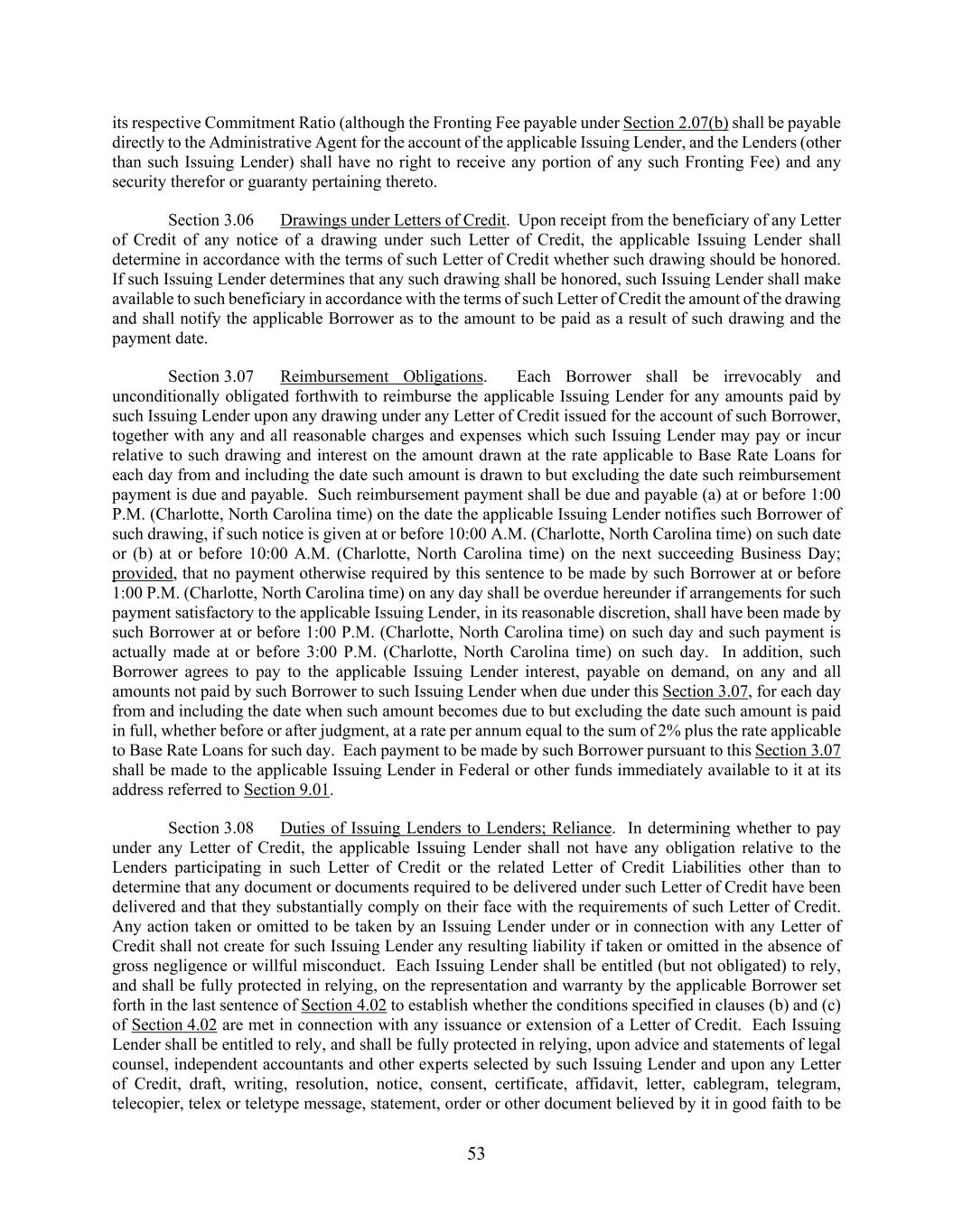 53 its respective Commitment Ratio (although the Fronting Fee payable under Section 2.07(b) shall be payable directly to the Administrative Agent for the account of the applicable Issuing Lender, and the Lenders (other than such Issuing Lender) shall have no right to receive any portion of any such Fronting Fee) and any security therefor or guaranty pertaining thereto. Section 3.06 Drawings under Letters of Credit. Upon receipt from the beneficiary of any Letter of Credit of any notice of a drawing under such Letter of Credit, the applicable Issuing Lender shall determine in accordance with the terms of such Letter of Credit whether such drawing should be honored. If such Issuing Lender determines that any such drawing shall be honored, such Issuing Lender shall make available to such beneficiary in accordance with the terms of such Letter of Credit the amount of the drawing and shall notify the applicable Borrower as to the amount to be paid as a result of such drawing and the payment date. Section 3.07 Reimbursement Obligations. Each Borrower shall be irrevocably and unconditionally obligated forthwith to reimburse the applicable Issuing Lender for any amounts paid by such Issuing Lender upon any drawing under any Letter of Credit issued for the account of such Borrower, together with any and all reasonable charges and expenses which such Issuing Lender may pay or incur relative to such drawing and interest on the amount drawn at the rate applicable to Base Rate Loans for each day from and including the date such amount is drawn to but excluding the date such reimbursement payment is due and payable. Such reimbursement payment shall be due and payable (a) at or before 1:00 P.M. (Charlotte, North Carolina time) on the date the applicable Issuing Lender notifies such Borrower of such drawing, if such notice is given at or before 10:00 A.M. (Charlotte, North Carolina time) on such date or (b) at or before 10:00 A.M. (Charlotte, North Carolina time) on the next succeeding Business Day; provided, that no payment otherwise required by this sentence to be made by such Borrower at or before 1:00 P.M. (Charlotte, North Carolina time) on any day shall be overdue hereunder if arrangements for such payment satisfactory to the applicable Issuing Lender, in its reasonable discretion, shall have been made by such Borrower at or before 1:00 P.M. (Charlotte, North Carolina time) on such day and such payment is actually made at or before 3:00 P.M. (Charlotte, North Carolina time) on such day. In addition, such Borrower agrees to pay to the applicable Issuing Lender interest, payable on demand, on any and all amounts not paid by such Borrower to such Issuing Lender when due under this Section 3.07, for each day from and including the date when such amount becomes due to but excluding the date such amount is paid in full, whether before or after judgment, at a rate per annum equal to the sum of 2% plus the rate applicable to Base Rate Loans for such day. Each payment to be made by such Borrower pursuant to this Section 3.07 shall be made to the applicable Issuing Lender in Federal or other funds immediately available to it at its address referred to Section 9.01. Section 3.08 Duties of Issuing Lenders to Lenders; Reliance. In determining whether to pay under any Letter of Credit, the applicable Issuing Lender shall not have any obligation relative to the Lenders participating in such Letter of Credit or the related Letter of Credit Liabilities other than to determine that any document or documents required to be delivered under such Letter of Credit have been delivered and that they substantially comply on their face with the requirements of such Letter of Credit. Any action taken or omitted to be taken by an Issuing Lender under or in connection with any Letter of Credit shall not create for such Issuing Lender any resulting liability if taken or omitted in the absence of gross negligence or willful misconduct. Each Issuing Lender shall be entitled (but not obligated) to rely, and shall be fully protected in relying, on the representation and warranty by the applicable Borrower set forth in the last sentence of Section 4.02 to establish whether the conditions specified in clauses (b) and (c) of Section 4.02 are met in connection with any issuance or extension of a Letter of Credit. Each Issuing Lender shall be entitled to rely, and shall be fully protected in relying, upon advice and statements of legal counsel, independent accountants and other experts selected by such Issuing Lender and upon any Letter of Credit, draft, writing, resolution, notice, consent, certificate, affidavit, letter, cablegram, telegram, telecopier, telex or teletype message, statement, order or other document believed by it in good faith to be