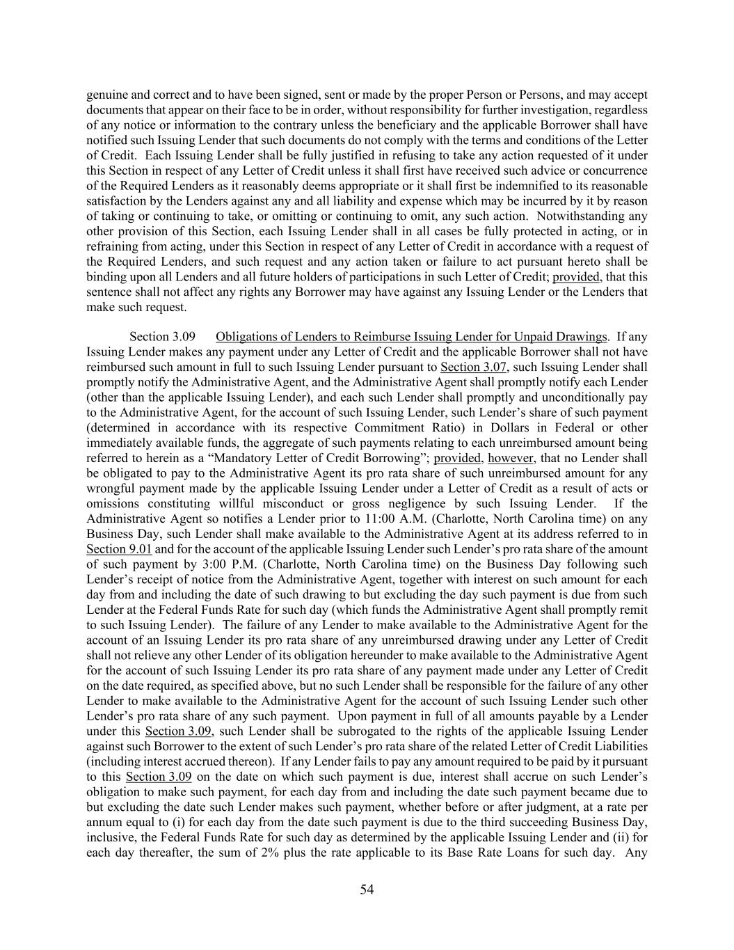 54 genuine and correct and to have been signed, sent or made by the proper Person or Persons, and may accept documents that appear on their face to be in order, without responsibility for further investigation, regardless of any notice or information to the contrary unless the beneficiary and the applicable Borrower shall have notified such Issuing Lender that such documents do not comply with the terms and conditions of the Letter of Credit. Each Issuing Lender shall be fully justified in refusing to take any action requested of it under this Section in respect of any Letter of Credit unless it shall first have received such advice or concurrence of the Required Lenders as it reasonably deems appropriate or it shall first be indemnified to its reasonable satisfaction by the Lenders against any and all liability and expense which may be incurred by it by reason of taking or continuing to take, or omitting or continuing to omit, any such action. Notwithstanding any other provision of this Section, each Issuing Lender shall in all cases be fully protected in acting, or in refraining from acting, under this Section in respect of any Letter of Credit in accordance with a request of the Required Lenders, and such request and any action taken or failure to act pursuant hereto shall be binding upon all Lenders and all future holders of participations in such Letter of Credit; provided, that this sentence shall not affect any rights any Borrower may have against any Issuing Lender or the Lenders that make such request. Section 3.09 Obligations of Lenders to Reimburse Issuing Lender for Unpaid Drawings. If any Issuing Lender makes any payment under any Letter of Credit and the applicable Borrower shall not have reimbursed such amount in full to such Issuing Lender pursuant to Section 3.07, such Issuing Lender shall promptly notify the Administrative Agent, and the Administrative Agent shall promptly notify each Lender (other than the applicable Issuing Lender), and each such Lender shall promptly and unconditionally pay to the Administrative Agent, for the account of such Issuing Lender, such Lender’s share of such payment (determined in accordance with its respective Commitment Ratio) in Dollars in Federal or other immediately available funds, the aggregate of such payments relating to each unreimbursed amount being referred to herein as a “Mandatory Letter of Credit Borrowing”; provided, however, that no Lender shall be obligated to pay to the Administrative Agent its pro rata share of such unreimbursed amount for any wrongful payment made by the applicable Issuing Lender under a Letter of Credit as a result of acts or omissions constituting willful misconduct or gross negligence by such Issuing Lender. If the Administrative Agent so notifies a Lender prior to 11:00 A.M. (Charlotte, North Carolina time) on any Business Day, such Lender shall make available to the Administrative Agent at its address referred to in Section 9.01 and for the account of the applicable Issuing Lender such Lender’s pro rata share of the amount of such payment by 3:00 P.M. (Charlotte, North Carolina time) on the Business Day following such Lender’s receipt of notice from the Administrative Agent, together with interest on such amount for each day from and including the date of such drawing to but excluding the day such payment is due from such Lender at the Federal Funds Rate for such day (which funds the Administrative Agent shall promptly remit to such Issuing Lender). The failure of any Lender to make available to the Administrative Agent for the account of an Issuing Lender its pro rata share of any unreimbursed drawing under any Letter of Credit shall not relieve any other Lender of its obligation hereunder to make available to the Administrative Agent for the account of such Issuing Lender its pro rata share of any payment made under any Letter of Credit on the date required, as specified above, but no such Lender shall be responsible for the failure of any other Lender to make available to the Administrative Agent for the account of such Issuing Lender such other Lender’s pro rata share of any such payment. Upon payment in full of all amounts payable by a Lender under this Section 3.09, such Lender shall be subrogated to the rights of the applicable Issuing Lender against such Borrower to the extent of such Lender’s pro rata share of the related Letter of Credit Liabilities (including interest accrued thereon). If any Lender fails to pay any amount required to be paid by it pursuant to this Section 3.09 on the date on which such payment is due, interest shall accrue on such Lender’s obligation to make such payment, for each day from and including the date such payment became due to but excluding the date such Lender makes such payment, whether before or after judgment, at a rate per annum equal to (i) for each day from the date such payment is due to the third succeeding Business Day, inclusive, the Federal Funds Rate for such day as determined by the applicable Issuing Lender and (ii) for each day thereafter, the sum of 2% plus the rate applicable to its Base Rate Loans for such day. Any