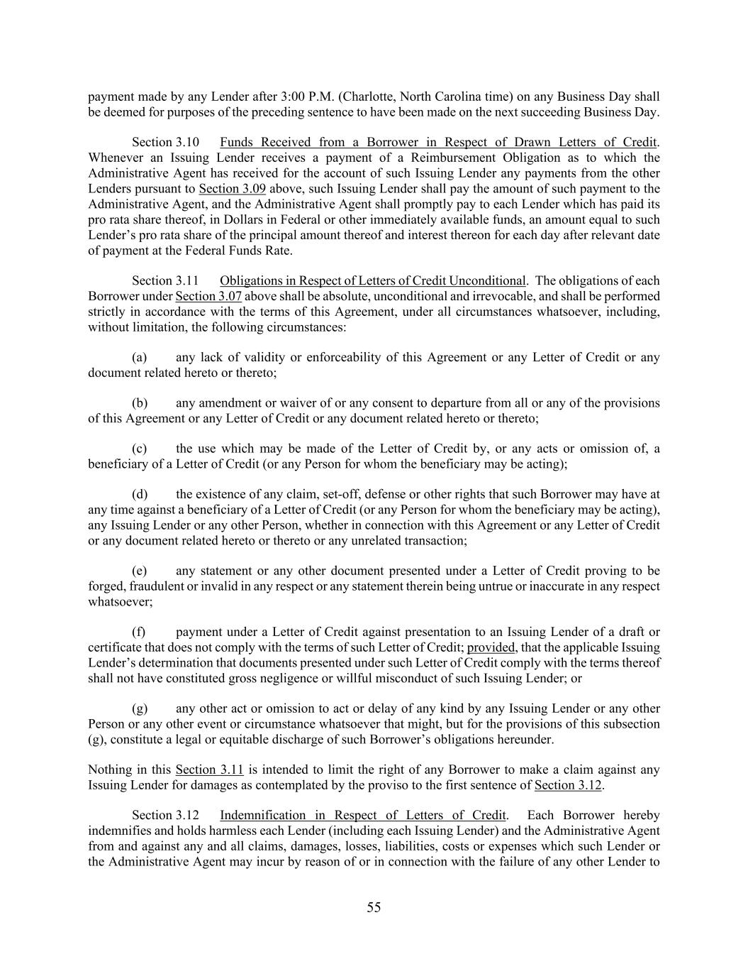 55 payment made by any Lender after 3:00 P.M. (Charlotte, North Carolina time) on any Business Day shall be deemed for purposes of the preceding sentence to have been made on the next succeeding Business Day. Section 3.10 Funds Received from a Borrower in Respect of Drawn Letters of Credit. Whenever an Issuing Lender receives a payment of a Reimbursement Obligation as to which the Administrative Agent has received for the account of such Issuing Lender any payments from the other Lenders pursuant to Section 3.09 above, such Issuing Lender shall pay the amount of such payment to the Administrative Agent, and the Administrative Agent shall promptly pay to each Lender which has paid its pro rata share thereof, in Dollars in Federal or other immediately available funds, an amount equal to such Lender’s pro rata share of the principal amount thereof and interest thereon for each day after relevant date of payment at the Federal Funds Rate. Section 3.11 Obligations in Respect of Letters of Credit Unconditional. The obligations of each Borrower under Section 3.07 above shall be absolute, unconditional and irrevocable, and shall be performed strictly in accordance with the terms of this Agreement, under all circumstances whatsoever, including, without limitation, the following circumstances: (a) any lack of validity or enforceability of this Agreement or any Letter of Credit or any document related hereto or thereto; (b) any amendment or waiver of or any consent to departure from all or any of the provisions of this Agreement or any Letter of Credit or any document related hereto or thereto; (c) the use which may be made of the Letter of Credit by, or any acts or omission of, a beneficiary of a Letter of Credit (or any Person for whom the beneficiary may be acting); (d) the existence of any claim, set-off, defense or other rights that such Borrower may have at any time against a beneficiary of a Letter of Credit (or any Person for whom the beneficiary may be acting), any Issuing Lender or any other Person, whether in connection with this Agreement or any Letter of Credit or any document related hereto or thereto or any unrelated transaction; (e) any statement or any other document presented under a Letter of Credit proving to be forged, fraudulent or invalid in any respect or any statement therein being untrue or inaccurate in any respect whatsoever; (f) payment under a Letter of Credit against presentation to an Issuing Lender of a draft or certificate that does not comply with the terms of such Letter of Credit; provided, that the applicable Issuing Lender’s determination that documents presented under such Letter of Credit comply with the terms thereof shall not have constituted gross negligence or willful misconduct of such Issuing Lender; or (g) any other act or omission to act or delay of any kind by any Issuing Lender or any other Person or any other event or circumstance whatsoever that might, but for the provisions of this subsection (g), constitute a legal or equitable discharge of such Borrower’s obligations hereunder. Nothing in this Section 3.11 is intended to limit the right of any Borrower to make a claim against any Issuing Lender for damages as contemplated by the proviso to the first sentence of Section 3.12. Section 3.12 Indemnification in Respect of Letters of Credit. Each Borrower hereby indemnifies and holds harmless each Lender (including each Issuing Lender) and the Administrative Agent from and against any and all claims, damages, losses, liabilities, costs or expenses which such Lender or the Administrative Agent may incur by reason of or in connection with the failure of any other Lender to