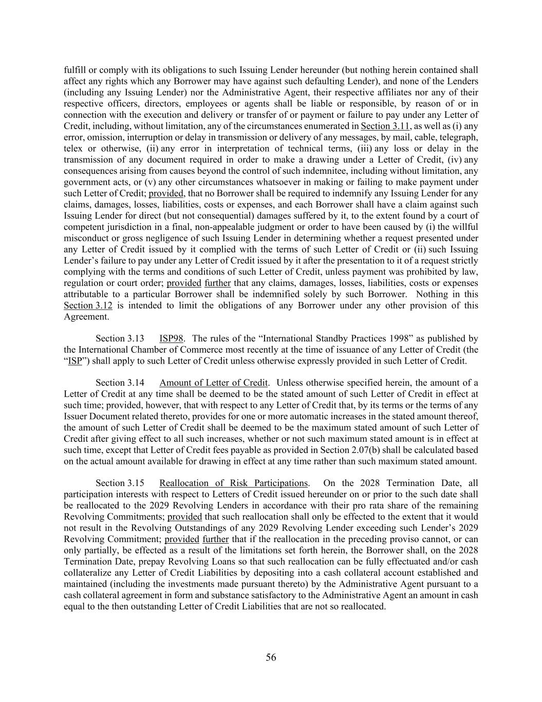 56 fulfill or comply with its obligations to such Issuing Lender hereunder (but nothing herein contained shall affect any rights which any Borrower may have against such defaulting Lender), and none of the Lenders (including any Issuing Lender) nor the Administrative Agent, their respective affiliates nor any of their respective officers, directors, employees or agents shall be liable or responsible, by reason of or in connection with the execution and delivery or transfer of or payment or failure to pay under any Letter of Credit, including, without limitation, any of the circumstances enumerated in Section 3.11, as well as (i) any error, omission, interruption or delay in transmission or delivery of any messages, by mail, cable, telegraph, telex or otherwise, (ii) any error in interpretation of technical terms, (iii) any loss or delay in the transmission of any document required in order to make a drawing under a Letter of Credit, (iv) any consequences arising from causes beyond the control of such indemnitee, including without limitation, any government acts, or (v) any other circumstances whatsoever in making or failing to make payment under such Letter of Credit; provided, that no Borrower shall be required to indemnify any Issuing Lender for any claims, damages, losses, liabilities, costs or expenses, and each Borrower shall have a claim against such Issuing Lender for direct (but not consequential) damages suffered by it, to the extent found by a court of competent jurisdiction in a final, non-appealable judgment or order to have been caused by (i) the willful misconduct or gross negligence of such Issuing Lender in determining whether a request presented under any Letter of Credit issued by it complied with the terms of such Letter of Credit or (ii) such Issuing Lender’s failure to pay under any Letter of Credit issued by it after the presentation to it of a request strictly complying with the terms and conditions of such Letter of Credit, unless payment was prohibited by law, regulation or court order; provided further that any claims, damages, losses, liabilities, costs or expenses attributable to a particular Borrower shall be indemnified solely by such Borrower. Nothing in this Section 3.12 is intended to limit the obligations of any Borrower under any other provision of this Agreement. Section 3.13 ISP98. The rules of the “International Standby Practices 1998” as published by the International Chamber of Commerce most recently at the time of issuance of any Letter of Credit (the “ISP”) shall apply to such Letter of Credit unless otherwise expressly provided in such Letter of Credit. Section 3.14 Amount of Letter of Credit. Unless otherwise specified herein, the amount of a Letter of Credit at any time shall be deemed to be the stated amount of such Letter of Credit in effect at such time; provided, however, that with respect to any Letter of Credit that, by its terms or the terms of any Issuer Document related thereto, provides for one or more automatic increases in the stated amount thereof, the amount of such Letter of Credit shall be deemed to be the maximum stated amount of such Letter of Credit after giving effect to all such increases, whether or not such maximum stated amount is in effect at such time, except that Letter of Credit fees payable as provided in Section 2.07(b) shall be calculated based on the actual amount available for drawing in effect at any time rather than such maximum stated amount. Section 3.15 Reallocation of Risk Participations. On the 2028 Termination Date, all participation interests with respect to Letters of Credit issued hereunder on or prior to the such date shall be reallocated to the 2029 Revolving Lenders in accordance with their pro rata share of the remaining Revolving Commitments; provided that such reallocation shall only be effected to the extent that it would not result in the Revolving Outstandings of any 2029 Revolving Lender exceeding such Lender’s 2029 Revolving Commitment; provided further that if the reallocation in the preceding proviso cannot, or can only partially, be effected as a result of the limitations set forth herein, the Borrower shall, on the 2028 Termination Date, prepay Revolving Loans so that such reallocation can be fully effectuated and/or cash collateralize any Letter of Credit Liabilities by depositing into a cash collateral account established and maintained (including the investments made pursuant thereto) by the Administrative Agent pursuant to a cash collateral agreement in form and substance satisfactory to the Administrative Agent an amount in cash equal to the then outstanding Letter of Credit Liabilities that are not so reallocated.