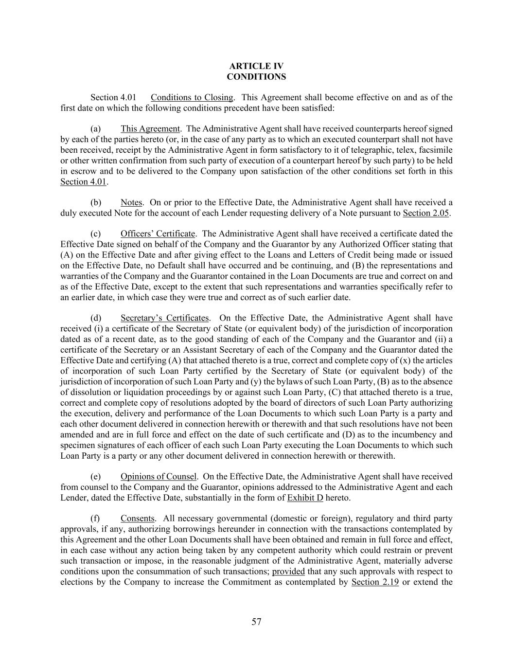 57 ARTICLE IV CONDITIONS Section 4.01 Conditions to Closing. This Agreement shall become effective on and as of the first date on which the following conditions precedent have been satisfied: (a) This Agreement. The Administrative Agent shall have received counterparts hereof signed by each of the parties hereto (or, in the case of any party as to which an executed counterpart shall not have been received, receipt by the Administrative Agent in form satisfactory to it of telegraphic, telex, facsimile or other written confirmation from such party of execution of a counterpart hereof by such party) to be held in escrow and to be delivered to the Company upon satisfaction of the other conditions set forth in this Section 4.01. (b) Notes. On or prior to the Effective Date, the Administrative Agent shall have received a duly executed Note for the account of each Lender requesting delivery of a Note pursuant to Section 2.05. (c) Officers’ Certificate. The Administrative Agent shall have received a certificate dated the Effective Date signed on behalf of the Company and the Guarantor by any Authorized Officer stating that (A) on the Effective Date and after giving effect to the Loans and Letters of Credit being made or issued on the Effective Date, no Default shall have occurred and be continuing, and (B) the representations and warranties of the Company and the Guarantor contained in the Loan Documents are true and correct on and as of the Effective Date, except to the extent that such representations and warranties specifically refer to an earlier date, in which case they were true and correct as of such earlier date. (d) Secretary’s Certificates. On the Effective Date, the Administrative Agent shall have received (i) a certificate of the Secretary of State (or equivalent body) of the jurisdiction of incorporation dated as of a recent date, as to the good standing of each of the Company and the Guarantor and (ii) a certificate of the Secretary or an Assistant Secretary of each of the Company and the Guarantor dated the Effective Date and certifying (A) that attached thereto is a true, correct and complete copy of (x) the articles of incorporation of such Loan Party certified by the Secretary of State (or equivalent body) of the jurisdiction of incorporation of such Loan Party and (y) the bylaws of such Loan Party, (B) as to the absence of dissolution or liquidation proceedings by or against such Loan Party, (C) that attached thereto is a true, correct and complete copy of resolutions adopted by the board of directors of such Loan Party authorizing the execution, delivery and performance of the Loan Documents to which such Loan Party is a party and each other document delivered in connection herewith or therewith and that such resolutions have not been amended and are in full force and effect on the date of such certificate and (D) as to the incumbency and specimen signatures of each officer of each such Loan Party executing the Loan Documents to which such Loan Party is a party or any other document delivered in connection herewith or therewith. (e) Opinions of Counsel. On the Effective Date, the Administrative Agent shall have received from counsel to the Company and the Guarantor, opinions addressed to the Administrative Agent and each Lender, dated the Effective Date, substantially in the form of Exhibit D hereto. (f) Consents. All necessary governmental (domestic or foreign), regulatory and third party approvals, if any, authorizing borrowings hereunder in connection with the transactions contemplated by this Agreement and the other Loan Documents shall have been obtained and remain in full force and effect, in each case without any action being taken by any competent authority which could restrain or prevent such transaction or impose, in the reasonable judgment of the Administrative Agent, materially adverse conditions upon the consummation of such transactions; provided that any such approvals with respect to elections by the Company to increase the Commitment as contemplated by Section 2.19 or extend the
