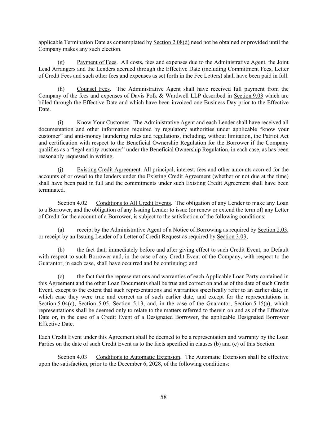 58 applicable Termination Date as contemplated by Section 2.08(d) need not be obtained or provided until the Company makes any such election. (g) Payment of Fees. All costs, fees and expenses due to the Administrative Agent, the Joint Lead Arrangers and the Lenders accrued through the Effective Date (including Commitment Fees, Letter of Credit Fees and such other fees and expenses as set forth in the Fee Letters) shall have been paid in full. (h) Counsel Fees. The Administrative Agent shall have received full payment from the Company of the fees and expenses of Davis Polk & Wardwell LLP described in Section 9.03 which are billed through the Effective Date and which have been invoiced one Business Day prior to the Effective Date. (i) Know Your Customer. The Administrative Agent and each Lender shall have received all documentation and other information required by regulatory authorities under applicable “know your customer” and anti-money laundering rules and regulations, including, without limitation, the Patriot Act and certification with respect to the Beneficial Ownership Regulation for the Borrower if the Company qualifies as a “legal entity customer” under the Beneficial Ownership Regulation, in each case, as has been reasonably requested in writing. (j) Existing Credit Agreement. All principal, interest, fees and other amounts accrued for the accounts of or owed to the lenders under the Existing Credit Agreement (whether or not due at the time) shall have been paid in full and the commitments under such Existing Credit Agreement shall have been terminated. Section 4.02 Conditions to All Credit Events. The obligation of any Lender to make any Loan to a Borrower, and the obligation of any Issuing Lender to issue (or renew or extend the term of) any Letter of Credit for the account of a Borrower, is subject to the satisfaction of the following conditions: (a) receipt by the Administrative Agent of a Notice of Borrowing as required by Section 2.03, or receipt by an Issuing Lender of a Letter of Credit Request as required by Section 3.03; (b) the fact that, immediately before and after giving effect to such Credit Event, no Default with respect to such Borrower and, in the case of any Credit Event of the Company, with respect to the Guarantor, in each case, shall have occurred and be continuing; and (c) the fact that the representations and warranties of each Applicable Loan Party contained in this Agreement and the other Loan Documents shall be true and correct on and as of the date of such Credit Event, except to the extent that such representations and warranties specifically refer to an earlier date, in which case they were true and correct as of such earlier date, and except for the representations in Section 5.04(c), Section 5.05, Section 5.13, and, in the case of the Guarantor, Section 5.15(a), which representations shall be deemed only to relate to the matters referred to therein on and as of the Effective Date or, in the case of a Credit Event of a Designated Borrower, the applicable Designated Borrower Effective Date. Each Credit Event under this Agreement shall be deemed to be a representation and warranty by the Loan Parties on the date of such Credit Event as to the facts specified in clauses (b) and (c) of this Section. Section 4.03 Conditions to Automatic Extension. The Automatic Extension shall be effective upon the satisfaction, prior to the December 6, 2028, of the following conditions: