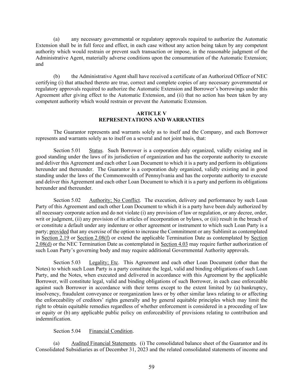 59 (a) any necessary governmental or regulatory approvals required to authorize the Automatic Extension shall be in full force and effect, in each case without any action being taken by any competent authority which would restrain or prevent such transaction or impose, in the reasonable judgment of the Administrative Agent, materially adverse conditions upon the consummation of the Automatic Extension; and (b) the Administrative Agent shall have received a certificate of an Authorized Officer of NEC certifying (i) that attached thereto are true, correct and complete copies of any necessary governmental or regulatory approvals required to authorize the Automatic Extension and Borrower’s borrowings under this Agreement after giving effect to the Automatic Extension, and (ii) that no action has been taken by any competent authority which would restrain or prevent the Automatic Extension. ARTICLE V REPRESENTATIONS AND WARRANTIES The Guarantor represents and warrants solely as to itself and the Company, and each Borrower represents and warrants solely as to itself on a several and not joint basis, that: Section 5.01 Status. Such Borrower is a corporation duly organized, validly existing and in good standing under the laws of its jurisdiction of organization and has the corporate authority to execute and deliver this Agreement and each other Loan Document to which it is a party and perform its obligations hereunder and thereunder. The Guarantor is a corporation duly organized, validly existing and in good standing under the laws of the Commonwealth of Pennsylvania and has the corporate authority to execute and deliver this Agreement and each other Loan Document to which it is a party and perform its obligations hereunder and thereunder. Section 5.02 Authority; No Conflict. The execution, delivery and performance by such Loan Party of this Agreement and each other Loan Document to which it is a party have been duly authorized by all necessary corporate action and do not violate (i) any provision of law or regulation, or any decree, order, writ or judgment, (ii) any provision of its articles of incorporation or bylaws, or (iii) result in the breach of or constitute a default under any indenture or other agreement or instrument to which such Loan Party is a party; provided that any exercise of the option to increase the Commitment or any Sublimit as contemplated in Section 2.19 or Section 2.08(f) or extend the applicable Termination Date as contemplated by Section 2.08(d) or the NEC Termination Date as contemplated in Section 4.03 may require further authorization of such Loan Party’s governing body and may require additional Governmental Authority approvals. Section 5.03 Legality; Etc. This Agreement and each other Loan Document (other than the Notes) to which such Loan Party is a party constitute the legal, valid and binding obligations of such Loan Party, and the Notes, when executed and delivered in accordance with this Agreement by the applicable Borrower, will constitute legal, valid and binding obligations of such Borrower, in each case enforceable against such Borrower in accordance with their terms except to the extent limited by (a) bankruptcy, insolvency, fraudulent conveyance or reorganization laws or by other similar laws relating to or affecting the enforceability of creditors’ rights generally and by general equitable principles which may limit the right to obtain equitable remedies regardless of whether enforcement is considered in a proceeding of law or equity or (b) any applicable public policy on enforceability of provisions relating to contribution and indemnification. Section 5.04 Financial Condition. (a) Audited Financial Statements. (i) The consolidated balance sheet of the Guarantor and its Consolidated Subsidiaries as of December 31, 2023 and the related consolidated statements of income and