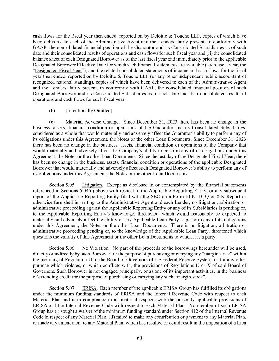 60 cash flows for the fiscal year then ended, reported on by Deloitte & Touche LLP, copies of which have been delivered to each of the Administrative Agent and the Lenders, fairly present, in conformity with GAAP, the consolidated financial position of the Guarantor and its Consolidated Subsidiaries as of such date and their consolidated results of operations and cash flows for such fiscal year and (ii) the consolidated balance sheet of each Designated Borrower as of the last fiscal year end immediately prior to the applicable Designated Borrower Effective Date for which such financial statements are available (such fiscal year, the “Designated Fiscal Year”), and the related consolidated statements of income and cash flows for the fiscal year then ended, reported on by Deloitte & Touche LLP (or any other independent public accountant of recognized national standing), copies of which have been delivered to each of the Administrative Agent and the Lenders, fairly present, in conformity with GAAP, the consolidated financial position of such Designated Borrower and its Consolidated Subsidiaries as of such date and their consolidated results of operations and cash flows for such fiscal year. (b) [Intentionally Omitted]. (c) Material Adverse Change. Since December 31, 2023 there has been no change in the business, assets, financial condition or operations of the Guarantor and its Consolidated Subsidiaries, considered as a whole that would materially and adversely affect the Guarantor’s ability to perform any of its obligations under this Agreement, the Notes or the other Loan Documents. Since December 31, 2023 there has been no change in the business, assets, financial condition or operations of the Company that would materially and adversely affect the Company’s ability to perform any of its obligations under this Agreement, the Notes or the other Loan Documents. Since the last day of the Designated Fiscal Year, there has been no change in the business, assets, financial condition or operations of the applicable Designated Borrower that would materially and adversely affect such Designated Borrower’s ability to perform any of its obligations under this Agreement, the Notes or the other Loan Documents. Section 5.05 Litigation. Except as disclosed in or contemplated by the financial statements referenced in Sections 5.04(a) above with respect to the Applicable Reporting Entity, or any subsequent report of the Applicable Reporting Entity filed with the SEC on a Form 10-K, 10-Q or 8-K Report or otherwise furnished in writing to the Administrative Agent and each Lender, no litigation, arbitration or administrative proceeding against the Applicable Reporting Entity or any of its Subsidiaries is pending or, to the Applicable Reporting Entity’s knowledge, threatened, which would reasonably be expected to materially and adversely affect the ability of any Applicable Loan Party to perform any of its obligations under this Agreement, the Notes or the other Loan Documents. There is no litigation, arbitration or administrative proceeding pending or, to the knowledge of the Applicable Loan Party, threatened which questions the validity of this Agreement or the other Loan Documents to which it is a party. Section 5.06 No Violation. No part of the proceeds of the borrowings hereunder will be used, directly or indirectly by such Borrower for the purpose of purchasing or carrying any “margin stock” within the meaning of Regulation U of the Board of Governors of the Federal Reserve System, or for any other purpose which violates, or which conflicts with, the provisions of Regulations U or X of said Board of Governors. Such Borrower is not engaged principally, or as one of its important activities, in the business of extending credit for the purpose of purchasing or carrying any such “margin stock”. Section 5.07 ERISA. Each member of the applicable ERISA Group has fulfilled its obligations under the minimum funding standards of ERISA and the Internal Revenue Code with respect to each Material Plan and is in compliance in all material respects with the presently applicable provisions of ERISA and the Internal Revenue Code with respect to each Material Plan. No member of such ERISA Group has (i) sought a waiver of the minimum funding standard under Section 412 of the Internal Revenue Code in respect of any Material Plan, (ii) failed to make any contribution or payment to any Material Plan, or made any amendment to any Material Plan, which has resulted or could result in the imposition of a Lien