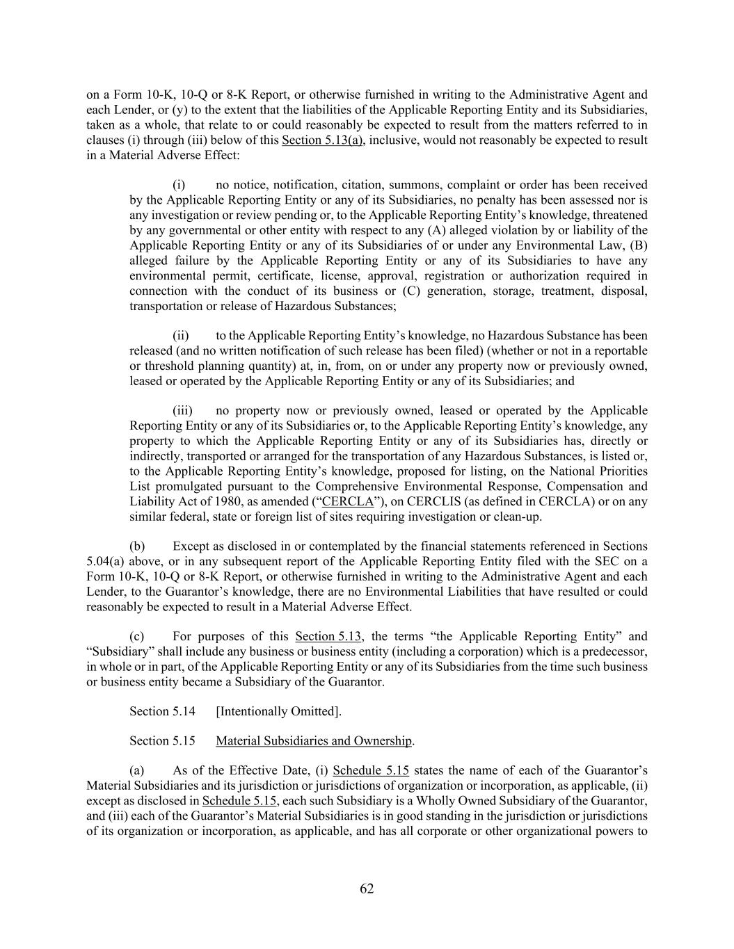 62 on a Form 10-K, 10-Q or 8-K Report, or otherwise furnished in writing to the Administrative Agent and each Lender, or (y) to the extent that the liabilities of the Applicable Reporting Entity and its Subsidiaries, taken as a whole, that relate to or could reasonably be expected to result from the matters referred to in clauses (i) through (iii) below of this Section 5.13(a), inclusive, would not reasonably be expected to result in a Material Adverse Effect: (i) no notice, notification, citation, summons, complaint or order has been received by the Applicable Reporting Entity or any of its Subsidiaries, no penalty has been assessed nor is any investigation or review pending or, to the Applicable Reporting Entity’s knowledge, threatened by any governmental or other entity with respect to any (A) alleged violation by or liability of the Applicable Reporting Entity or any of its Subsidiaries of or under any Environmental Law, (B) alleged failure by the Applicable Reporting Entity or any of its Subsidiaries to have any environmental permit, certificate, license, approval, registration or authorization required in connection with the conduct of its business or (C) generation, storage, treatment, disposal, transportation or release of Hazardous Substances; (ii) to the Applicable Reporting Entity’s knowledge, no Hazardous Substance has been released (and no written notification of such release has been filed) (whether or not in a reportable or threshold planning quantity) at, in, from, on or under any property now or previously owned, leased or operated by the Applicable Reporting Entity or any of its Subsidiaries; and (iii) no property now or previously owned, leased or operated by the Applicable Reporting Entity or any of its Subsidiaries or, to the Applicable Reporting Entity’s knowledge, any property to which the Applicable Reporting Entity or any of its Subsidiaries has, directly or indirectly, transported or arranged for the transportation of any Hazardous Substances, is listed or, to the Applicable Reporting Entity’s knowledge, proposed for listing, on the National Priorities List promulgated pursuant to the Comprehensive Environmental Response, Compensation and Liability Act of 1980, as amended (“CERCLA”), on CERCLIS (as defined in CERCLA) or on any similar federal, state or foreign list of sites requiring investigation or clean-up. (b) Except as disclosed in or contemplated by the financial statements referenced in Sections 5.04(a) above, or in any subsequent report of the Applicable Reporting Entity filed with the SEC on a Form 10-K, 10-Q or 8-K Report, or otherwise furnished in writing to the Administrative Agent and each Lender, to the Guarantor’s knowledge, there are no Environmental Liabilities that have resulted or could reasonably be expected to result in a Material Adverse Effect. (c) For purposes of this Section 5.13, the terms “the Applicable Reporting Entity” and “Subsidiary” shall include any business or business entity (including a corporation) which is a predecessor, in whole or in part, of the Applicable Reporting Entity or any of its Subsidiaries from the time such business or business entity became a Subsidiary of the Guarantor. Section 5.14 [Intentionally Omitted]. Section 5.15 Material Subsidiaries and Ownership. (a) As of the Effective Date, (i) Schedule 5.15 states the name of each of the Guarantor’s Material Subsidiaries and its jurisdiction or jurisdictions of organization or incorporation, as applicable, (ii) except as disclosed in Schedule 5.15, each such Subsidiary is a Wholly Owned Subsidiary of the Guarantor, and (iii) each of the Guarantor’s Material Subsidiaries is in good standing in the jurisdiction or jurisdictions of its organization or incorporation, as applicable, and has all corporate or other organizational powers to