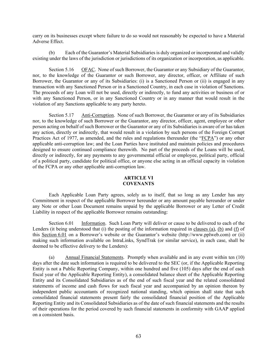 63 carry on its businesses except where failure to do so would not reasonably be expected to have a Material Adverse Effect. (b) Each of the Guarantor’s Material Subsidiaries is duly organized or incorporated and validly existing under the laws of the jurisdiction or jurisdictions of its organization or incorporation, as applicable. Section 5.16 OFAC. None of such Borrower, the Guarantor or any Subsidiary of the Guarantor, nor, to the knowledge of the Guarantor or such Borrower, any director, officer, or Affiliate of such Borrower, the Guarantor or any of its Subsidiaries: (i) is a Sanctioned Person or (ii) is engaged in any transaction with any Sanctioned Person or in a Sanctioned Country, in each case in violation of Sanctions. The proceeds of any Loan will not be used, directly or indirectly, to fund any activities or business of or with any Sanctioned Person, or in any Sanctioned Country or in any manner that would result in the violation of any Sanctions applicable to any party hereto. Section 5.17 Anti-Corruption. None of such Borrower, the Guarantor or any of its Subsidiaries nor, to the knowledge of such Borrower or the Guarantor, any director, officer, agent, employee or other person acting on behalf of such Borrower or the Guarantor or any of its Subsidiaries is aware of or has taken any action, directly or indirectly, that would result in a violation by such persons of the Foreign Corrupt Practices Act of 1977, as amended, and the rules and regulations thereunder (the “FCPA”) or any other applicable anti-corruption law; and the Loan Parties have instituted and maintain policies and procedures designed to ensure continued compliance therewith. No part of the proceeds of the Loans will be used, directly or indirectly, for any payments to any governmental official or employee, political party, official of a political party, candidate for political office, or anyone else acting in an official capacity in violation of the FCPA or any other applicable anti-corruption law. ARTICLE VI COVENANTS Each Applicable Loan Party agrees, solely as to itself, that so long as any Lender has any Commitment in respect of the applicable Borrower hereunder or any amount payable hereunder or under any Note or other Loan Document remains unpaid by the applicable Borrower or any Letter of Credit Liability in respect of the applicable Borrower remains outstanding: Section 6.01 Information. Such Loan Party will deliver or cause to be delivered to each of the Lenders (it being understood that (i) the posting of the information required in clauses (a), (b) and (f) of this Section 6.01 on a Borrower’s website or the Guarantor’s website (http://www.pplweb.com) or (ii) making such information available on IntraLinks, SyndTrak (or similar service), in each case, shall be deemed to be effective delivery to the Lenders): (a) Annual Financial Statements. Promptly when available and in any event within ten (10) days after the date such information is required to be delivered to the SEC (or, if the Applicable Reporting Entity is not a Public Reporting Company, within one hundred and five (105) days after the end of each fiscal year of the Applicable Reporting Entity), a consolidated balance sheet of the Applicable Reporting Entity and its Consolidated Subsidiaries as of the end of such fiscal year and the related consolidated statements of income and cash flows for such fiscal year and accompanied by an opinion thereon by independent public accountants of recognized national standing, which opinion shall state that such consolidated financial statements present fairly the consolidated financial position of the Applicable Reporting Entity and its Consolidated Subsidiaries as of the date of such financial statements and the results of their operations for the period covered by such financial statements in conformity with GAAP applied on a consistent basis.