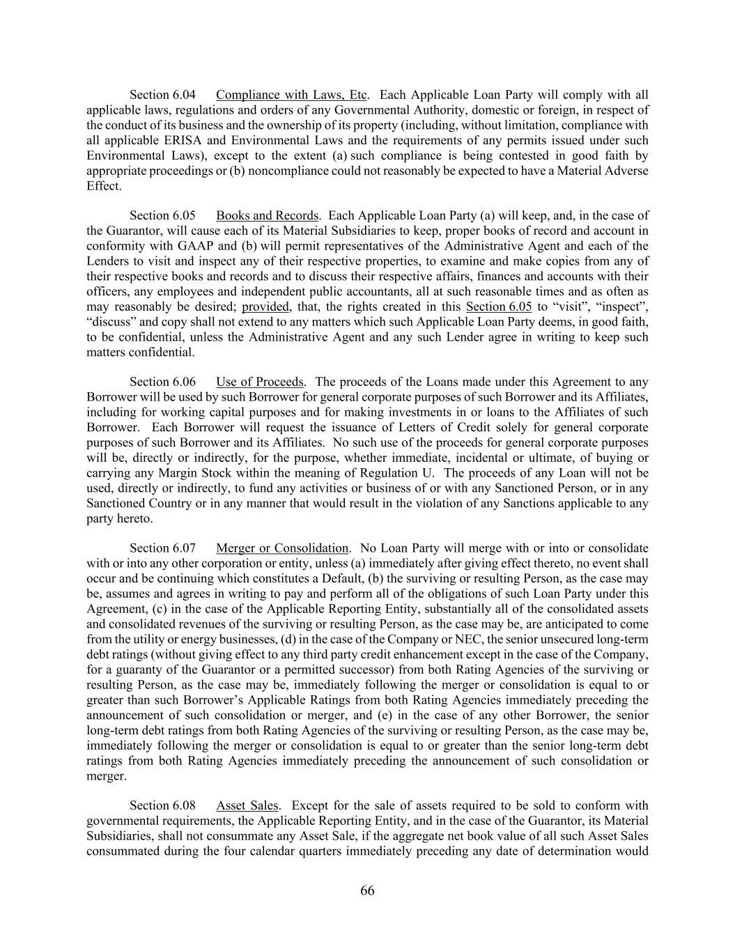 66 Section 6.04 Compliance with Laws, Etc. Each Applicable Loan Party will comply with all applicable laws, regulations and orders of any Governmental Authority, domestic or foreign, in respect of the conduct of its business and the ownership of its property (including, without limitation, compliance with all applicable ERISA and Environmental Laws and the requirements of any permits issued under such Environmental Laws), except to the extent (a) such compliance is being contested in good faith by appropriate proceedings or (b) noncompliance could not reasonably be expected to have a Material Adverse Effect. Section 6.05 Books and Records. Each Applicable Loan Party (a) will keep, and, in the case of the Guarantor, will cause each of its Material Subsidiaries to keep, proper books of record and account in conformity with GAAP and (b) will permit representatives of the Administrative Agent and each of the Lenders to visit and inspect any of their respective properties, to examine and make copies from any of their respective books and records and to discuss their respective affairs, finances and accounts with their officers, any employees and independent public accountants, all at such reasonable times and as often as may reasonably be desired; provided, that, the rights created in this Section 6.05 to “visit”, “inspect”, “discuss” and copy shall not extend to any matters which such Applicable Loan Party deems, in good faith, to be confidential, unless the Administrative Agent and any such Lender agree in writing to keep such matters confidential. Section 6.06 Use of Proceeds. The proceeds of the Loans made under this Agreement to any Borrower will be used by such Borrower for general corporate purposes of such Borrower and its Affiliates, including for working capital purposes and for making investments in or loans to the Affiliates of such Borrower. Each Borrower will request the issuance of Letters of Credit solely for general corporate purposes of such Borrower and its Affiliates. No such use of the proceeds for general corporate purposes will be, directly or indirectly, for the purpose, whether immediate, incidental or ultimate, of buying or carrying any Margin Stock within the meaning of Regulation U. The proceeds of any Loan will not be used, directly or indirectly, to fund any activities or business of or with any Sanctioned Person, or in any Sanctioned Country or in any manner that would result in the violation of any Sanctions applicable to any party hereto. Section 6.07 Merger or Consolidation. No Loan Party will merge with or into or consolidate with or into any other corporation or entity, unless (a) immediately after giving effect thereto, no event shall occur and be continuing which constitutes a Default, (b) the surviving or resulting Person, as the case may be, assumes and agrees in writing to pay and perform all of the obligations of such Loan Party under this Agreement, (c) in the case of the Applicable Reporting Entity, substantially all of the consolidated assets and consolidated revenues of the surviving or resulting Person, as the case may be, are anticipated to come from the utility or energy businesses, (d) in the case of the Company or NEC, the senior unsecured long-term debt ratings (without giving effect to any third party credit enhancement except in the case of the Company, for a guaranty of the Guarantor or a permitted successor) from both Rating Agencies of the surviving or resulting Person, as the case may be, immediately following the merger or consolidation is equal to or greater than such Borrower’s Applicable Ratings from both Rating Agencies immediately preceding the announcement of such consolidation or merger, and (e) in the case of any other Borrower, the senior long-term debt ratings from both Rating Agencies of the surviving or resulting Person, as the case may be, immediately following the merger or consolidation is equal to or greater than the senior long-term debt ratings from both Rating Agencies immediately preceding the announcement of such consolidation or merger. Section 6.08 Asset Sales. Except for the sale of assets required to be sold to conform with governmental requirements, the Applicable Reporting Entity, and in the case of the Guarantor, its Material Subsidiaries, shall not consummate any Asset Sale, if the aggregate net book value of all such Asset Sales consummated during the four calendar quarters immediately preceding any date of determination would