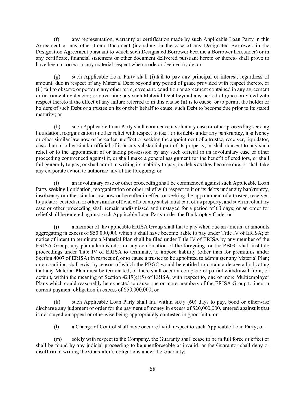 68 (f) any representation, warranty or certification made by such Applicable Loan Party in this Agreement or any other Loan Document (including, in the case of any Designated Borrower, in the Designation Agreement pursuant to which such Designated Borrower became a Borrower hereunder) or in any certificate, financial statement or other document delivered pursuant hereto or thereto shall prove to have been incorrect in any material respect when made or deemed made; or (g) such Applicable Loan Party shall (i) fail to pay any principal or interest, regardless of amount, due in respect of any Material Debt beyond any period of grace provided with respect thereto, or (ii) fail to observe or perform any other term, covenant, condition or agreement contained in any agreement or instrument evidencing or governing any such Material Debt beyond any period of grace provided with respect thereto if the effect of any failure referred to in this clause (ii) is to cause, or to permit the holder or holders of such Debt or a trustee on its or their behalf to cause, such Debt to become due prior to its stated maturity; or (h) such Applicable Loan Party shall commence a voluntary case or other proceeding seeking liquidation, reorganization or other relief with respect to itself or its debts under any bankruptcy, insolvency or other similar law now or hereafter in effect or seeking the appointment of a trustee, receiver, liquidator, custodian or other similar official of it or any substantial part of its property, or shall consent to any such relief or to the appointment of or taking possession by any such official in an involuntary case or other proceeding commenced against it, or shall make a general assignment for the benefit of creditors, or shall fail generally to pay, or shall admit in writing its inability to pay, its debts as they become due, or shall take any corporate action to authorize any of the foregoing; or (i) an involuntary case or other proceeding shall be commenced against such Applicable Loan Party seeking liquidation, reorganization or other relief with respect to it or its debts under any bankruptcy, insolvency or other similar law now or hereafter in effect or seeking the appointment of a trustee, receiver, liquidator, custodian or other similar official of it or any substantial part of its property, and such involuntary case or other proceeding shall remain undismissed and unstayed for a period of 60 days; or an order for relief shall be entered against such Applicable Loan Party under the Bankruptcy Code; or (j) a member of the applicable ERISA Group shall fail to pay when due an amount or amounts aggregating in excess of $50,000,000 which it shall have become liable to pay under Title IV of ERISA; or notice of intent to terminate a Material Plan shall be filed under Title IV of ERISA by any member of the ERISA Group, any plan administrator or any combination of the foregoing; or the PBGC shall institute proceedings under Title IV of ERISA to terminate, to impose liability (other than for premiums under Section 4007 of ERISA) in respect of, or to cause a trustee to be appointed to administer any Material Plan; or a condition shall exist by reason of which the PBGC would be entitled to obtain a decree adjudicating that any Material Plan must be terminated; or there shall occur a complete or partial withdrawal from, or default, within the meaning of Section 4219(c)(5) of ERISA, with respect to, one or more Multiemployer Plans which could reasonably be expected to cause one or more members of the ERISA Group to incur a current payment obligation in excess of $50,000,000; or (k) such Applicable Loan Party shall fail within sixty (60) days to pay, bond or otherwise discharge any judgment or order for the payment of money in excess of $20,000,000, entered against it that is not stayed on appeal or otherwise being appropriately contested in good faith; or (l) a Change of Control shall have occurred with respect to such Applicable Loan Party; or (m) solely with respect to the Company, the Guaranty shall cease to be in full force or effect or shall be found by any judicial proceeding to be unenforceable or invalid; or the Guarantor shall deny or disaffirm in writing the Guarantor’s obligations under the Guaranty;