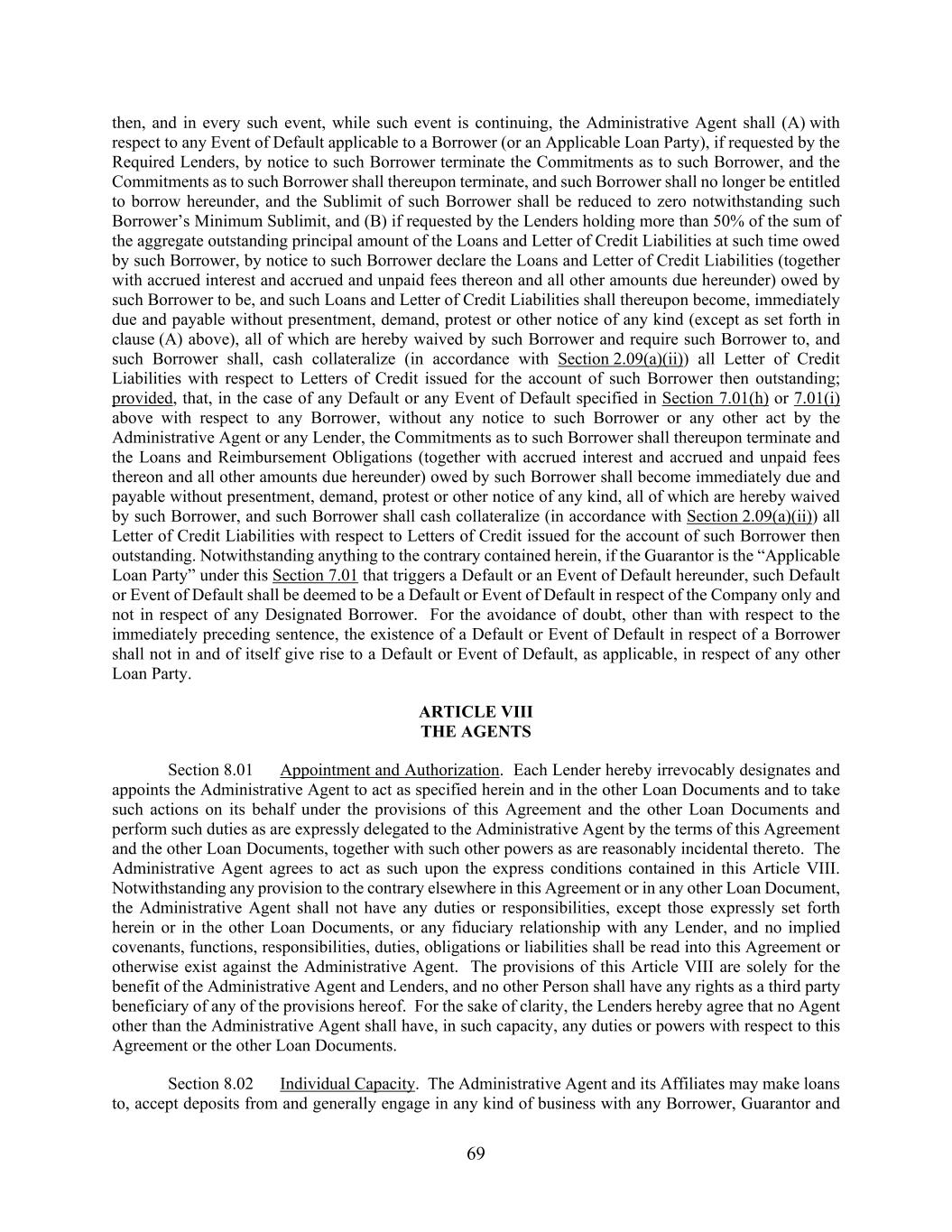 69 then, and in every such event, while such event is continuing, the Administrative Agent shall (A) with respect to any Event of Default applicable to a Borrower (or an Applicable Loan Party), if requested by the Required Lenders, by notice to such Borrower terminate the Commitments as to such Borrower, and the Commitments as to such Borrower shall thereupon terminate, and such Borrower shall no longer be entitled to borrow hereunder, and the Sublimit of such Borrower shall be reduced to zero notwithstanding such Borrower’s Minimum Sublimit, and (B) if requested by the Lenders holding more than 50% of the sum of the aggregate outstanding principal amount of the Loans and Letter of Credit Liabilities at such time owed by such Borrower, by notice to such Borrower declare the Loans and Letter of Credit Liabilities (together with accrued interest and accrued and unpaid fees thereon and all other amounts due hereunder) owed by such Borrower to be, and such Loans and Letter of Credit Liabilities shall thereupon become, immediately due and payable without presentment, demand, protest or other notice of any kind (except as set forth in clause (A) above), all of which are hereby waived by such Borrower and require such Borrower to, and such Borrower shall, cash collateralize (in accordance with Section 2.09(a)(ii)) all Letter of Credit Liabilities with respect to Letters of Credit issued for the account of such Borrower then outstanding; provided, that, in the case of any Default or any Event of Default specified in Section 7.01(h) or 7.01(i) above with respect to any Borrower, without any notice to such Borrower or any other act by the Administrative Agent or any Lender, the Commitments as to such Borrower shall thereupon terminate and the Loans and Reimbursement Obligations (together with accrued interest and accrued and unpaid fees thereon and all other amounts due hereunder) owed by such Borrower shall become immediately due and payable without presentment, demand, protest or other notice of any kind, all of which are hereby waived by such Borrower, and such Borrower shall cash collateralize (in accordance with Section 2.09(a)(ii)) all Letter of Credit Liabilities with respect to Letters of Credit issued for the account of such Borrower then outstanding. Notwithstanding anything to the contrary contained herein, if the Guarantor is the “Applicable Loan Party” under this Section 7.01 that triggers a Default or an Event of Default hereunder, such Default or Event of Default shall be deemed to be a Default or Event of Default in respect of the Company only and not in respect of any Designated Borrower. For the avoidance of doubt, other than with respect to the immediately preceding sentence, the existence of a Default or Event of Default in respect of a Borrower shall not in and of itself give rise to a Default or Event of Default, as applicable, in respect of any other Loan Party. ARTICLE VIII THE AGENTS Section 8.01 Appointment and Authorization. Each Lender hereby irrevocably designates and appoints the Administrative Agent to act as specified herein and in the other Loan Documents and to take such actions on its behalf under the provisions of this Agreement and the other Loan Documents and perform such duties as are expressly delegated to the Administrative Agent by the terms of this Agreement and the other Loan Documents, together with such other powers as are reasonably incidental thereto. The Administrative Agent agrees to act as such upon the express conditions contained in this Article VIII. Notwithstanding any provision to the contrary elsewhere in this Agreement or in any other Loan Document, the Administrative Agent shall not have any duties or responsibilities, except those expressly set forth herein or in the other Loan Documents, or any fiduciary relationship with any Lender, and no implied covenants, functions, responsibilities, duties, obligations or liabilities shall be read into this Agreement or otherwise exist against the Administrative Agent. The provisions of this Article VIII are solely for the benefit of the Administrative Agent and Lenders, and no other Person shall have any rights as a third party beneficiary of any of the provisions hereof. For the sake of clarity, the Lenders hereby agree that no Agent other than the Administrative Agent shall have, in such capacity, any duties or powers with respect to this Agreement or the other Loan Documents. Section 8.02 Individual Capacity. The Administrative Agent and its Affiliates may make loans to, accept deposits from and generally engage in any kind of business with any Borrower, Guarantor and