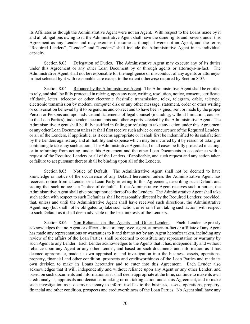 70 its Affiliates as though the Administrative Agent were not an Agent. With respect to the Loans made by it and all obligations owing to it, the Administrative Agent shall have the same rights and powers under this Agreement as any Lender and may exercise the same as though it were not an Agent, and the terms “Required Lenders”, “Lender” and “Lenders” shall include the Administrative Agent in its individual capacity. Section 8.03 Delegation of Duties. The Administrative Agent may execute any of its duties under this Agreement or any other Loan Document by or through agents or attorneys-in-fact. The Administrative Agent shall not be responsible for the negligence or misconduct of any agents or attorneys- in-fact selected by it with reasonable care except to the extent otherwise required by Section 8.07. Section 8.04 Reliance by the Administrative Agent. The Administrative Agent shall be entitled to rely, and shall be fully protected in relying, upon any note, writing, resolution, notice, consent, certificate, affidavit, letter, telecopy or other electronic facsimile transmission, telex, telegram, cable, teletype, electronic transmission by modem, computer disk or any other message, statement, order or other writing or conversation believed by it to be genuine and correct and to have been signed, sent or made by the proper Person or Persons and upon advice and statements of legal counsel (including, without limitation, counsel to the Loan Parties), independent accountants and other experts selected by the Administrative Agent. The Administrative Agent shall be fully justified in failing or refusing to take any action under this Agreement or any other Loan Document unless it shall first receive such advice or concurrence of the Required Lenders, or all of the Lenders, if applicable, as it deems appropriate or it shall first be indemnified to its satisfaction by the Lenders against any and all liability and expense which may be incurred by it by reason of taking or continuing to take any such action. The Administrative Agent shall in all cases be fully protected in acting, or in refraining from acting, under this Agreement and the other Loan Documents in accordance with a request of the Required Lenders or all of the Lenders, if applicable, and such request and any action taken or failure to act pursuant thereto shall be binding upon all of the Lenders. Section 8.05 Notice of Default. The Administrative Agent shall not be deemed to have knowledge or notice of the occurrence of any Default hereunder unless the Administrative Agent has received notice from a Lender or a Loan Party referring to this Agreement, describing such Default and stating that such notice is a “notice of default”. If the Administrative Agent receives such a notice, the Administrative Agent shall give prompt notice thereof to the Lenders. The Administrative Agent shall take such action with respect to such Default as shall be reasonably directed by the Required Lenders; provided, that, unless and until the Administrative Agent shall have received such directions, the Administrative Agent may (but shall not be obligated to) take such action, or refrain from taking such action, with respect to such Default as it shall deem advisable in the best interests of the Lenders. Section 8.06 Non-Reliance on the Agents and Other Lenders. Each Lender expressly acknowledges that no Agent or officer, director, employee, agent, attorney-in-fact or affiliate of any Agent has made any representations or warranties to it and that no act by any Agent hereafter taken, including any review of the affairs of the Loan Parties, shall be deemed to constitute any representation or warranty by such Agent to any Lender. Each Lender acknowledges to the Agents that it has, independently and without reliance upon any Agent or any other Lender, and based on such documents and information as it has deemed appropriate, made its own appraisal of and investigation into the business, assets, operations, property, financial and other condition, prospects and creditworthiness of the Loan Parties and made its own decision to make its Loans hereunder and to enter into this Agreement. Each Lender also acknowledges that it will, independently and without reliance upon any Agent or any other Lender, and based on such documents and information as it shall deem appropriate at the time, continue to make its own credit analysis, appraisals and decisions in taking or not taking action under this Agreement, and to make such investigation as it deems necessary to inform itself as to the business, assets, operations, property, financial and other condition, prospects and creditworthiness of the Loan Parties. No Agent shall have any