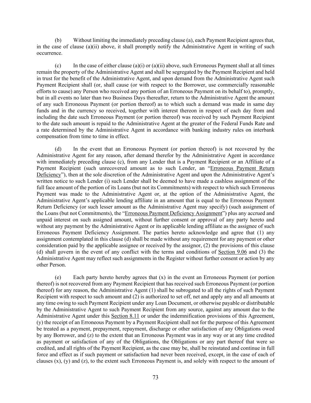73 (b) Without limiting the immediately preceding clause (a), each Payment Recipient agrees that, in the case of clause (a)(ii) above, it shall promptly notify the Administrative Agent in writing of such occurrence. (c) In the case of either clause (a)(i) or (a)(ii) above, such Erroneous Payment shall at all times remain the property of the Administrative Agent and shall be segregated by the Payment Recipient and held in trust for the benefit of the Administrative Agent, and upon demand from the Administrative Agent such Payment Recipient shall (or, shall cause (or with respect to the Borrower, use commercially reasonable efforts to cause) any Person who received any portion of an Erroneous Payment on its behalf to), promptly, but in all events no later than two Business Days thereafter, return to the Administrative Agent the amount of any such Erroneous Payment (or portion thereof) as to which such a demand was made in same day funds and in the currency so received, together with interest thereon in respect of each day from and including the date such Erroneous Payment (or portion thereof) was received by such Payment Recipient to the date such amount is repaid to the Administrative Agent at the greater of the Federal Funds Rate and a rate determined by the Administrative Agent in accordance with banking industry rules on interbank compensation from time to time in effect. (d) In the event that an Erroneous Payment (or portion thereof) is not recovered by the Administrative Agent for any reason, after demand therefor by the Administrative Agent in accordance with immediately preceding clause (c), from any Lender that is a Payment Recipient or an Affiliate of a Payment Recipient (such unrecovered amount as to such Lender, an “Erroneous Payment Return Deficiency”), then at the sole discretion of the Administrative Agent and upon the Administrative Agent’s written notice to such Lender (i) such Lender shall be deemed to have made a cashless assignment of the full face amount of the portion of its Loans (but not its Commitments) with respect to which such Erroneous Payment was made to the Administrative Agent or, at the option of the Administrative Agent, the Administrative Agent’s applicable lending affiliate in an amount that is equal to the Erroneous Payment Return Deficiency (or such lesser amount as the Administrative Agent may specify) (such assignment of the Loans (but not Commitments), the “Erroneous Payment Deficiency Assignment”) plus any accrued and unpaid interest on such assigned amount, without further consent or approval of any party hereto and without any payment by the Administrative Agent or its applicable lending affiliate as the assignee of such Erroneous Payment Deficiency Assignment. The parties hereto acknowledge and agree that (1) any assignment contemplated in this clause (d) shall be made without any requirement for any payment or other consideration paid by the applicable assignee or received by the assignor, (2) the provisions of this clause (d) shall govern in the event of any conflict with the terms and conditions of Section 9.06 and (3) the Administrative Agent may reflect such assignments in the Register without further consent or action by any other Person. (e) Each party hereto hereby agrees that (x) in the event an Erroneous Payment (or portion thereof) is not recovered from any Payment Recipient that has received such Erroneous Payment (or portion thereof) for any reason, the Administrative Agent (1) shall be subrogated to all the rights of such Payment Recipient with respect to such amount and (2) is authorized to set off, net and apply any and all amounts at any time owing to such Payment Recipient under any Loan Document, or otherwise payable or distributable by the Administrative Agent to such Payment Recipient from any source, against any amount due to the Administrative Agent under this Section 8.11 or under the indemnification provisions of this Agreement, (y) the receipt of an Erroneous Payment by a Payment Recipient shall not for the purpose of this Agreement be treated as a payment, prepayment, repayment, discharge or other satisfaction of any Obligations owed by any Borrower, and (z) to the extent that an Erroneous Payment was in any way or at any time credited as payment or satisfaction of any of the Obligations, the Obligations or any part thereof that were so credited, and all rights of the Payment Recipient, as the case may be, shall be reinstated and continue in full force and effect as if such payment or satisfaction had never been received, except, in the case of each of clauses (x), (y) and (z), to the extent such Erroneous Payment is, and solely with respect to the amount of