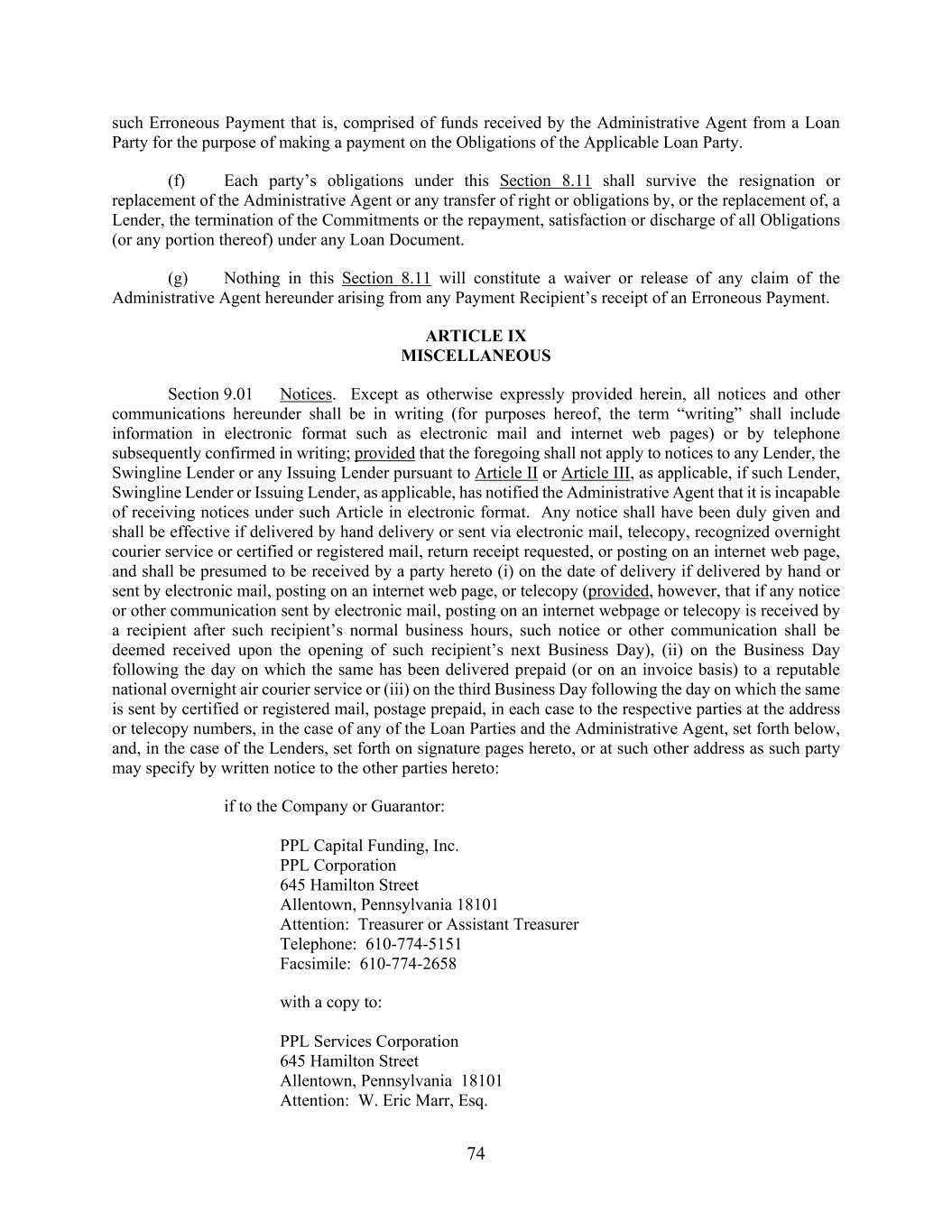 74 such Erroneous Payment that is, comprised of funds received by the Administrative Agent from a Loan Party for the purpose of making a payment on the Obligations of the Applicable Loan Party. (f) Each party’s obligations under this Section 8.11 shall survive the resignation or replacement of the Administrative Agent or any transfer of right or obligations by, or the replacement of, a Lender, the termination of the Commitments or the repayment, satisfaction or discharge of all Obligations (or any portion thereof) under any Loan Document. (g) Nothing in this Section 8.11 will constitute a waiver or release of any claim of the Administrative Agent hereunder arising from any Payment Recipient’s receipt of an Erroneous Payment. ARTICLE IX MISCELLANEOUS Section 9.01 Notices. Except as otherwise expressly provided herein, all notices and other communications hereunder shall be in writing (for purposes hereof, the term “writing” shall include information in electronic format such as electronic mail and internet web pages) or by telephone subsequently confirmed in writing; provided that the foregoing shall not apply to notices to any Lender, the Swingline Lender or any Issuing Lender pursuant to Article II or Article III, as applicable, if such Lender, Swingline Lender or Issuing Lender, as applicable, has notified the Administrative Agent that it is incapable of receiving notices under such Article in electronic format. Any notice shall have been duly given and shall be effective if delivered by hand delivery or sent via electronic mail, telecopy, recognized overnight courier service or certified or registered mail, return receipt requested, or posting on an internet web page, and shall be presumed to be received by a party hereto (i) on the date of delivery if delivered by hand or sent by electronic mail, posting on an internet web page, or telecopy (provided, however, that if any notice or other communication sent by electronic mail, posting on an internet webpage or telecopy is received by a recipient after such recipient’s normal business hours, such notice or other communication shall be deemed received upon the opening of such recipient’s next Business Day), (ii) on the Business Day following the day on which the same has been delivered prepaid (or on an invoice basis) to a reputable national overnight air courier service or (iii) on the third Business Day following the day on which the same is sent by certified or registered mail, postage prepaid, in each case to the respective parties at the address or telecopy numbers, in the case of any of the Loan Parties and the Administrative Agent, set forth below, and, in the case of the Lenders, set forth on signature pages hereto, or at such other address as such party may specify by written notice to the other parties hereto: if to the Company or Guarantor: PPL Capital Funding, Inc. PPL Corporation 645 Hamilton Street Allentown, Pennsylvania 18101 Attention: Treasurer or Assistant Treasurer Telephone: 610-774-5151 Facsimile: 610-774-2658 with a copy to: PPL Services Corporation 645 Hamilton Street Allentown, Pennsylvania 18101 Attention: W. Eric Marr, Esq.