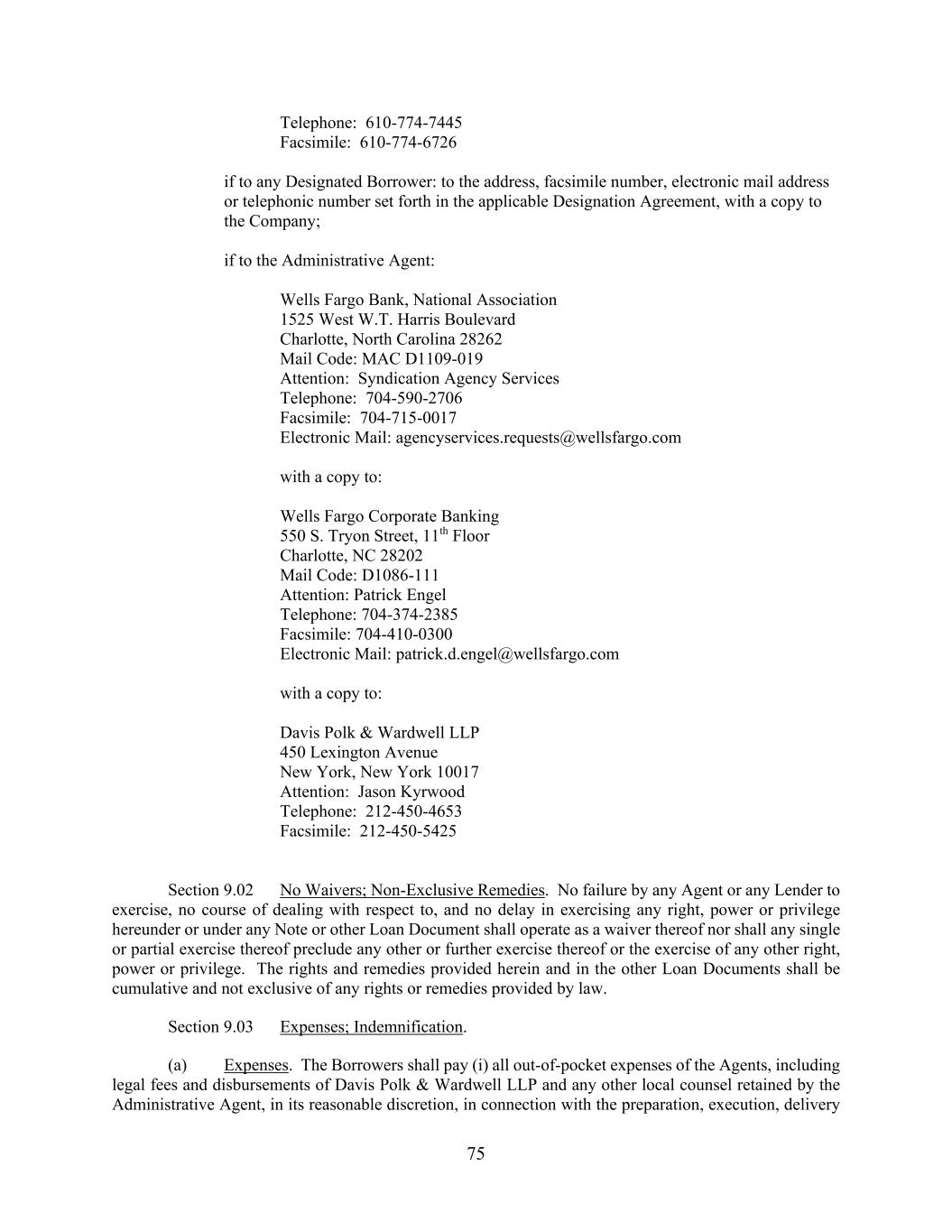 75 Telephone: 610-774-7445 Facsimile: 610-774-6726 if to any Designated Borrower: to the address, facsimile number, electronic mail address or telephonic number set forth in the applicable Designation Agreement, with a copy to the Company; if to the Administrative Agent: Wells Fargo Bank, National Association 1525 West W.T. Harris Boulevard Charlotte, North Carolina 28262 Mail Code: MAC D1109-019 Attention: Syndication Agency Services Telephone: 704-590-2706 Facsimile: 704-715-0017 Electronic Mail: agencyservices.requests@wellsfargo.com with a copy to: Wells Fargo Corporate Banking 550 S. Tryon Street, 11th Floor Charlotte, NC 28202 Mail Code: D1086-111 Attention: Patrick Engel Telephone: 704-374-2385 Facsimile: 704-410-0300 Electronic Mail: patrick.d.engel@wellsfargo.com with a copy to: Davis Polk & Wardwell LLP 450 Lexington Avenue New York, New York 10017 Attention: Jason Kyrwood Telephone: 212-450-4653 Facsimile: 212-450-5425 Section 9.02 No Waivers; Non-Exclusive Remedies. No failure by any Agent or any Lender to exercise, no course of dealing with respect to, and no delay in exercising any right, power or privilege hereunder or under any Note or other Loan Document shall operate as a waiver thereof nor shall any single or partial exercise thereof preclude any other or further exercise thereof or the exercise of any other right, power or privilege. The rights and remedies provided herein and in the other Loan Documents shall be cumulative and not exclusive of any rights or remedies provided by law. Section 9.03 Expenses; Indemnification. (a) Expenses. The Borrowers shall pay (i) all out-of-pocket expenses of the Agents, including legal fees and disbursements of Davis Polk & Wardwell LLP and any other local counsel retained by the Administrative Agent, in its reasonable discretion, in connection with the preparation, execution, delivery