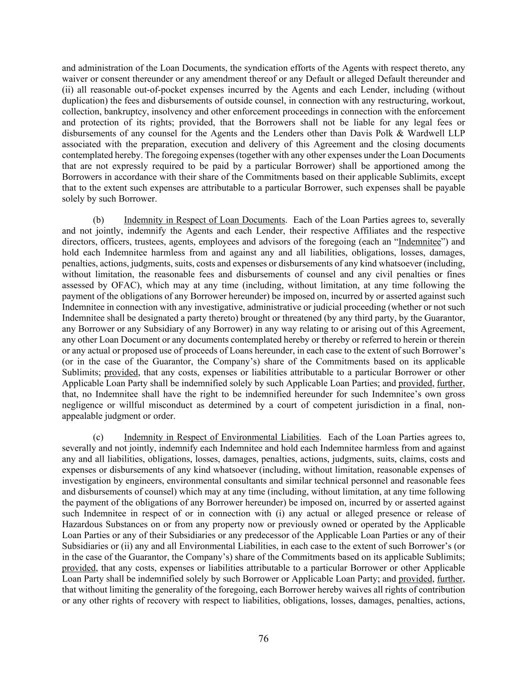 76 and administration of the Loan Documents, the syndication efforts of the Agents with respect thereto, any waiver or consent thereunder or any amendment thereof or any Default or alleged Default thereunder and (ii) all reasonable out-of-pocket expenses incurred by the Agents and each Lender, including (without duplication) the fees and disbursements of outside counsel, in connection with any restructuring, workout, collection, bankruptcy, insolvency and other enforcement proceedings in connection with the enforcement and protection of its rights; provided, that the Borrowers shall not be liable for any legal fees or disbursements of any counsel for the Agents and the Lenders other than Davis Polk & Wardwell LLP associated with the preparation, execution and delivery of this Agreement and the closing documents contemplated hereby. The foregoing expenses (together with any other expenses under the Loan Documents that are not expressly required to be paid by a particular Borrower) shall be apportioned among the Borrowers in accordance with their share of the Commitments based on their applicable Sublimits, except that to the extent such expenses are attributable to a particular Borrower, such expenses shall be payable solely by such Borrower. (b) Indemnity in Respect of Loan Documents. Each of the Loan Parties agrees to, severally and not jointly, indemnify the Agents and each Lender, their respective Affiliates and the respective directors, officers, trustees, agents, employees and advisors of the foregoing (each an “Indemnitee”) and hold each Indemnitee harmless from and against any and all liabilities, obligations, losses, damages, penalties, actions, judgments, suits, costs and expenses or disbursements of any kind whatsoever (including, without limitation, the reasonable fees and disbursements of counsel and any civil penalties or fines assessed by OFAC), which may at any time (including, without limitation, at any time following the payment of the obligations of any Borrower hereunder) be imposed on, incurred by or asserted against such Indemnitee in connection with any investigative, administrative or judicial proceeding (whether or not such Indemnitee shall be designated a party thereto) brought or threatened (by any third party, by the Guarantor, any Borrower or any Subsidiary of any Borrower) in any way relating to or arising out of this Agreement, any other Loan Document or any documents contemplated hereby or thereby or referred to herein or therein or any actual or proposed use of proceeds of Loans hereunder, in each case to the extent of such Borrower’s (or in the case of the Guarantor, the Company’s) share of the Commitments based on its applicable Sublimits; provided, that any costs, expenses or liabilities attributable to a particular Borrower or other Applicable Loan Party shall be indemnified solely by such Applicable Loan Parties; and provided, further, that, no Indemnitee shall have the right to be indemnified hereunder for such Indemnitee’s own gross negligence or willful misconduct as determined by a court of competent jurisdiction in a final, non- appealable judgment or order. (c) Indemnity in Respect of Environmental Liabilities. Each of the Loan Parties agrees to, severally and not jointly, indemnify each Indemnitee and hold each Indemnitee harmless from and against any and all liabilities, obligations, losses, damages, penalties, actions, judgments, suits, claims, costs and expenses or disbursements of any kind whatsoever (including, without limitation, reasonable expenses of investigation by engineers, environmental consultants and similar technical personnel and reasonable fees and disbursements of counsel) which may at any time (including, without limitation, at any time following the payment of the obligations of any Borrower hereunder) be imposed on, incurred by or asserted against such Indemnitee in respect of or in connection with (i) any actual or alleged presence or release of Hazardous Substances on or from any property now or previously owned or operated by the Applicable Loan Parties or any of their Subsidiaries or any predecessor of the Applicable Loan Parties or any of their Subsidiaries or (ii) any and all Environmental Liabilities, in each case to the extent of such Borrower’s (or in the case of the Guarantor, the Company’s) share of the Commitments based on its applicable Sublimits; provided, that any costs, expenses or liabilities attributable to a particular Borrower or other Applicable Loan Party shall be indemnified solely by such Borrower or Applicable Loan Party; and provided, further, that without limiting the generality of the foregoing, each Borrower hereby waives all rights of contribution or any other rights of recovery with respect to liabilities, obligations, losses, damages, penalties, actions,