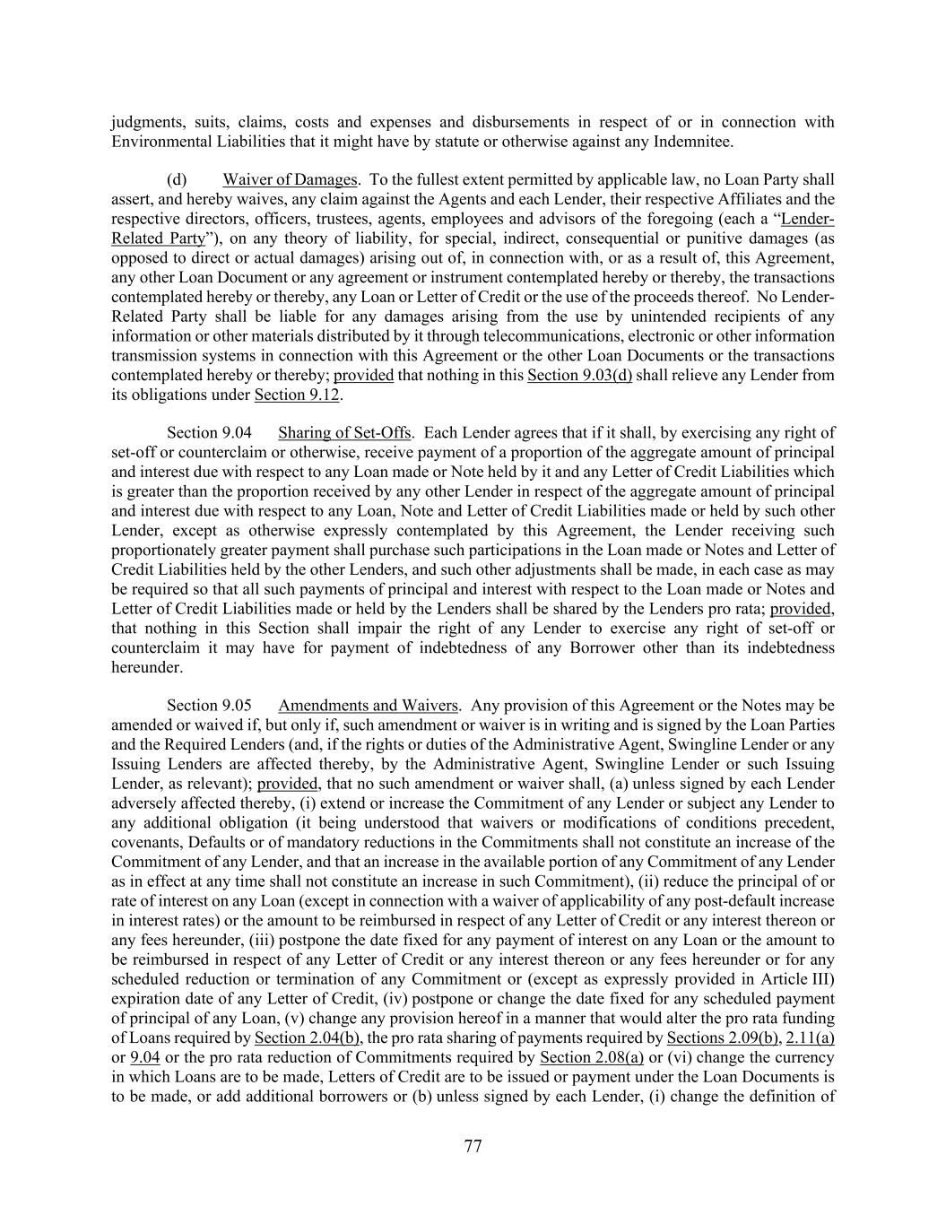 77 judgments, suits, claims, costs and expenses and disbursements in respect of or in connection with Environmental Liabilities that it might have by statute or otherwise against any Indemnitee. (d) Waiver of Damages. To the fullest extent permitted by applicable law, no Loan Party shall assert, and hereby waives, any claim against the Agents and each Lender, their respective Affiliates and the respective directors, officers, trustees, agents, employees and advisors of the foregoing (each a “Lender- Related Party”), on any theory of liability, for special, indirect, consequential or punitive damages (as opposed to direct or actual damages) arising out of, in connection with, or as a result of, this Agreement, any other Loan Document or any agreement or instrument contemplated hereby or thereby, the transactions contemplated hereby or thereby, any Loan or Letter of Credit or the use of the proceeds thereof. No Lender- Related Party shall be liable for any damages arising from the use by unintended recipients of any information or other materials distributed by it through telecommunications, electronic or other information transmission systems in connection with this Agreement or the other Loan Documents or the transactions contemplated hereby or thereby; provided that nothing in this Section 9.03(d) shall relieve any Lender from its obligations under Section 9.12. Section 9.04 Sharing of Set-Offs. Each Lender agrees that if it shall, by exercising any right of set-off or counterclaim or otherwise, receive payment of a proportion of the aggregate amount of principal and interest due with respect to any Loan made or Note held by it and any Letter of Credit Liabilities which is greater than the proportion received by any other Lender in respect of the aggregate amount of principal and interest due with respect to any Loan, Note and Letter of Credit Liabilities made or held by such other Lender, except as otherwise expressly contemplated by this Agreement, the Lender receiving such proportionately greater payment shall purchase such participations in the Loan made or Notes and Letter of Credit Liabilities held by the other Lenders, and such other adjustments shall be made, in each case as may be required so that all such payments of principal and interest with respect to the Loan made or Notes and Letter of Credit Liabilities made or held by the Lenders shall be shared by the Lenders pro rata; provided, that nothing in this Section shall impair the right of any Lender to exercise any right of set-off or counterclaim it may have for payment of indebtedness of any Borrower other than its indebtedness hereunder. Section 9.05 Amendments and Waivers. Any provision of this Agreement or the Notes may be amended or waived if, but only if, such amendment or waiver is in writing and is signed by the Loan Parties and the Required Lenders (and, if the rights or duties of the Administrative Agent, Swingline Lender or any Issuing Lenders are affected thereby, by the Administrative Agent, Swingline Lender or such Issuing Lender, as relevant); provided, that no such amendment or waiver shall, (a) unless signed by each Lender adversely affected thereby, (i) extend or increase the Commitment of any Lender or subject any Lender to any additional obligation (it being understood that waivers or modifications of conditions precedent, covenants, Defaults or of mandatory reductions in the Commitments shall not constitute an increase of the Commitment of any Lender, and that an increase in the available portion of any Commitment of any Lender as in effect at any time shall not constitute an increase in such Commitment), (ii) reduce the principal of or rate of interest on any Loan (except in connection with a waiver of applicability of any post-default increase in interest rates) or the amount to be reimbursed in respect of any Letter of Credit or any interest thereon or any fees hereunder, (iii) postpone the date fixed for any payment of interest on any Loan or the amount to be reimbursed in respect of any Letter of Credit or any interest thereon or any fees hereunder or for any scheduled reduction or termination of any Commitment or (except as expressly provided in Article III) expiration date of any Letter of Credit, (iv) postpone or change the date fixed for any scheduled payment of principal of any Loan, (v) change any provision hereof in a manner that would alter the pro rata funding of Loans required by Section 2.04(b), the pro rata sharing of payments required by Sections 2.09(b), 2.11(a) or 9.04 or the pro rata reduction of Commitments required by Section 2.08(a) or (vi) change the currency in which Loans are to be made, Letters of Credit are to be issued or payment under the Loan Documents is to be made, or add additional borrowers or (b) unless signed by each Lender, (i) change the definition of