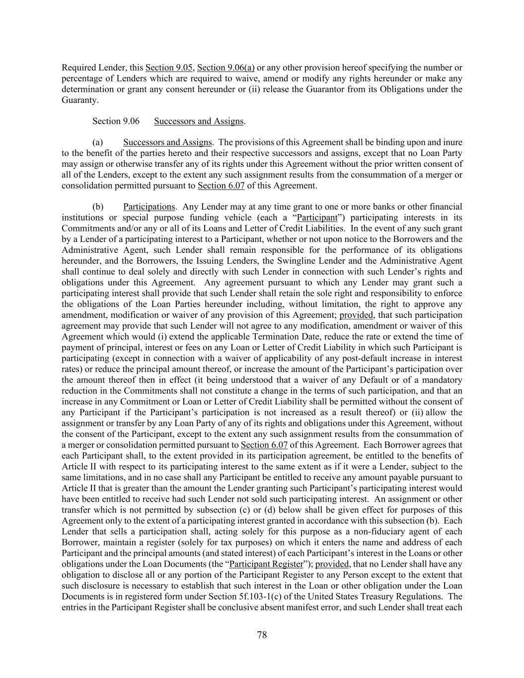 78 Required Lender, this Section 9.05, Section 9.06(a) or any other provision hereof specifying the number or percentage of Lenders which are required to waive, amend or modify any rights hereunder or make any determination or grant any consent hereunder or (ii) release the Guarantor from its Obligations under the Guaranty. Section 9.06 Successors and Assigns. (a) Successors and Assigns. The provisions of this Agreement shall be binding upon and inure to the benefit of the parties hereto and their respective successors and assigns, except that no Loan Party may assign or otherwise transfer any of its rights under this Agreement without the prior written consent of all of the Lenders, except to the extent any such assignment results from the consummation of a merger or consolidation permitted pursuant to Section 6.07 of this Agreement. (b) Participations. Any Lender may at any time grant to one or more banks or other financial institutions or special purpose funding vehicle (each a “Participant”) participating interests in its Commitments and/or any or all of its Loans and Letter of Credit Liabilities. In the event of any such grant by a Lender of a participating interest to a Participant, whether or not upon notice to the Borrowers and the Administrative Agent, such Lender shall remain responsible for the performance of its obligations hereunder, and the Borrowers, the Issuing Lenders, the Swingline Lender and the Administrative Agent shall continue to deal solely and directly with such Lender in connection with such Lender’s rights and obligations under this Agreement. Any agreement pursuant to which any Lender may grant such a participating interest shall provide that such Lender shall retain the sole right and responsibility to enforce the obligations of the Loan Parties hereunder including, without limitation, the right to approve any amendment, modification or waiver of any provision of this Agreement; provided, that such participation agreement may provide that such Lender will not agree to any modification, amendment or waiver of this Agreement which would (i) extend the applicable Termination Date, reduce the rate or extend the time of payment of principal, interest or fees on any Loan or Letter of Credit Liability in which such Participant is participating (except in connection with a waiver of applicability of any post-default increase in interest rates) or reduce the principal amount thereof, or increase the amount of the Participant’s participation over the amount thereof then in effect (it being understood that a waiver of any Default or of a mandatory reduction in the Commitments shall not constitute a change in the terms of such participation, and that an increase in any Commitment or Loan or Letter of Credit Liability shall be permitted without the consent of any Participant if the Participant’s participation is not increased as a result thereof) or (ii) allow the assignment or transfer by any Loan Party of any of its rights and obligations under this Agreement, without the consent of the Participant, except to the extent any such assignment results from the consummation of a merger or consolidation permitted pursuant to Section 6.07 of this Agreement. Each Borrower agrees that each Participant shall, to the extent provided in its participation agreement, be entitled to the benefits of Article II with respect to its participating interest to the same extent as if it were a Lender, subject to the same limitations, and in no case shall any Participant be entitled to receive any amount payable pursuant to Article II that is greater than the amount the Lender granting such Participant’s participating interest would have been entitled to receive had such Lender not sold such participating interest. An assignment or other transfer which is not permitted by subsection (c) or (d) below shall be given effect for purposes of this Agreement only to the extent of a participating interest granted in accordance with this subsection (b). Each Lender that sells a participation shall, acting solely for this purpose as a non-fiduciary agent of each Borrower, maintain a register (solely for tax purposes) on which it enters the name and address of each Participant and the principal amounts (and stated interest) of each Participant’s interest in the Loans or other obligations under the Loan Documents (the “Participant Register”); provided, that no Lender shall have any obligation to disclose all or any portion of the Participant Register to any Person except to the extent that such disclosure is necessary to establish that such interest in the Loan or other obligation under the Loan Documents is in registered form under Section 5f.103-1(c) of the United States Treasury Regulations. The entries in the Participant Register shall be conclusive absent manifest error, and such Lender shall treat each