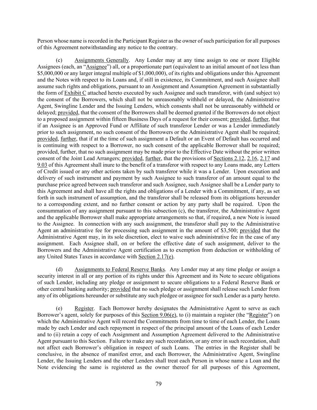 79 Person whose name is recorded in the Participant Register as the owner of such participation for all purposes of this Agreement notwithstanding any notice to the contrary. (c) Assignments Generally. Any Lender may at any time assign to one or more Eligible Assignees (each, an “Assignee”) all, or a proportionate part (equivalent to an initial amount of not less than $5,000,000 or any larger integral multiple of $1,000,000), of its rights and obligations under this Agreement and the Notes with respect to its Loans and, if still in existence, its Commitment, and such Assignee shall assume such rights and obligations, pursuant to an Assignment and Assumption Agreement in substantially the form of Exhibit C attached hereto executed by such Assignee and such transferor, with (and subject to) the consent of the Borrowers, which shall not be unreasonably withheld or delayed, the Administrative Agent, Swingline Lender and the Issuing Lenders, which consents shall not be unreasonably withheld or delayed; provided, that the consent of the Borrowers shall be deemed granted if the Borrowers do not object to a proposed assignment within fifteen Business Days of a request for their consent; provided, further, that if an Assignee is an Approved Fund or Affiliate of such transferor Lender or was a Lender immediately prior to such assignment, no such consent of the Borrowers or the Administrative Agent shall be required; provided, further, that if at the time of such assignment a Default or an Event of Default has occurred and is continuing with respect to a Borrower, no such consent of the applicable Borrower shall be required; provided, further, that no such assignment may be made prior to the Effective Date without the prior written consent of the Joint Lead Arrangers; provided, further, that the provisions of Sections 2.12, 2.16, 2.17 and 9.03 of this Agreement shall inure to the benefit of a transferor with respect to any Loans made, any Letters of Credit issued or any other actions taken by such transferor while it was a Lender. Upon execution and delivery of such instrument and payment by such Assignee to such transferor of an amount equal to the purchase price agreed between such transferor and such Assignee, such Assignee shall be a Lender party to this Agreement and shall have all the rights and obligations of a Lender with a Commitment, if any, as set forth in such instrument of assumption, and the transferor shall be released from its obligations hereunder to a corresponding extent, and no further consent or action by any party shall be required. Upon the consummation of any assignment pursuant to this subsection (c), the transferor, the Administrative Agent and the applicable Borrower shall make appropriate arrangements so that, if required, a new Note is issued to the Assignee. In connection with any such assignment, the transferor shall pay to the Administrative Agent an administrative fee for processing such assignment in the amount of $3,500; provided that the Administrative Agent may, in its sole discretion, elect to waive such administrative fee in the case of any assignment. Each Assignee shall, on or before the effective date of such assignment, deliver to the Borrowers and the Administrative Agent certification as to exemption from deduction or withholding of any United States Taxes in accordance with Section 2.17(e). (d) Assignments to Federal Reserve Banks. Any Lender may at any time pledge or assign a security interest in all or any portion of its rights under this Agreement and its Note to secure obligations of such Lender, including any pledge or assignment to secure obligations to a Federal Reserve Bank or other central banking authority; provided that no such pledge or assignment shall release such Lender from any of its obligations hereunder or substitute any such pledgee or assignee for such Lender as a party hereto. (e) Register. Each Borrower hereby designates the Administrative Agent to serve as each Borrower’s agent, solely for purposes of this Section 9.06(e), to (i) maintain a register (the “Register”) on which the Administrative Agent will record the Commitments from time to time of each Lender, the Loans made by each Lender and each repayment in respect of the principal amount of the Loans of each Lender and to (ii) retain a copy of each Assignment and Assumption Agreement delivered to the Administrative Agent pursuant to this Section. Failure to make any such recordation, or any error in such recordation, shall not affect each Borrower’s obligation in respect of such Loans. The entries in the Register shall be conclusive, in the absence of manifest error, and each Borrower, the Administrative Agent, Swingline Lender, the Issuing Lenders and the other Lenders shall treat each Person in whose name a Loan and the Note evidencing the same is registered as the owner thereof for all purposes of this Agreement,