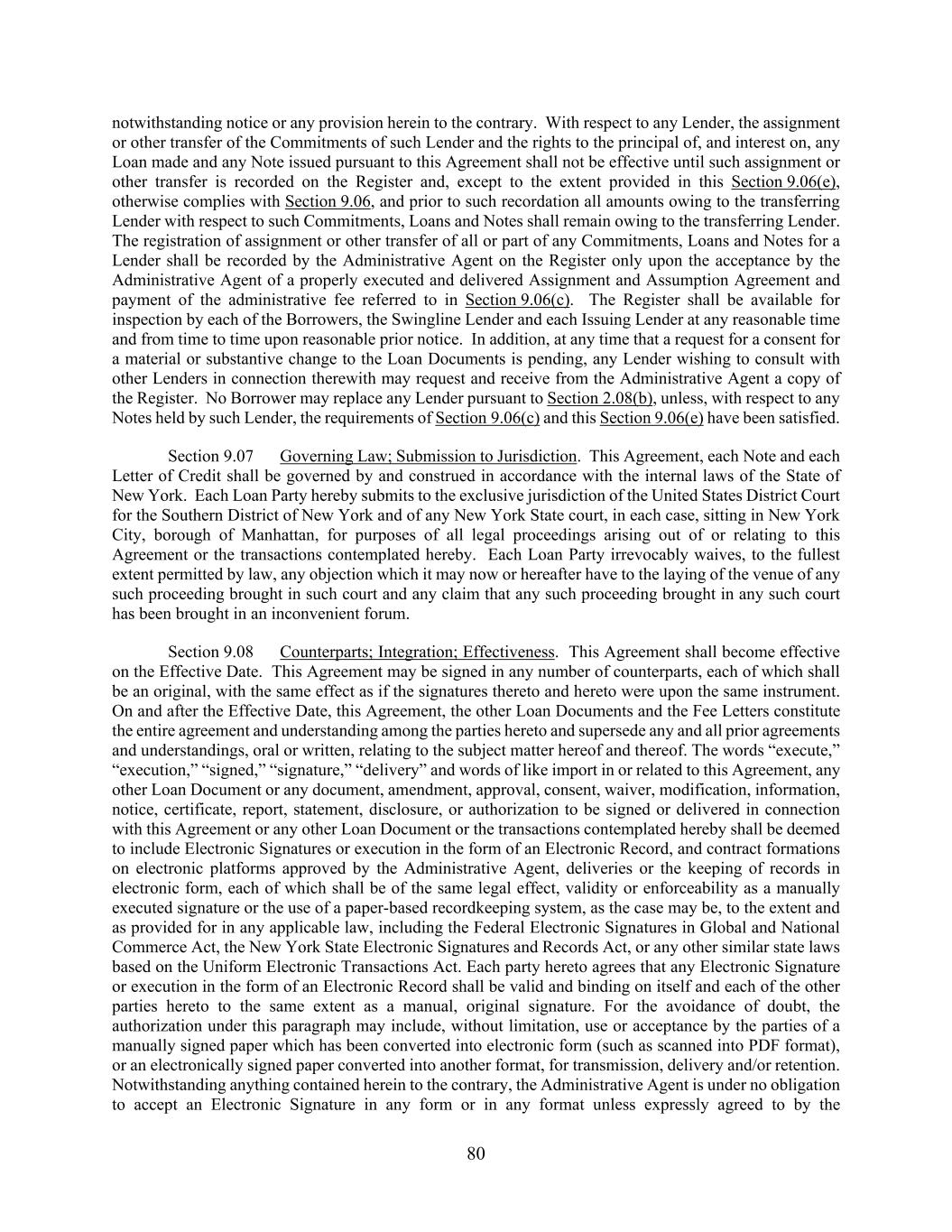 80 notwithstanding notice or any provision herein to the contrary. With respect to any Lender, the assignment or other transfer of the Commitments of such Lender and the rights to the principal of, and interest on, any Loan made and any Note issued pursuant to this Agreement shall not be effective until such assignment or other transfer is recorded on the Register and, except to the extent provided in this Section 9.06(e), otherwise complies with Section 9.06, and prior to such recordation all amounts owing to the transferring Lender with respect to such Commitments, Loans and Notes shall remain owing to the transferring Lender. The registration of assignment or other transfer of all or part of any Commitments, Loans and Notes for a Lender shall be recorded by the Administrative Agent on the Register only upon the acceptance by the Administrative Agent of a properly executed and delivered Assignment and Assumption Agreement and payment of the administrative fee referred to in Section 9.06(c). The Register shall be available for inspection by each of the Borrowers, the Swingline Lender and each Issuing Lender at any reasonable time and from time to time upon reasonable prior notice. In addition, at any time that a request for a consent for a material or substantive change to the Loan Documents is pending, any Lender wishing to consult with other Lenders in connection therewith may request and receive from the Administrative Agent a copy of the Register. No Borrower may replace any Lender pursuant to Section 2.08(b), unless, with respect to any Notes held by such Lender, the requirements of Section 9.06(c) and this Section 9.06(e) have been satisfied. Section 9.07 Governing Law; Submission to Jurisdiction. This Agreement, each Note and each Letter of Credit shall be governed by and construed in accordance with the internal laws of the State of New York. Each Loan Party hereby submits to the exclusive jurisdiction of the United States District Court for the Southern District of New York and of any New York State court, in each case, sitting in New York City, borough of Manhattan, for purposes of all legal proceedings arising out of or relating to this Agreement or the transactions contemplated hereby. Each Loan Party irrevocably waives, to the fullest extent permitted by law, any objection which it may now or hereafter have to the laying of the venue of any such proceeding brought in such court and any claim that any such proceeding brought in any such court has been brought in an inconvenient forum. Section 9.08 Counterparts; Integration; Effectiveness. This Agreement shall become effective on the Effective Date. This Agreement may be signed in any number of counterparts, each of which shall be an original, with the same effect as if the signatures thereto and hereto were upon the same instrument. On and after the Effective Date, this Agreement, the other Loan Documents and the Fee Letters constitute the entire agreement and understanding among the parties hereto and supersede any and all prior agreements and understandings, oral or written, relating to the subject matter hereof and thereof. The words “execute,” “execution,” “signed,” “signature,” “delivery” and words of like import in or related to this Agreement, any other Loan Document or any document, amendment, approval, consent, waiver, modification, information, notice, certificate, report, statement, disclosure, or authorization to be signed or delivered in connection with this Agreement or any other Loan Document or the transactions contemplated hereby shall be deemed to include Electronic Signatures or execution in the form of an Electronic Record, and contract formations on electronic platforms approved by the Administrative Agent, deliveries or the keeping of records in electronic form, each of which shall be of the same legal effect, validity or enforceability as a manually executed signature or the use of a paper-based recordkeeping system, as the case may be, to the extent and as provided for in any applicable law, including the Federal Electronic Signatures in Global and National Commerce Act, the New York State Electronic Signatures and Records Act, or any other similar state laws based on the Uniform Electronic Transactions Act. Each party hereto agrees that any Electronic Signature or execution in the form of an Electronic Record shall be valid and binding on itself and each of the other parties hereto to the same extent as a manual, original signature. For the avoidance of doubt, the authorization under this paragraph may include, without limitation, use or acceptance by the parties of a manually signed paper which has been converted into electronic form (such as scanned into PDF format), or an electronically signed paper converted into another format, for transmission, delivery and/or retention. Notwithstanding anything contained herein to the contrary, the Administrative Agent is under no obligation to accept an Electronic Signature in any form or in any format unless expressly agreed to by the