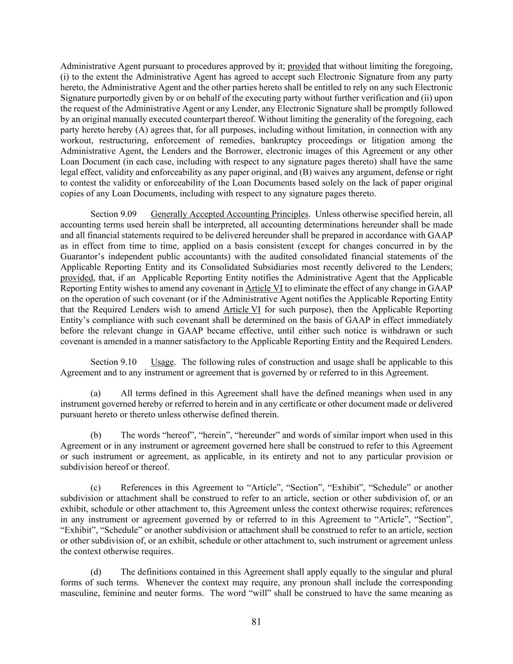 81 Administrative Agent pursuant to procedures approved by it; provided that without limiting the foregoing, (i) to the extent the Administrative Agent has agreed to accept such Electronic Signature from any party hereto, the Administrative Agent and the other parties hereto shall be entitled to rely on any such Electronic Signature purportedly given by or on behalf of the executing party without further verification and (ii) upon the request of the Administrative Agent or any Lender, any Electronic Signature shall be promptly followed by an original manually executed counterpart thereof. Without limiting the generality of the foregoing, each party hereto hereby (A) agrees that, for all purposes, including without limitation, in connection with any workout, restructuring, enforcement of remedies, bankruptcy proceedings or litigation among the Administrative Agent, the Lenders and the Borrower, electronic images of this Agreement or any other Loan Document (in each case, including with respect to any signature pages thereto) shall have the same legal effect, validity and enforceability as any paper original, and (B) waives any argument, defense or right to contest the validity or enforceability of the Loan Documents based solely on the lack of paper original copies of any Loan Documents, including with respect to any signature pages thereto. Section 9.09 Generally Accepted Accounting Principles. Unless otherwise specified herein, all accounting terms used herein shall be interpreted, all accounting determinations hereunder shall be made and all financial statements required to be delivered hereunder shall be prepared in accordance with GAAP as in effect from time to time, applied on a basis consistent (except for changes concurred in by the Guarantor’s independent public accountants) with the audited consolidated financial statements of the Applicable Reporting Entity and its Consolidated Subsidiaries most recently delivered to the Lenders; provided, that, if an Applicable Reporting Entity notifies the Administrative Agent that the Applicable Reporting Entity wishes to amend any covenant in Article VI to eliminate the effect of any change in GAAP on the operation of such covenant (or if the Administrative Agent notifies the Applicable Reporting Entity that the Required Lenders wish to amend Article VI for such purpose), then the Applicable Reporting Entity’s compliance with such covenant shall be determined on the basis of GAAP in effect immediately before the relevant change in GAAP became effective, until either such notice is withdrawn or such covenant is amended in a manner satisfactory to the Applicable Reporting Entity and the Required Lenders. Section 9.10 Usage. The following rules of construction and usage shall be applicable to this Agreement and to any instrument or agreement that is governed by or referred to in this Agreement. (a) All terms defined in this Agreement shall have the defined meanings when used in any instrument governed hereby or referred to herein and in any certificate or other document made or delivered pursuant hereto or thereto unless otherwise defined therein. (b) The words “hereof”, “herein”, “hereunder” and words of similar import when used in this Agreement or in any instrument or agreement governed here shall be construed to refer to this Agreement or such instrument or agreement, as applicable, in its entirety and not to any particular provision or subdivision hereof or thereof. (c) References in this Agreement to “Article”, “Section”, “Exhibit”, “Schedule” or another subdivision or attachment shall be construed to refer to an article, section or other subdivision of, or an exhibit, schedule or other attachment to, this Agreement unless the context otherwise requires; references in any instrument or agreement governed by or referred to in this Agreement to “Article”, “Section”, “Exhibit”, “Schedule” or another subdivision or attachment shall be construed to refer to an article, section or other subdivision of, or an exhibit, schedule or other attachment to, such instrument or agreement unless the context otherwise requires. (d) The definitions contained in this Agreement shall apply equally to the singular and plural forms of such terms. Whenever the context may require, any pronoun shall include the corresponding masculine, feminine and neuter forms. The word “will” shall be construed to have the same meaning as