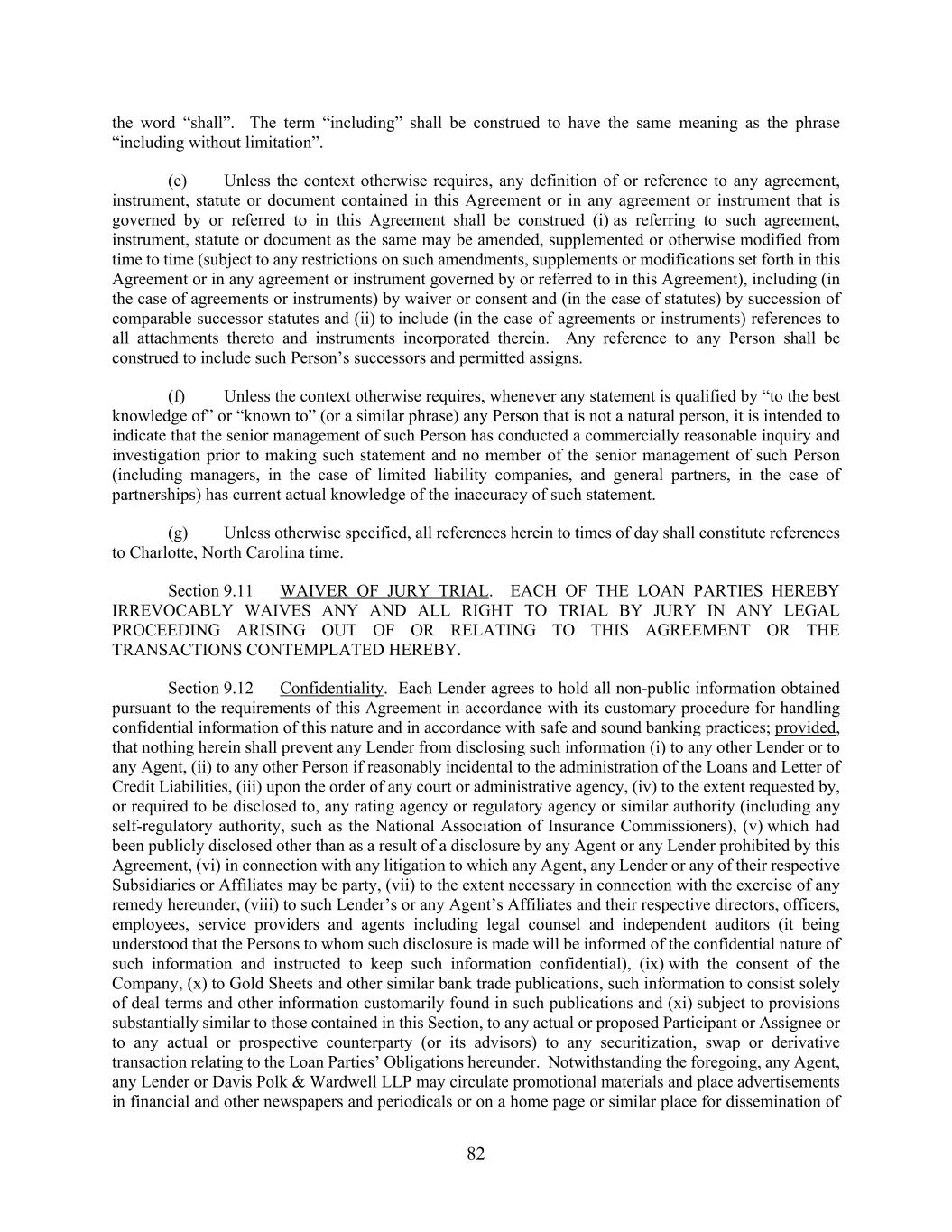 82 the word “shall”. The term “including” shall be construed to have the same meaning as the phrase “including without limitation”. (e) Unless the context otherwise requires, any definition of or reference to any agreement, instrument, statute or document contained in this Agreement or in any agreement or instrument that is governed by or referred to in this Agreement shall be construed (i) as referring to such agreement, instrument, statute or document as the same may be amended, supplemented or otherwise modified from time to time (subject to any restrictions on such amendments, supplements or modifications set forth in this Agreement or in any agreement or instrument governed by or referred to in this Agreement), including (in the case of agreements or instruments) by waiver or consent and (in the case of statutes) by succession of comparable successor statutes and (ii) to include (in the case of agreements or instruments) references to all attachments thereto and instruments incorporated therein. Any reference to any Person shall be construed to include such Person’s successors and permitted assigns. (f) Unless the context otherwise requires, whenever any statement is qualified by “to the best knowledge of” or “known to” (or a similar phrase) any Person that is not a natural person, it is intended to indicate that the senior management of such Person has conducted a commercially reasonable inquiry and investigation prior to making such statement and no member of the senior management of such Person (including managers, in the case of limited liability companies, and general partners, in the case of partnerships) has current actual knowledge of the inaccuracy of such statement. (g) Unless otherwise specified, all references herein to times of day shall constitute references to Charlotte, North Carolina time. Section 9.11 WAIVER OF JURY TRIAL. EACH OF THE LOAN PARTIES HEREBY IRREVOCABLY WAIVES ANY AND ALL RIGHT TO TRIAL BY JURY IN ANY LEGAL PROCEEDING ARISING OUT OF OR RELATING TO THIS AGREEMENT OR THE TRANSACTIONS CONTEMPLATED HEREBY. Section 9.12 Confidentiality. Each Lender agrees to hold all non-public information obtained pursuant to the requirements of this Agreement in accordance with its customary procedure for handling confidential information of this nature and in accordance with safe and sound banking practices; provided, that nothing herein shall prevent any Lender from disclosing such information (i) to any other Lender or to any Agent, (ii) to any other Person if reasonably incidental to the administration of the Loans and Letter of Credit Liabilities, (iii) upon the order of any court or administrative agency, (iv) to the extent requested by, or required to be disclosed to, any rating agency or regulatory agency or similar authority (including any self-regulatory authority, such as the National Association of Insurance Commissioners), (v) which had been publicly disclosed other than as a result of a disclosure by any Agent or any Lender prohibited by this Agreement, (vi) in connection with any litigation to which any Agent, any Lender or any of their respective Subsidiaries or Affiliates may be party, (vii) to the extent necessary in connection with the exercise of any remedy hereunder, (viii) to such Lender’s or any Agent’s Affiliates and their respective directors, officers, employees, service providers and agents including legal counsel and independent auditors (it being understood that the Persons to whom such disclosure is made will be informed of the confidential nature of such information and instructed to keep such information confidential), (ix) with the consent of the Company, (x) to Gold Sheets and other similar bank trade publications, such information to consist solely of deal terms and other information customarily found in such publications and (xi) subject to provisions substantially similar to those contained in this Section, to any actual or proposed Participant or Assignee or to any actual or prospective counterparty (or its advisors) to any securitization, swap or derivative transaction relating to the Loan Parties’ Obligations hereunder. Notwithstanding the foregoing, any Agent, any Lender or Davis Polk & Wardwell LLP may circulate promotional materials and place advertisements in financial and other newspapers and periodicals or on a home page or similar place for dissemination of