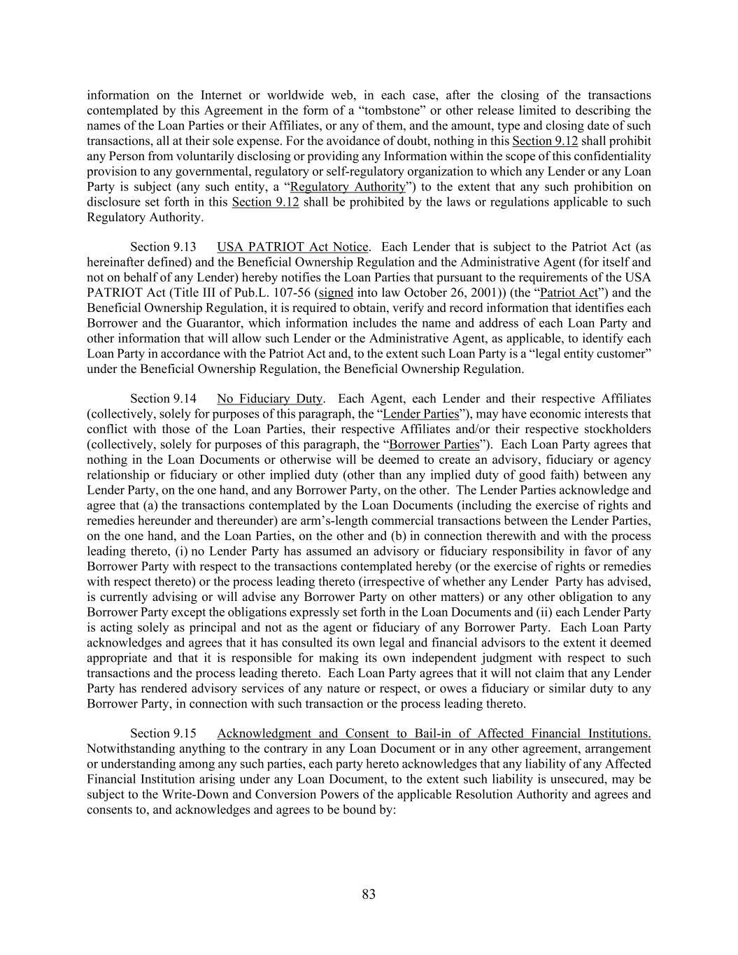 83 information on the Internet or worldwide web, in each case, after the closing of the transactions contemplated by this Agreement in the form of a “tombstone” or other release limited to describing the names of the Loan Parties or their Affiliates, or any of them, and the amount, type and closing date of such transactions, all at their sole expense. For the avoidance of doubt, nothing in this Section 9.12 shall prohibit any Person from voluntarily disclosing or providing any Information within the scope of this confidentiality provision to any governmental, regulatory or self-regulatory organization to which any Lender or any Loan Party is subject (any such entity, a “Regulatory Authority”) to the extent that any such prohibition on disclosure set forth in this Section 9.12 shall be prohibited by the laws or regulations applicable to such Regulatory Authority. Section 9.13 USA PATRIOT Act Notice. Each Lender that is subject to the Patriot Act (as hereinafter defined) and the Beneficial Ownership Regulation and the Administrative Agent (for itself and not on behalf of any Lender) hereby notifies the Loan Parties that pursuant to the requirements of the USA PATRIOT Act (Title III of Pub.L. 107-56 (signed into law October 26, 2001)) (the “Patriot Act”) and the Beneficial Ownership Regulation, it is required to obtain, verify and record information that identifies each Borrower and the Guarantor, which information includes the name and address of each Loan Party and other information that will allow such Lender or the Administrative Agent, as applicable, to identify each Loan Party in accordance with the Patriot Act and, to the extent such Loan Party is a “legal entity customer” under the Beneficial Ownership Regulation, the Beneficial Ownership Regulation. Section 9.14 No Fiduciary Duty. Each Agent, each Lender and their respective Affiliates (collectively, solely for purposes of this paragraph, the “Lender Parties”), may have economic interests that conflict with those of the Loan Parties, their respective Affiliates and/or their respective stockholders (collectively, solely for purposes of this paragraph, the “Borrower Parties”). Each Loan Party agrees that nothing in the Loan Documents or otherwise will be deemed to create an advisory, fiduciary or agency relationship or fiduciary or other implied duty (other than any implied duty of good faith) between any Lender Party, on the one hand, and any Borrower Party, on the other. The Lender Parties acknowledge and agree that (a) the transactions contemplated by the Loan Documents (including the exercise of rights and remedies hereunder and thereunder) are arm’s-length commercial transactions between the Lender Parties, on the one hand, and the Loan Parties, on the other and (b) in connection therewith and with the process leading thereto, (i) no Lender Party has assumed an advisory or fiduciary responsibility in favor of any Borrower Party with respect to the transactions contemplated hereby (or the exercise of rights or remedies with respect thereto) or the process leading thereto (irrespective of whether any Lender Party has advised, is currently advising or will advise any Borrower Party on other matters) or any other obligation to any Borrower Party except the obligations expressly set forth in the Loan Documents and (ii) each Lender Party is acting solely as principal and not as the agent or fiduciary of any Borrower Party. Each Loan Party acknowledges and agrees that it has consulted its own legal and financial advisors to the extent it deemed appropriate and that it is responsible for making its own independent judgment with respect to such transactions and the process leading thereto. Each Loan Party agrees that it will not claim that any Lender Party has rendered advisory services of any nature or respect, or owes a fiduciary or similar duty to any Borrower Party, in connection with such transaction or the process leading thereto. Section 9.15 Acknowledgment and Consent to Bail-in of Affected Financial Institutions. Notwithstanding anything to the contrary in any Loan Document or in any other agreement, arrangement or understanding among any such parties, each party hereto acknowledges that any liability of any Affected Financial Institution arising under any Loan Document, to the extent such liability is unsecured, may be subject to the Write-Down and Conversion Powers of the applicable Resolution Authority and agrees and consents to, and acknowledges and agrees to be bound by: